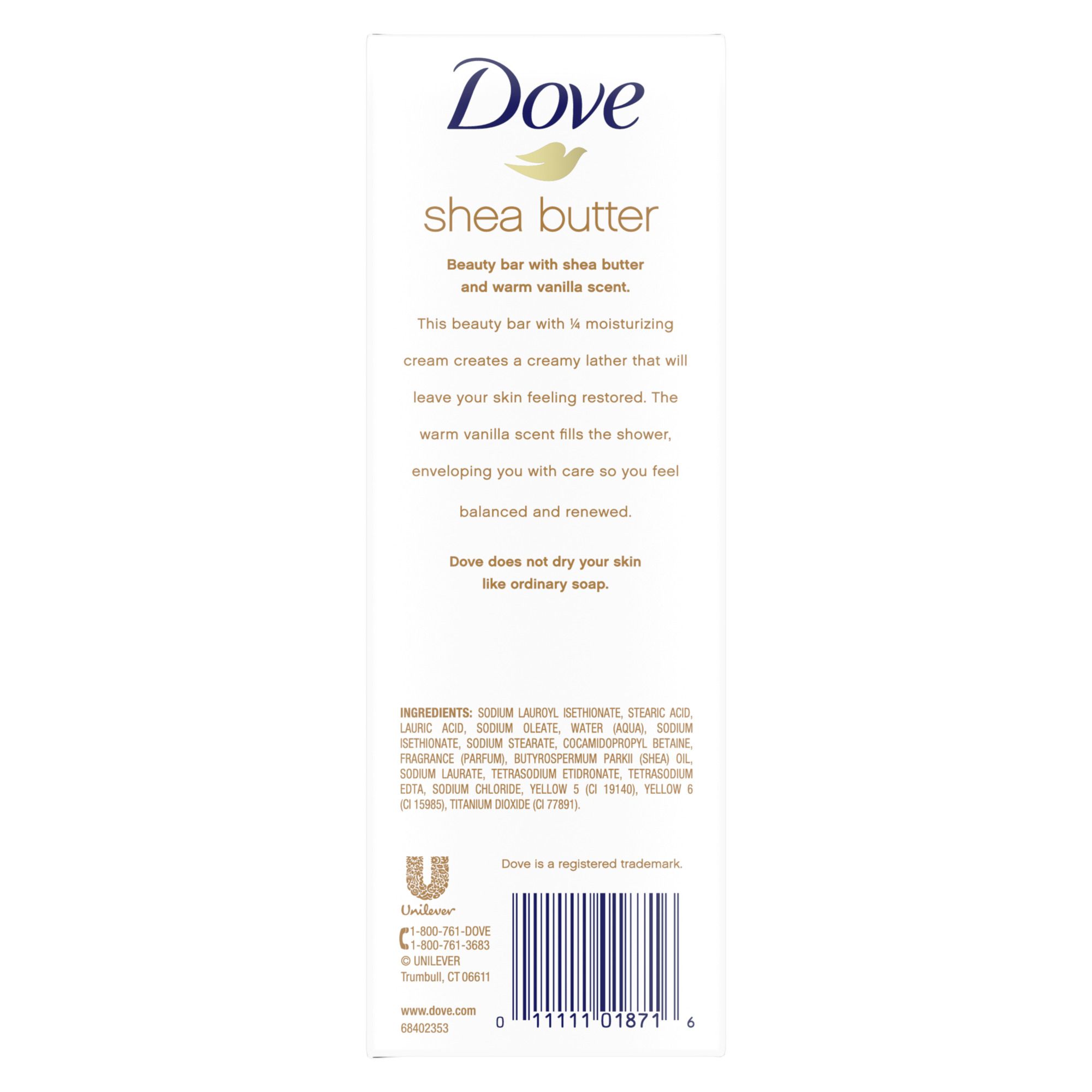 Dove Purely Pampering Shea Butter Beauty Bar is a moisturizing, gentle cleanser that has the warm, comforting scents of shea butter and vanilla Dove Beauty Bar is the #1 dermatologist recommended beauty bar in the U.S. With ¼ moisturizing cream, Dove Beauty Bar helps your skin maintain its natural moisture barrier and keep skin hydrated Dove Beauty Bar leaves skin feeling softer and smoother and looking more radiant when compared with ordinary bars of soap A gentle cleanser, Dove Beauty Bar doesn’t dry skin out like soap bars It's not a bar of soap; it's a Beauty Bar