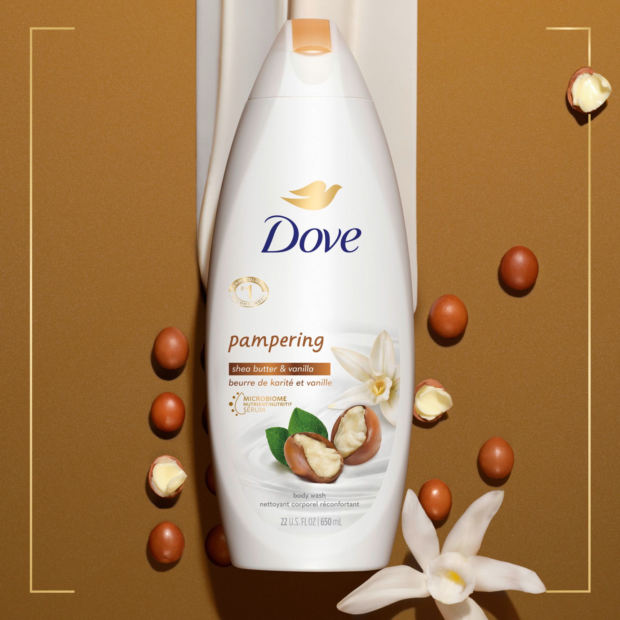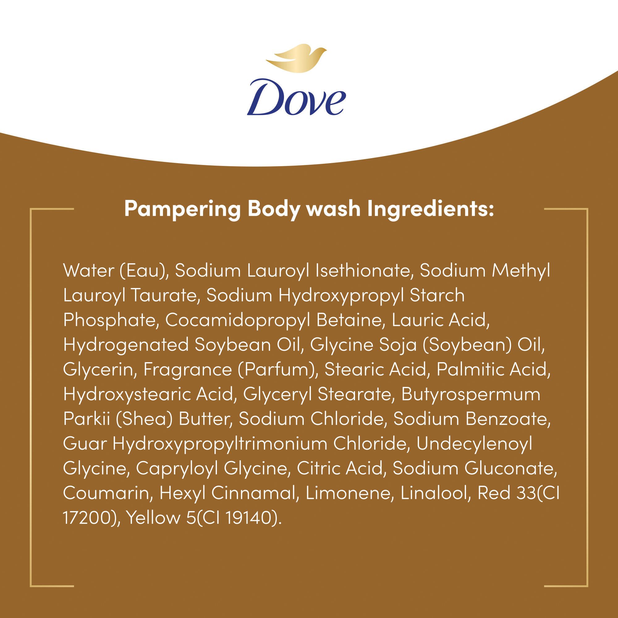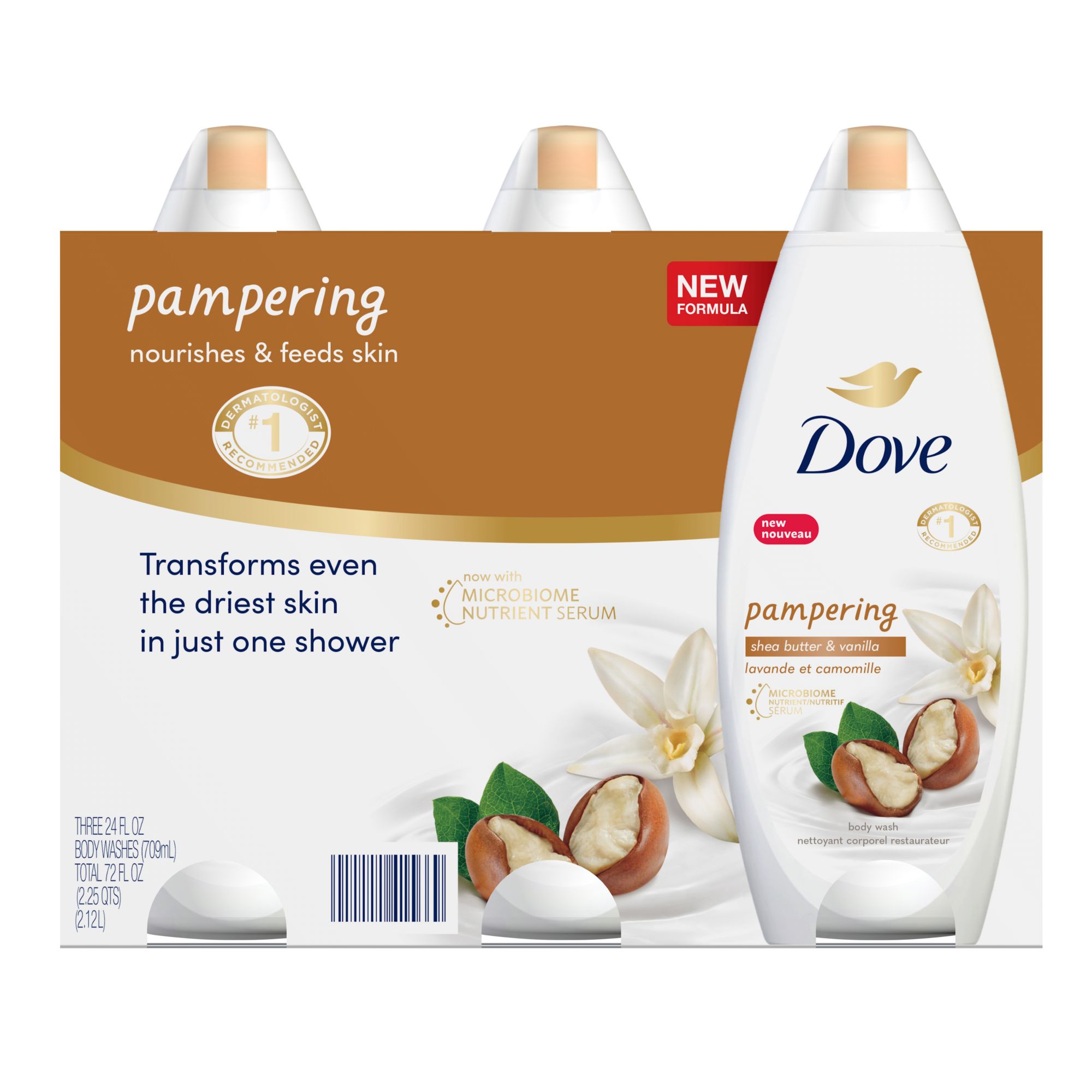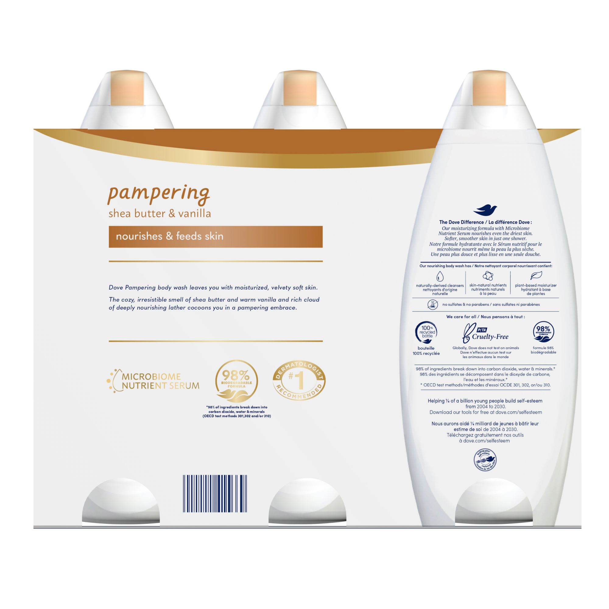 Dove pampering body wash nourishes and pampers skin in just one shower Body wash for dry skin, made with microbiome nutrient serum to help strengthen skin’s natural moisture barrier Pampering body wash with 98% biodegradable formula* Sulfate free body wash packaged in 100% recycled plastic bottle Nourishing body wash with shea butter and warm vanilla scent that works to moisturize skin Moisturizing body wash from the #1 dermatologist recommended body wash brand *98% of ingredients break down into carbon dioxide, water & minerals (OECD test methods 301,302 and/or 310) Includes Dove pampering body wash 3 pk.