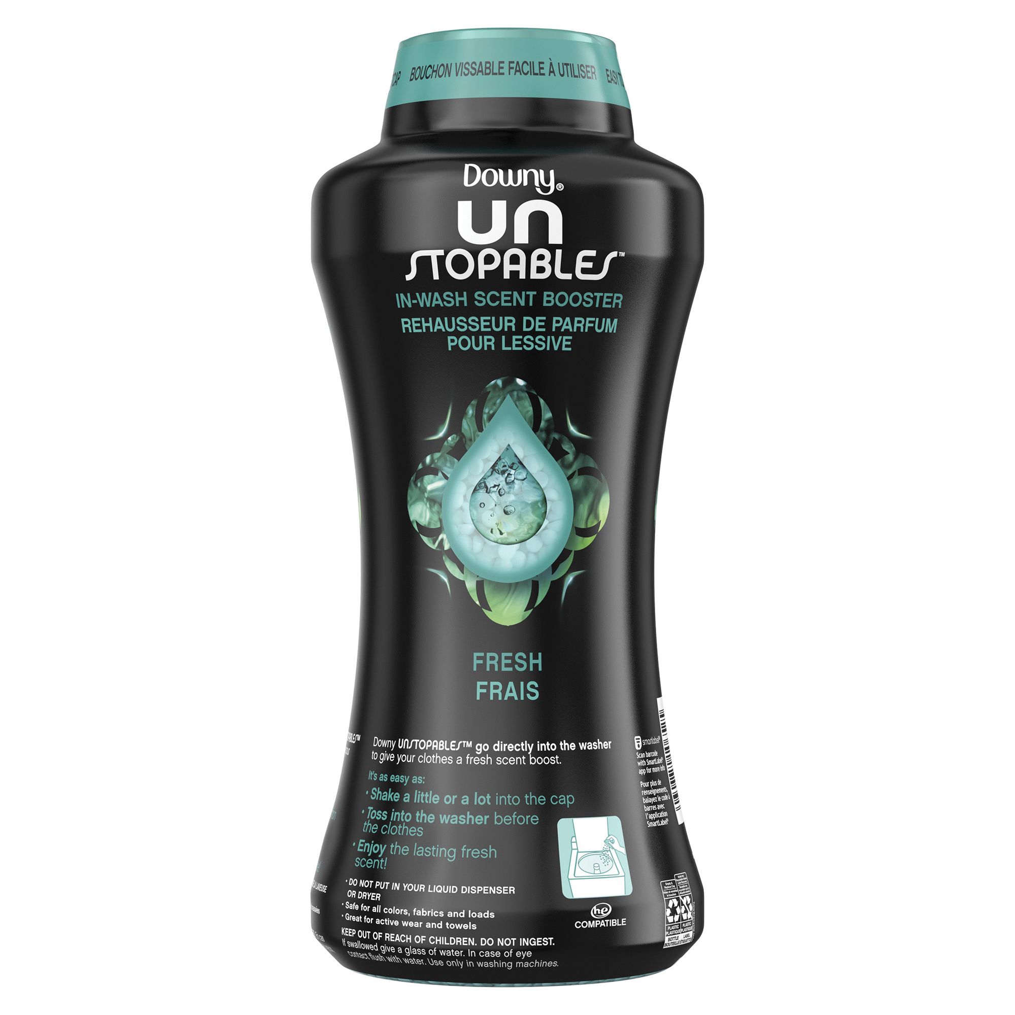 Downy Unstopables FRESH in-wash scent booster beads are small laundry scent beads that work inside your washing machine, giving your laundry up to 12 weeks of freshness.* Before adding clothes, simply shake as many Downy Unstopables scent beads as desired into the cap, and then toss into the washer drum. Use scent booster beads along with your laundry detergent and fabric softener for long-lasting freshness. Add to each load of laundry for fresh, delightful-smelling clothes, sheets, and towels. It’s a fresh too feisty to quit.