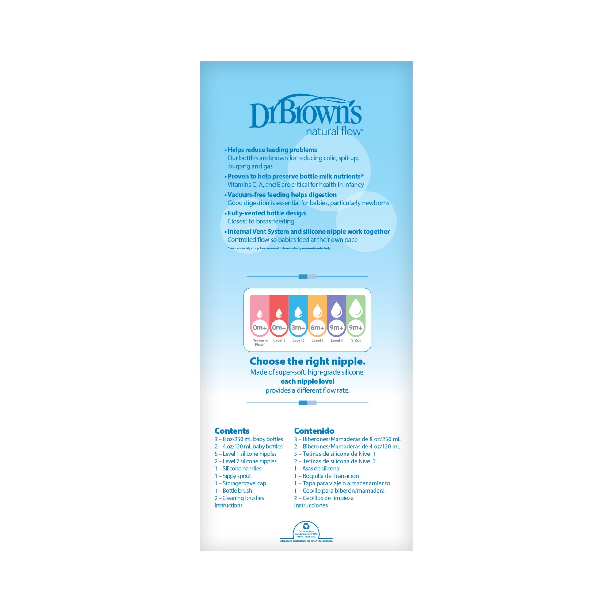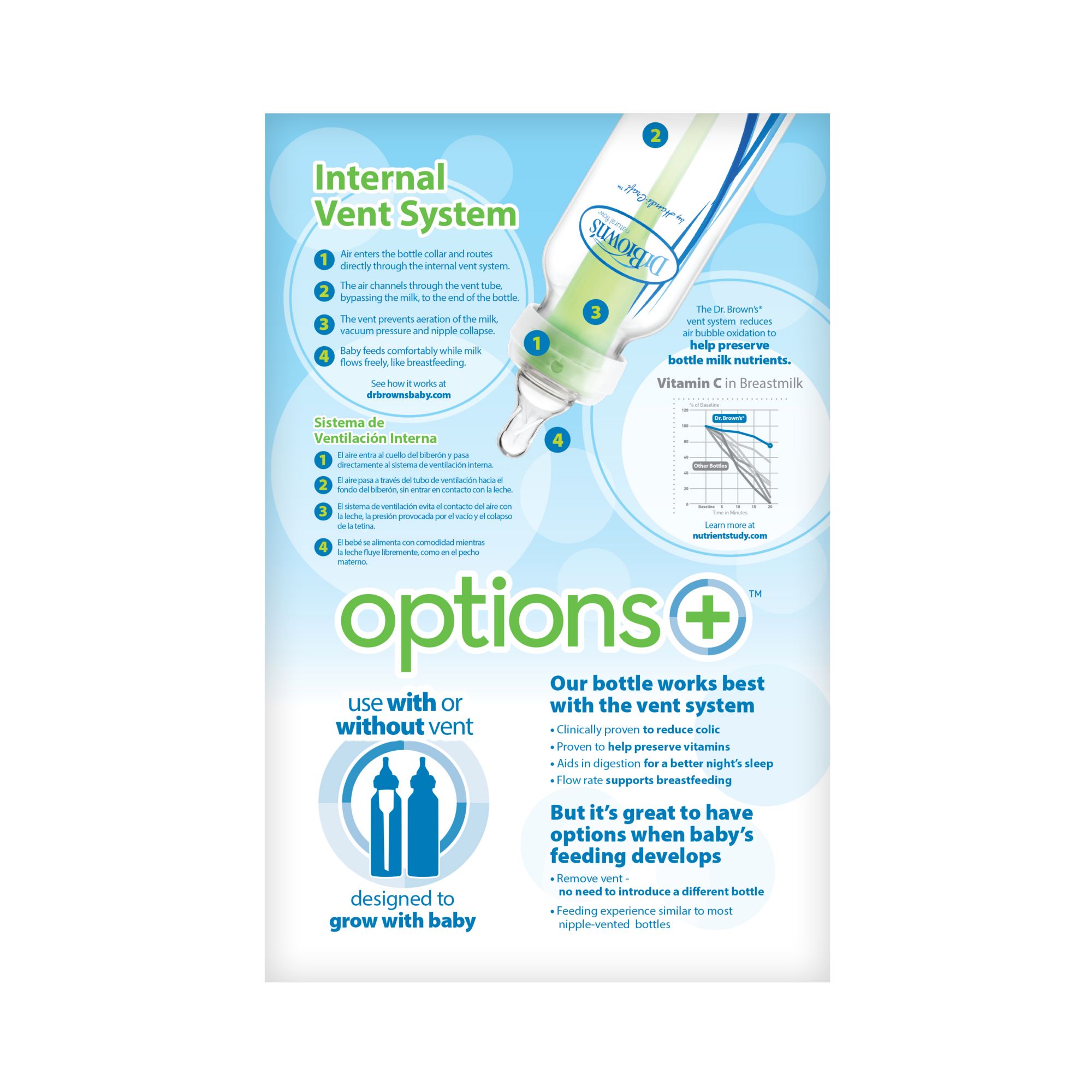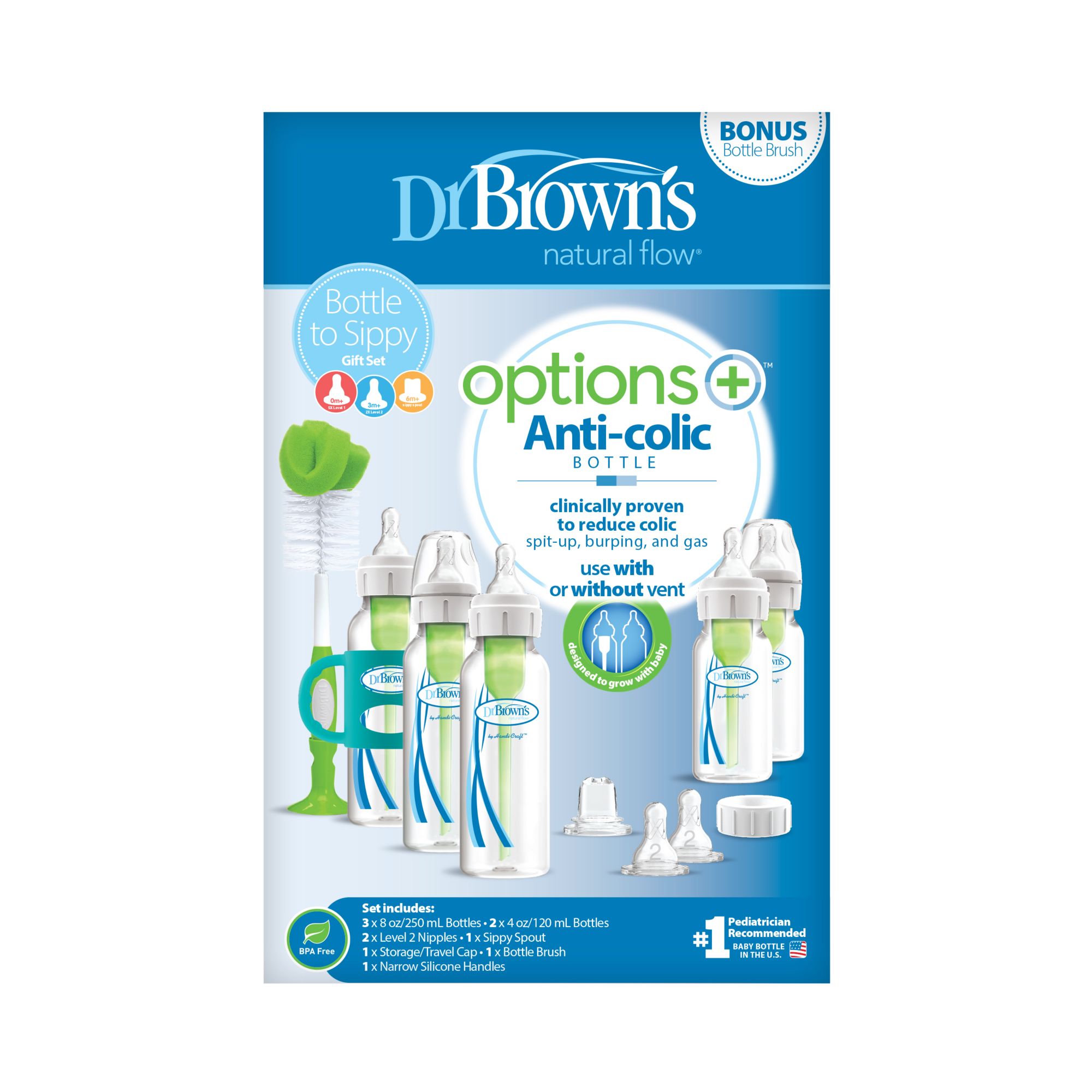 From newborn to new sippy skills, the Dr. Brown’s Options+ Grow With Me Gift Set grows with baby Dr. Brown’s award-winning baby bottles feature an internal vent system that is clinically proven to reduce colic, decreases spit-up, burping, and gas, and better preserves nutrients in breast milk and formula With two nipple levels included, this bottle set grows with baby Take baby steps to new sippy skills with the included soft sippy spout and soft silicone handles for easy grip Make bottle storage and travel easy with the Storage Travel Caps. Dishwasher (top rack) and sterilizer safe. BPA free
