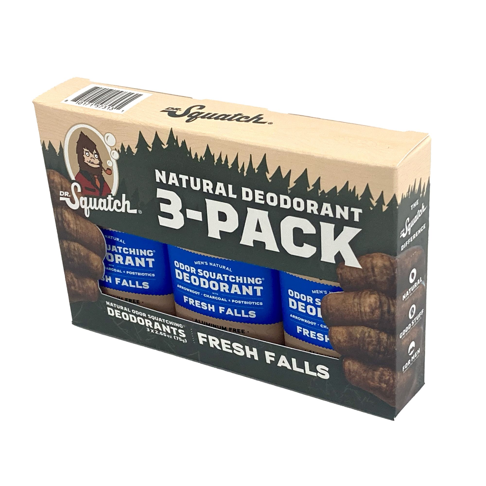 Give B.O. the boot with Fresh Falls Multipack Deodorant Sticc. Squatch odors with the powerful protection of Dr. Squatch Natural Deodorant. Their Odor-Squatching formula attacks stink at the source with ingredients like Arrowroot, Charcoal, and Postbiotics for all-day freshness and confidence.