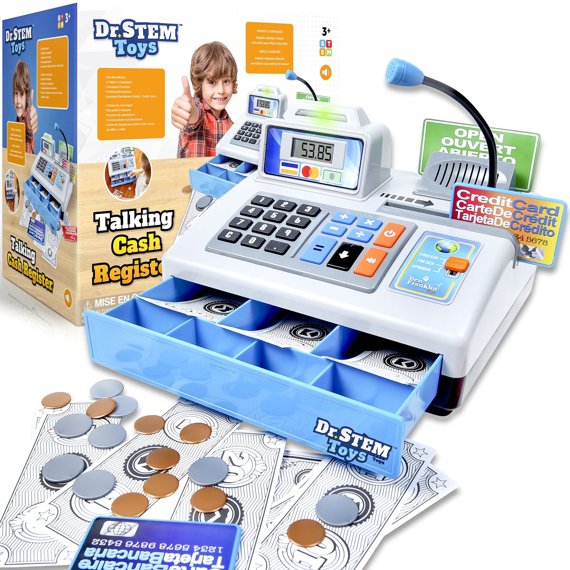 Talking, interactive cash register with three built in languages: English, French and Spanish. Kids learn about money while they are having fun. Holds life size money so it's great for schools, bake sales, or just hours of fun at home.