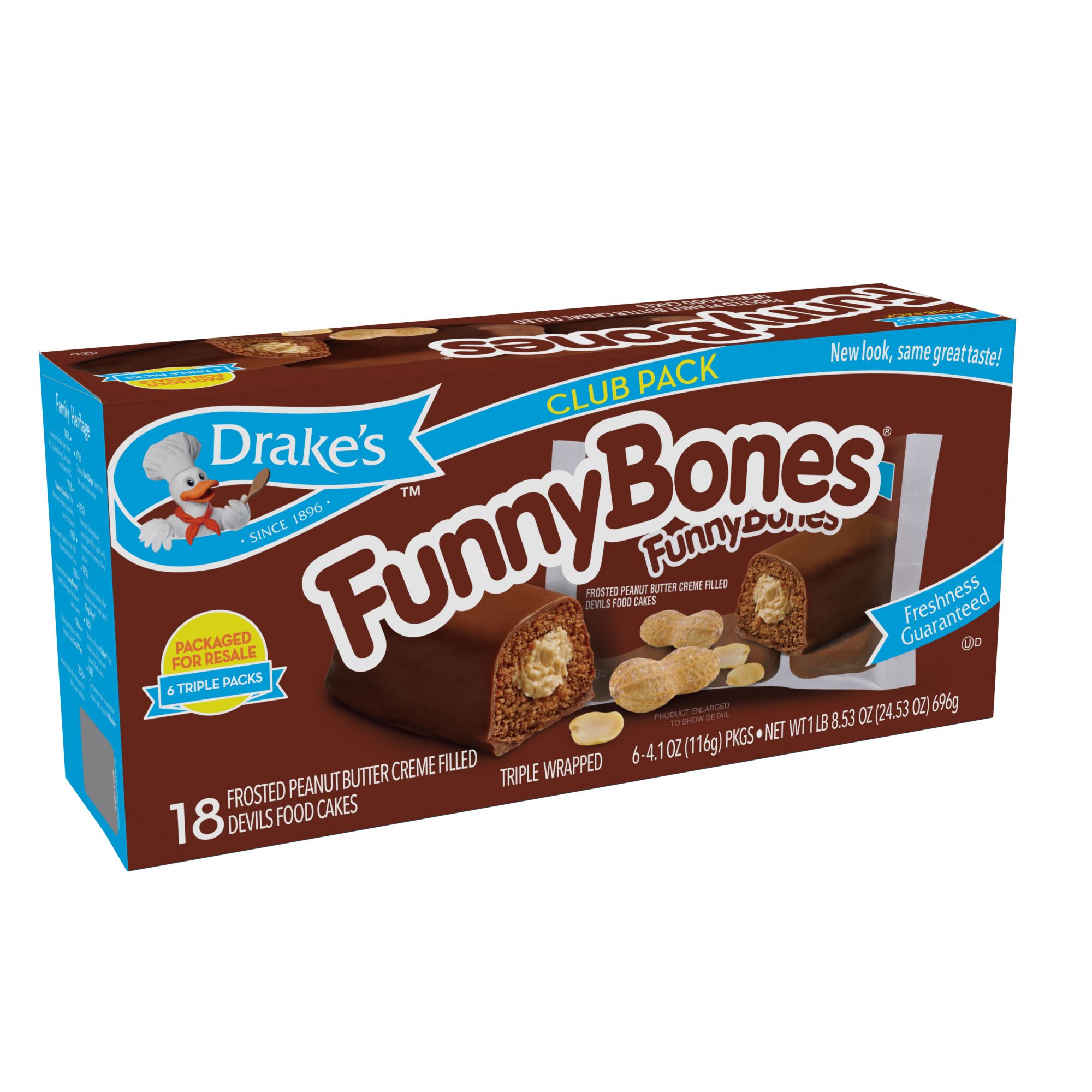 Funny Bones are a classic Drake's variety, first introduced in 1961. Each devil's food cake is filled with rich peanut butter creme and enrobed with a milk chocolate-flavored icing.