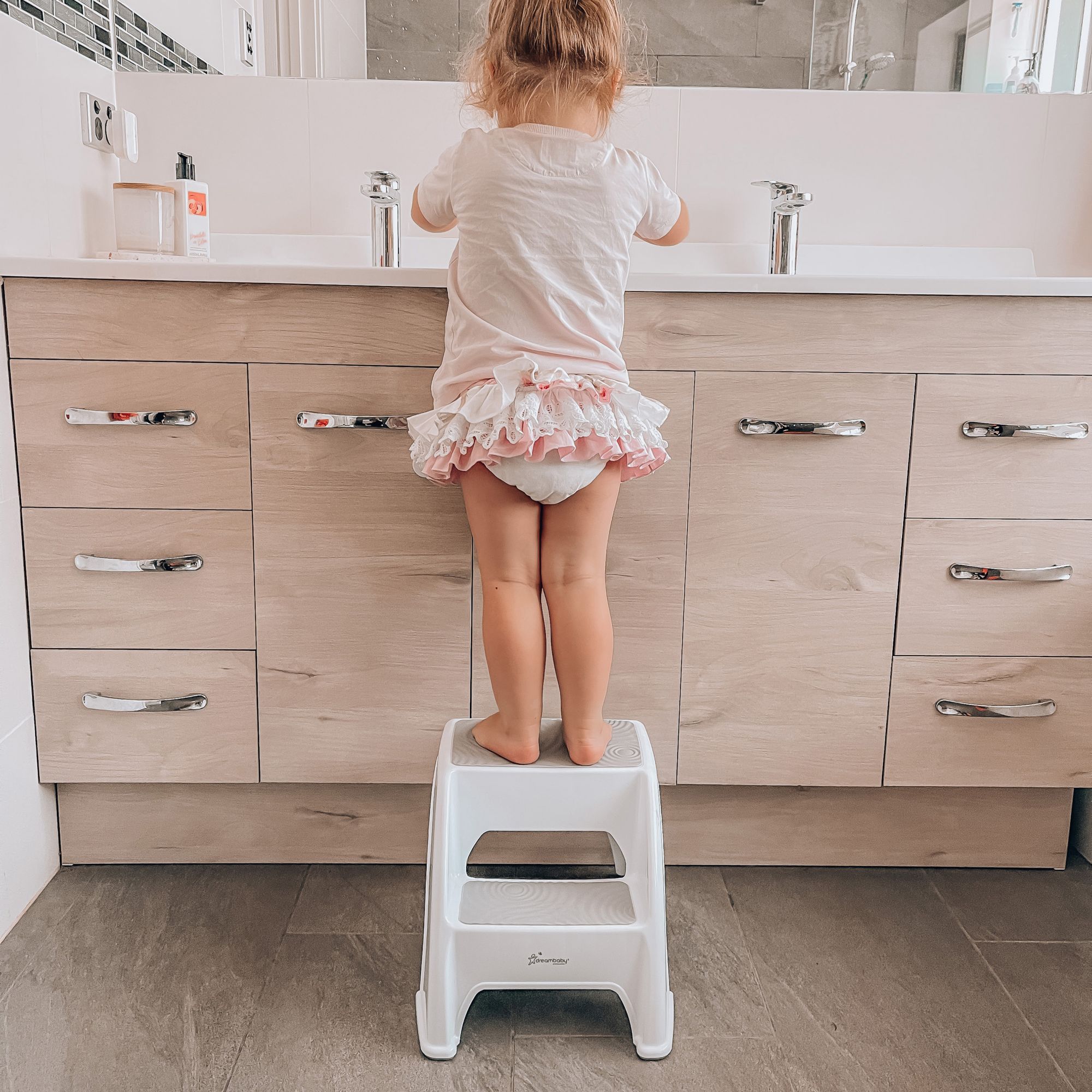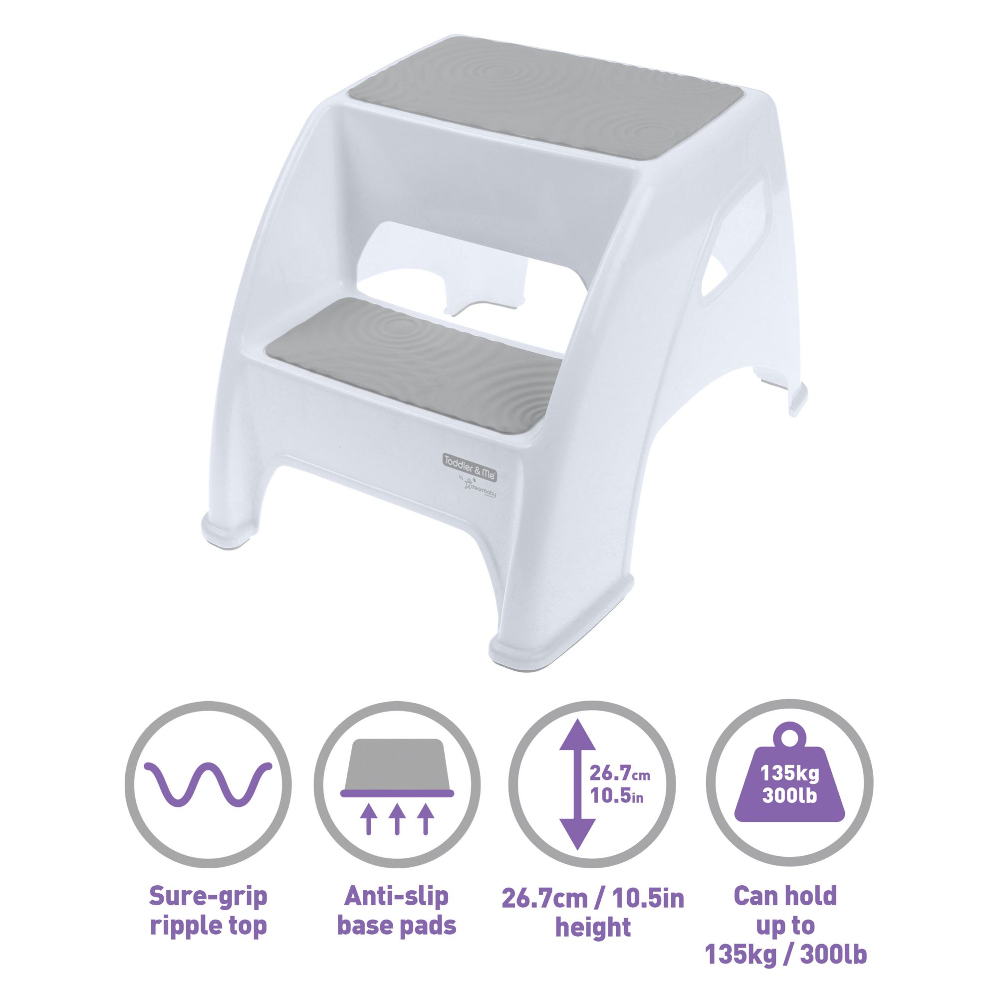 The Dreambaby Toddler & Me Step Stool with sure-grip ripple top helps toddlers take those first steps towards independence. This extra sturdy step stool is ideal for toilet training, brushing teeth or helping parents in the kitchen. With a weight capacity of 320 pounds, it is perfect for parents too.