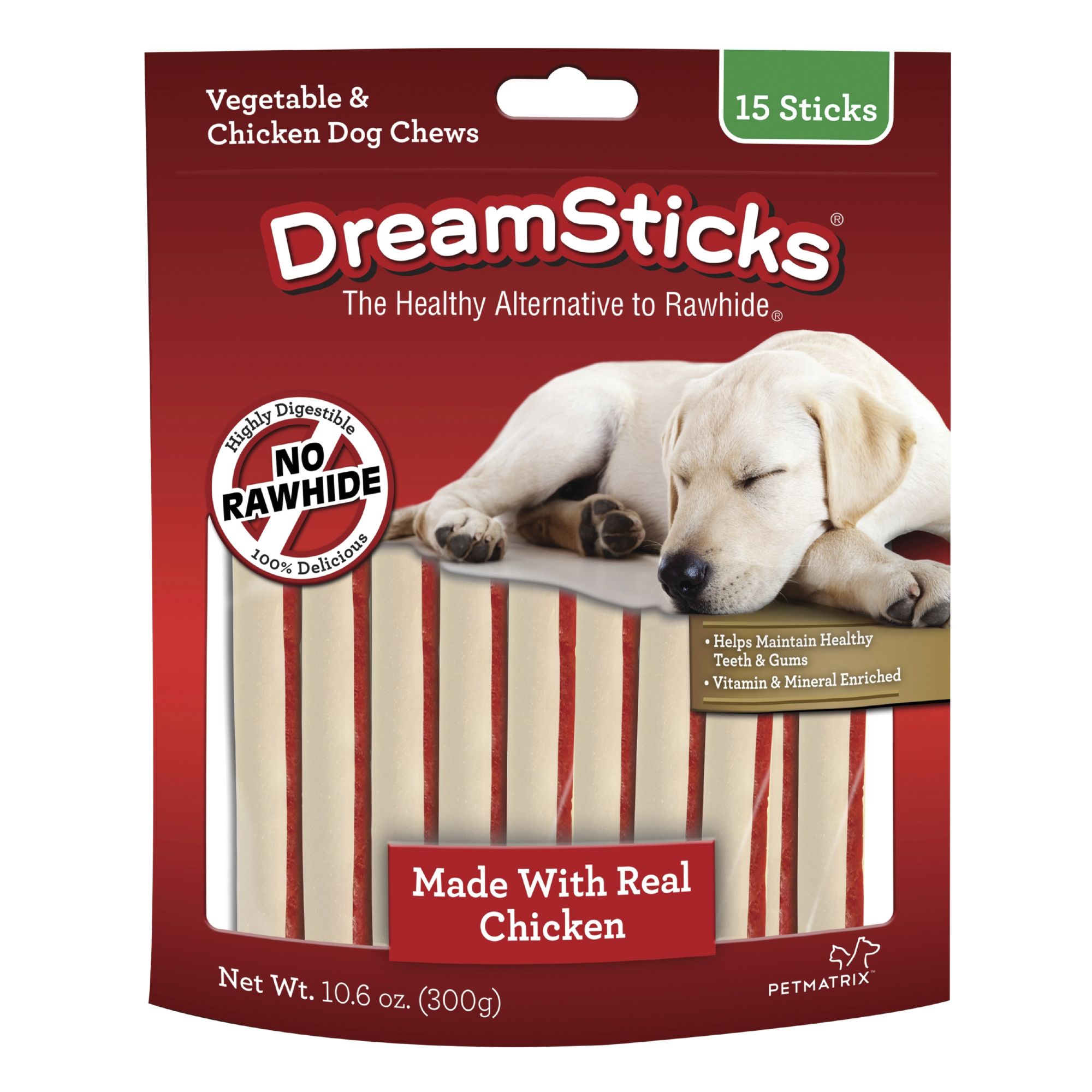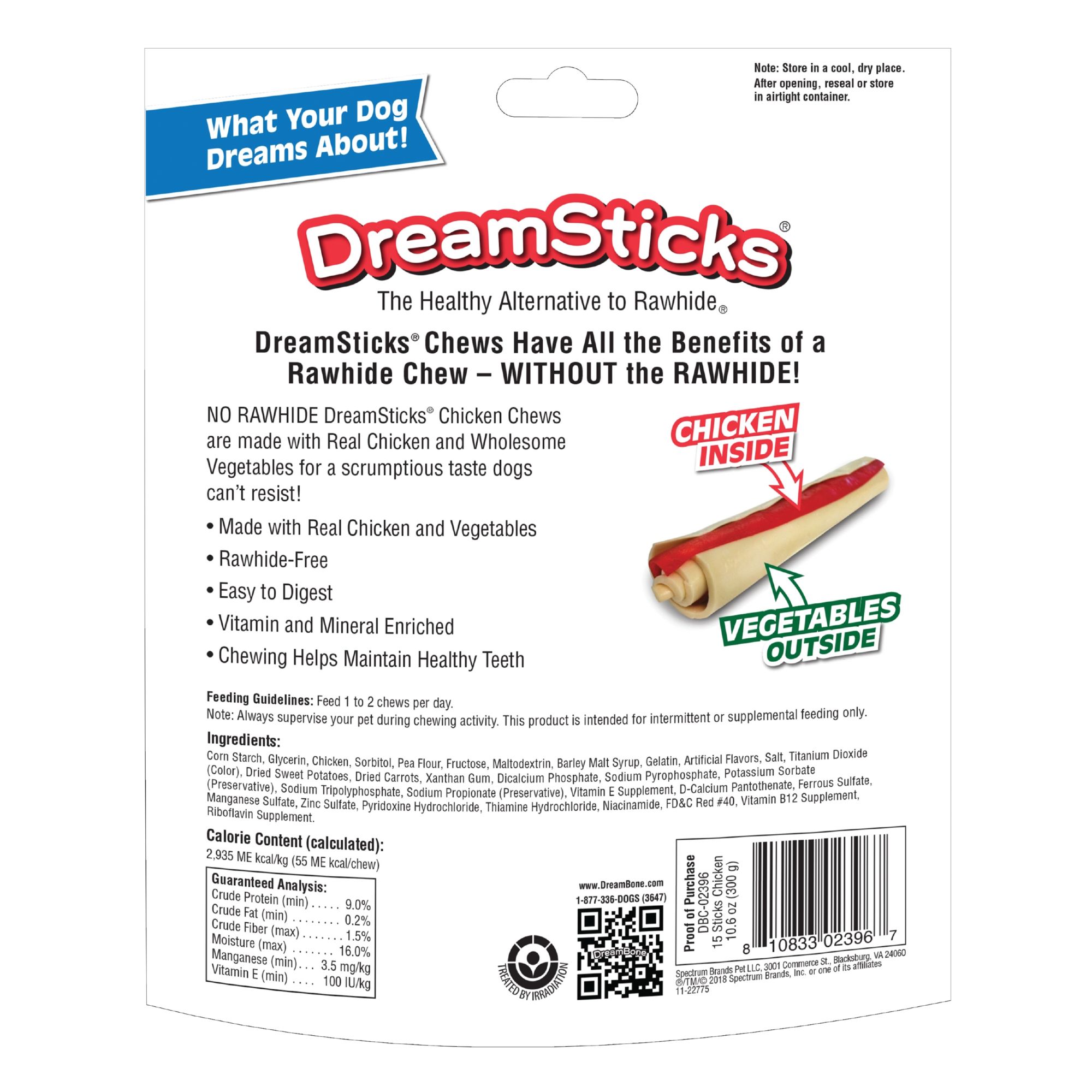 Satisfy your dog's need to chew while keeping him safe with DreamBone Chicken Chews Dog Treats. Dogs chew to exercise their jaws, clean their teeth and provide entertainment. Having the proper chew provides these benefits and helps prevent inappropriate chewing. DreamBone Chicken Chews Dog Treats are made with wholesome vegetables and real chicken rolled into a stick for a taste dogs love. In fact 9 out of 10 dogs preferred DreamBone over leading rawhide chews. DreamBone Chicken Chews Dog Treats are rawhide free and won't splinter.