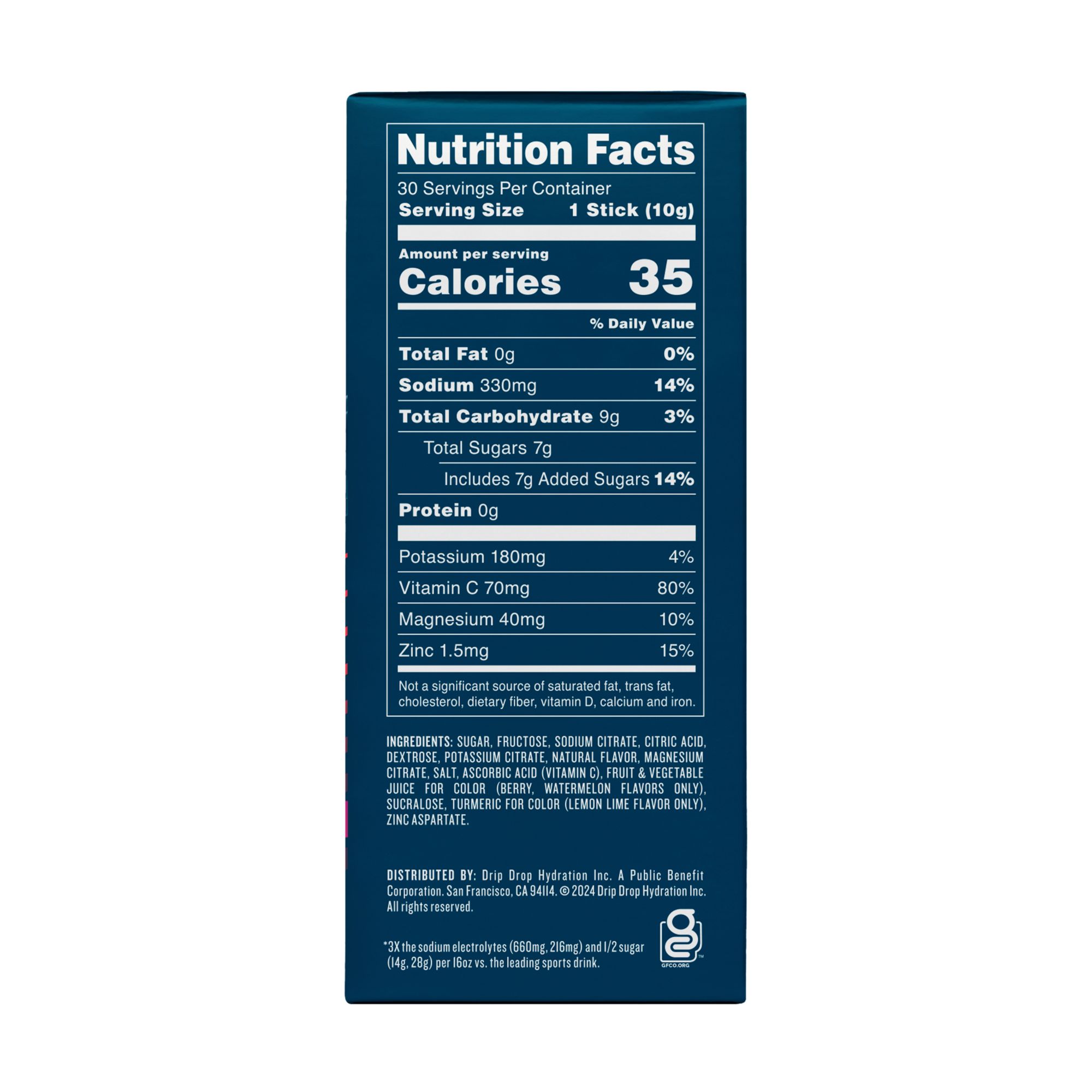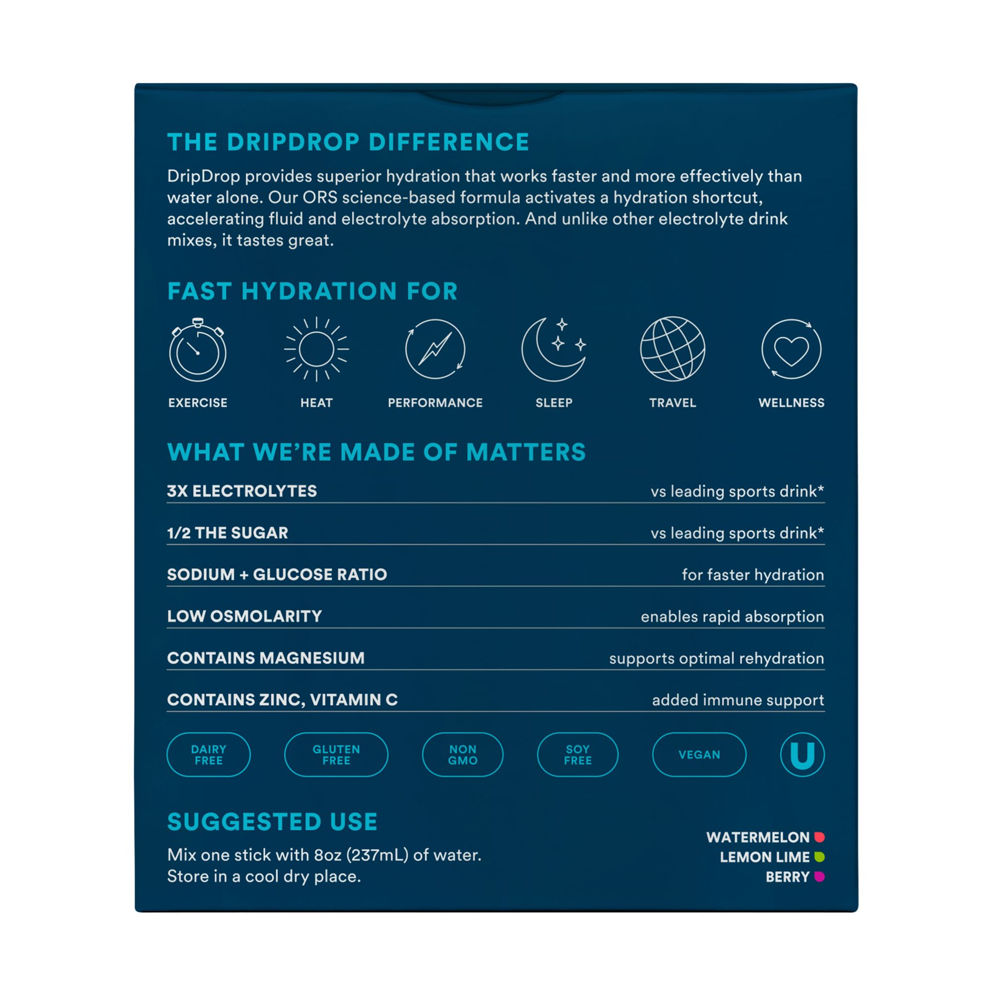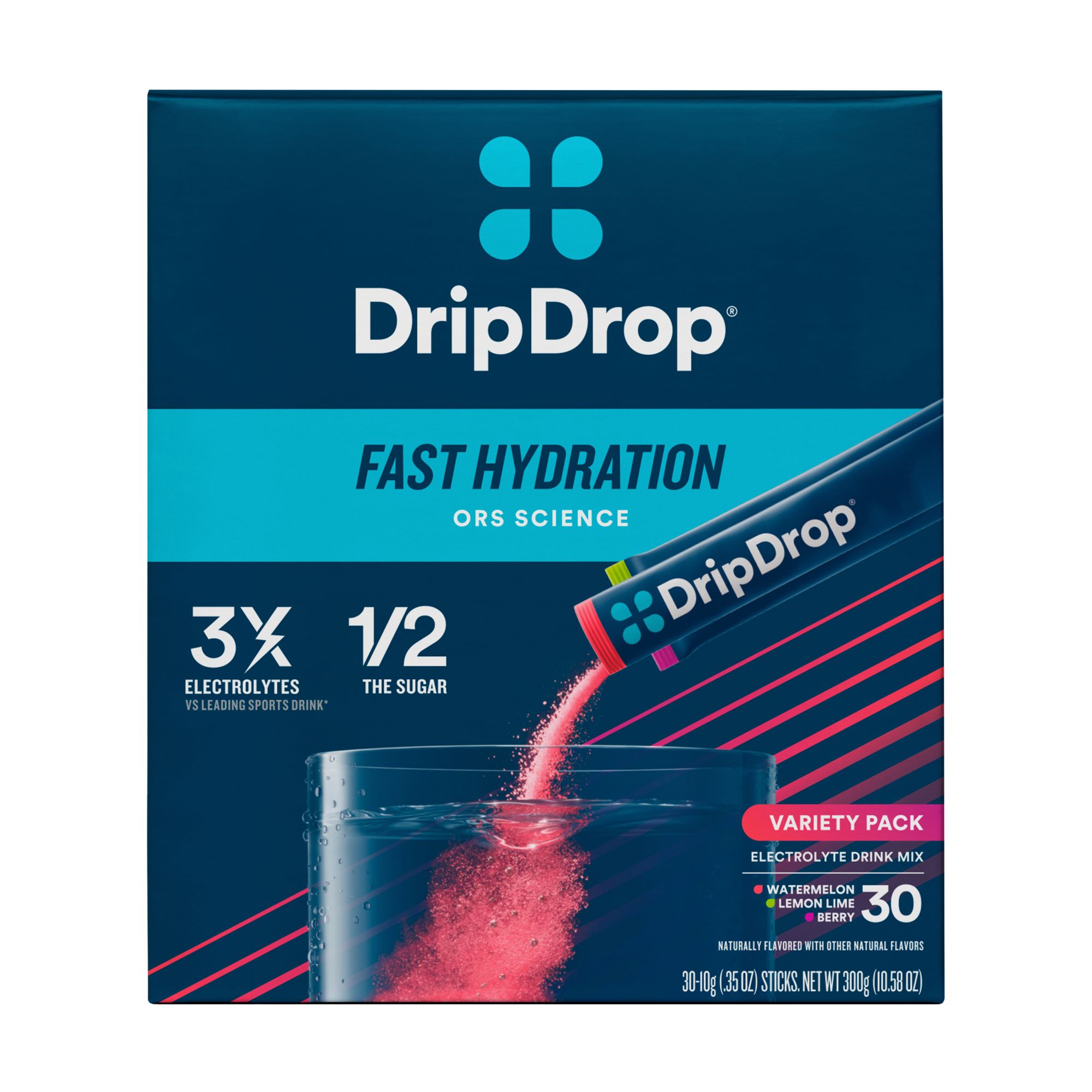 This exclusive variety pack for contains top selling flavors of Watermelon, Lemon Lime, and Berry. With a formula first developed and patented for humanitarian aid need, DripDrop uses purchases to generate life-saving donations of DripDrop to those who need it most. The DripDrop formula is the most effective, best tasting hydration powder on the market today used by all branches of the military, special forces, the vast majority of pro sports.