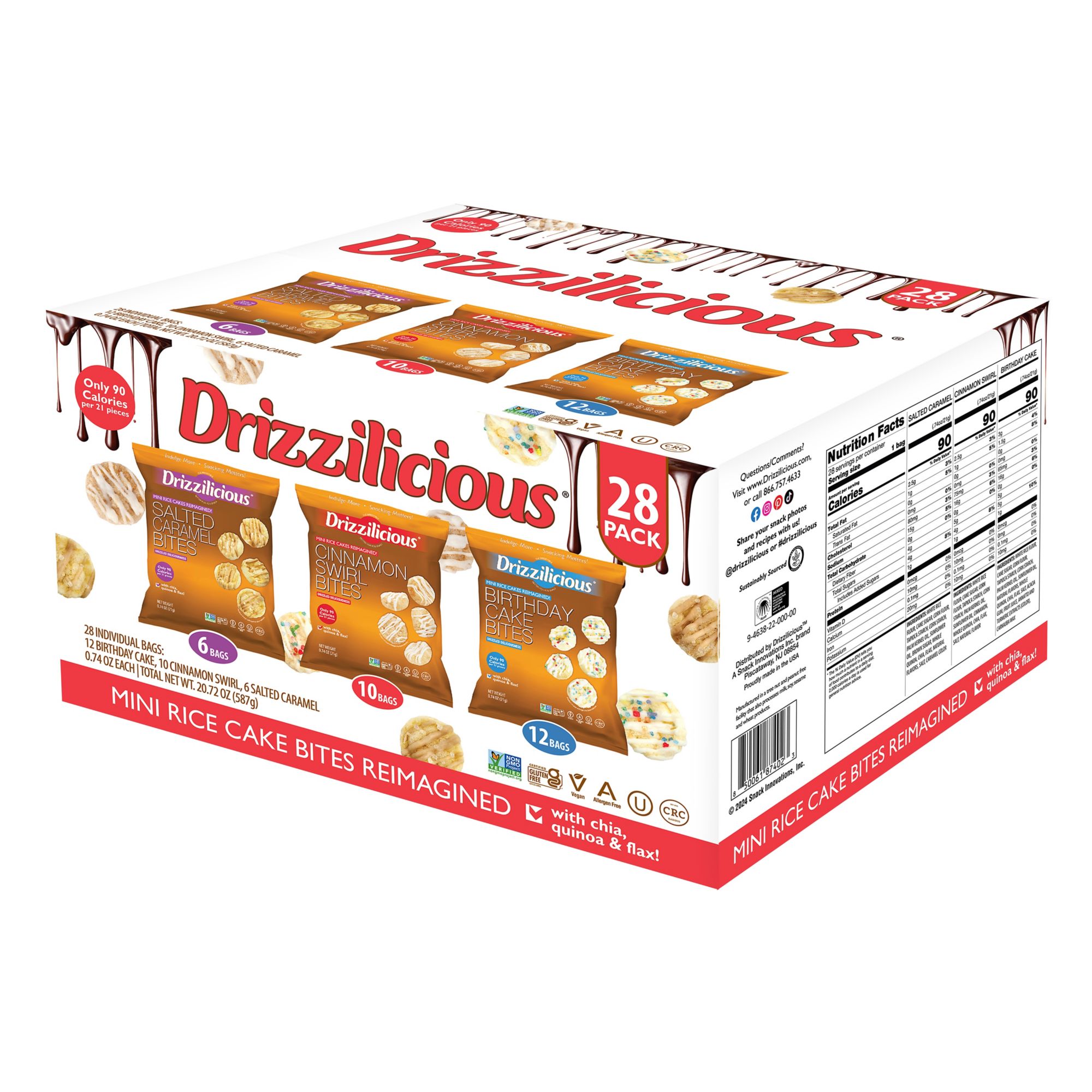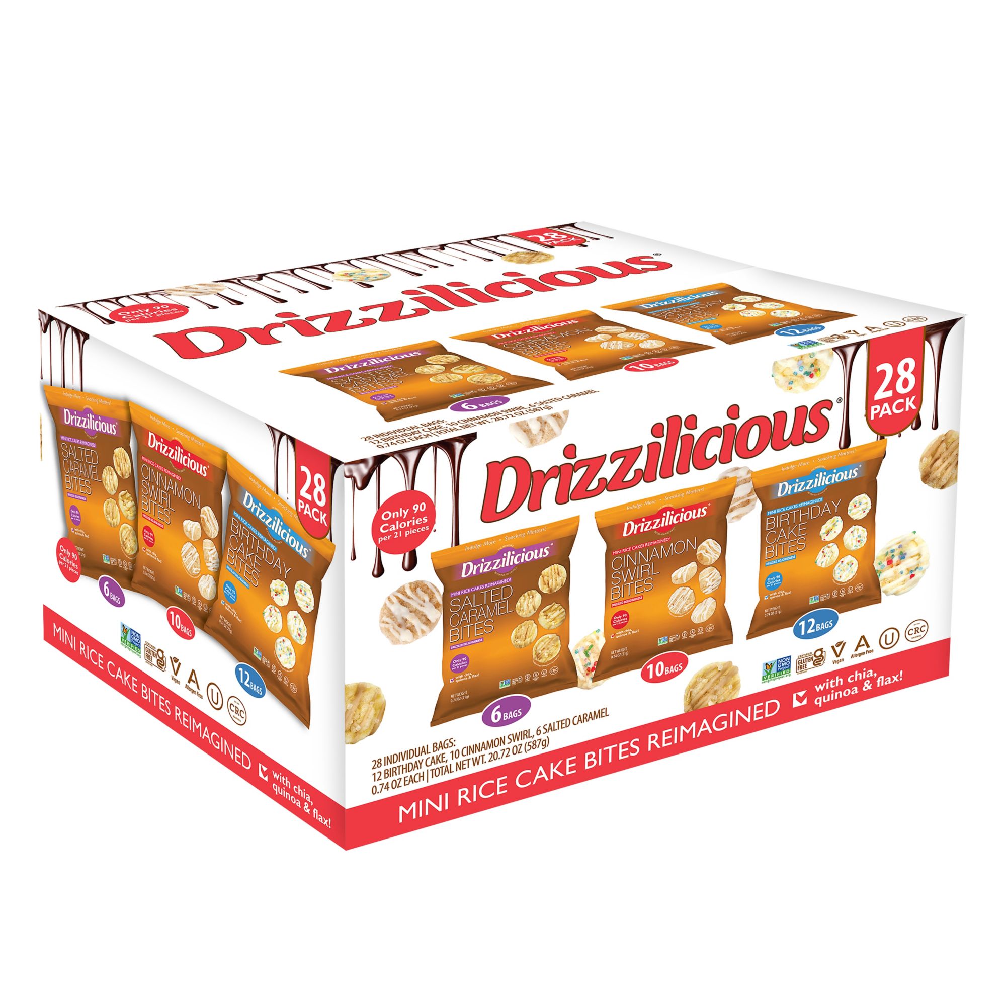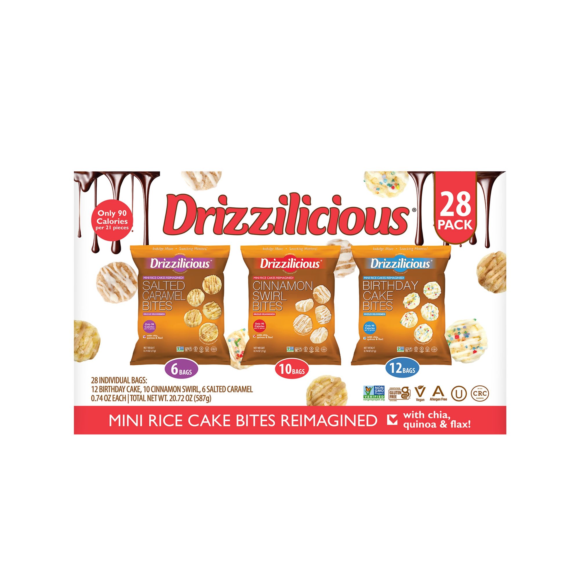 Pack of 28 Drizzilicious mini rice cakes, with 12 Birthday Cake flavor, 10 Cinnamon flavor and 6 Salted Caramel flavor