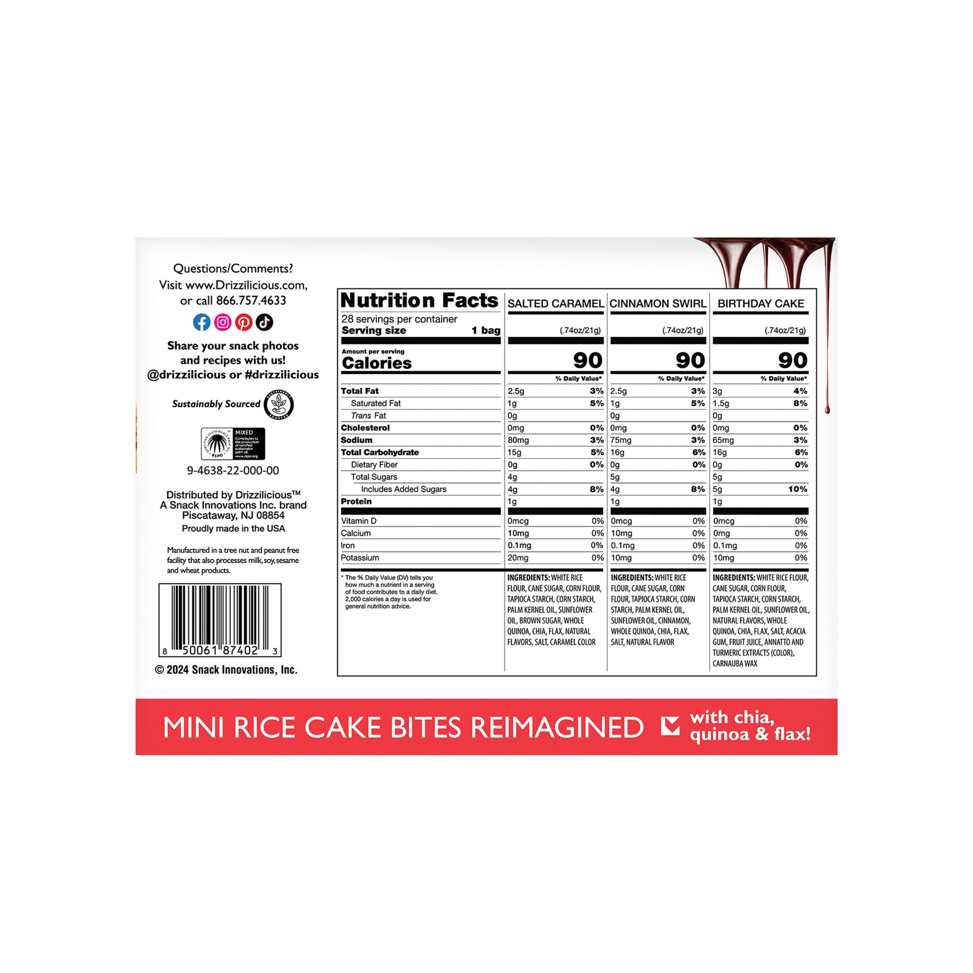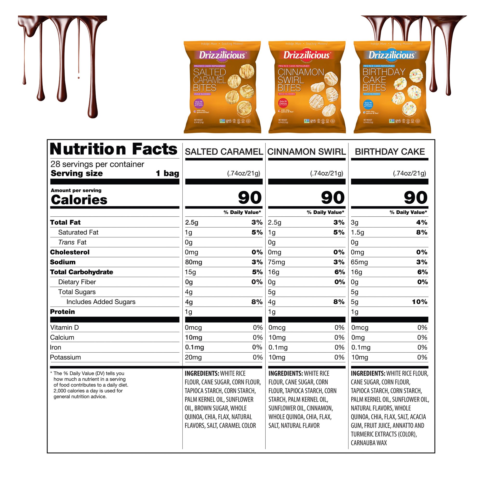 Drizzilicious is a light and crunchy better for you snack made with whole grains, quinoa, chia and flax. The ideal combination of great taste, nature's super foods and drizzled decadence. At just 90 calories per 21 pieces, Drizzilicious is a smart little snack you can feel great about. These rice cakes are packaged in resealable, eco-friendly, stand up bags. Each bag is packed with wholesome goodness and popped to perfection.