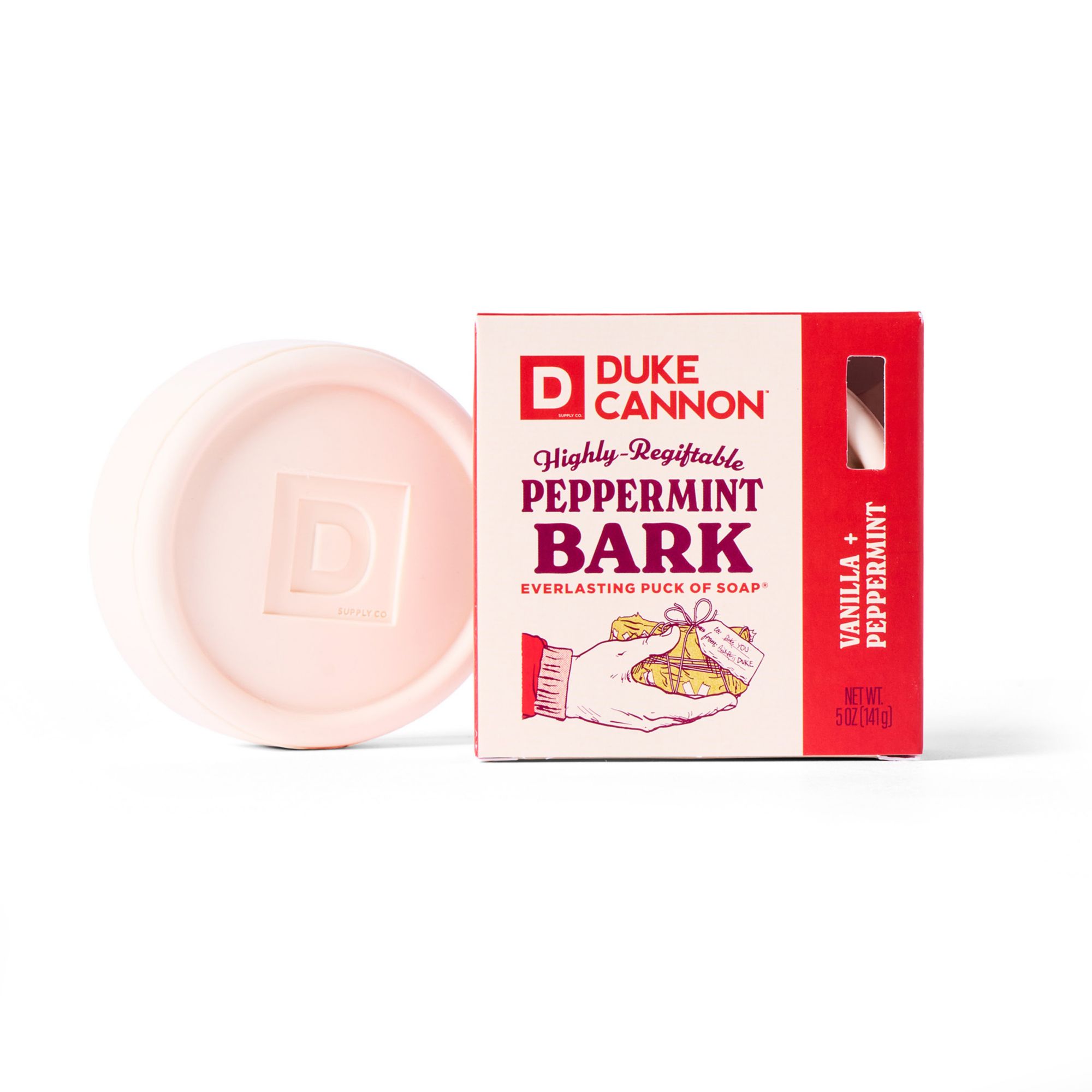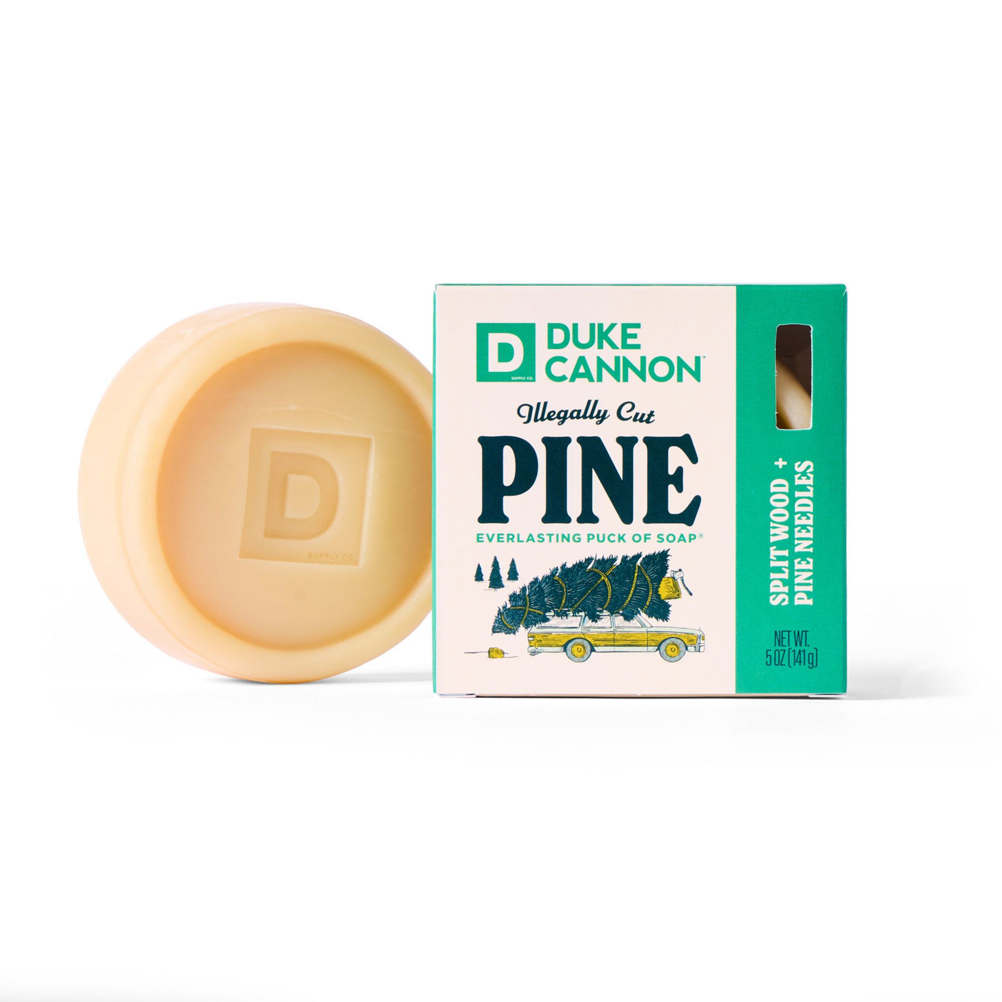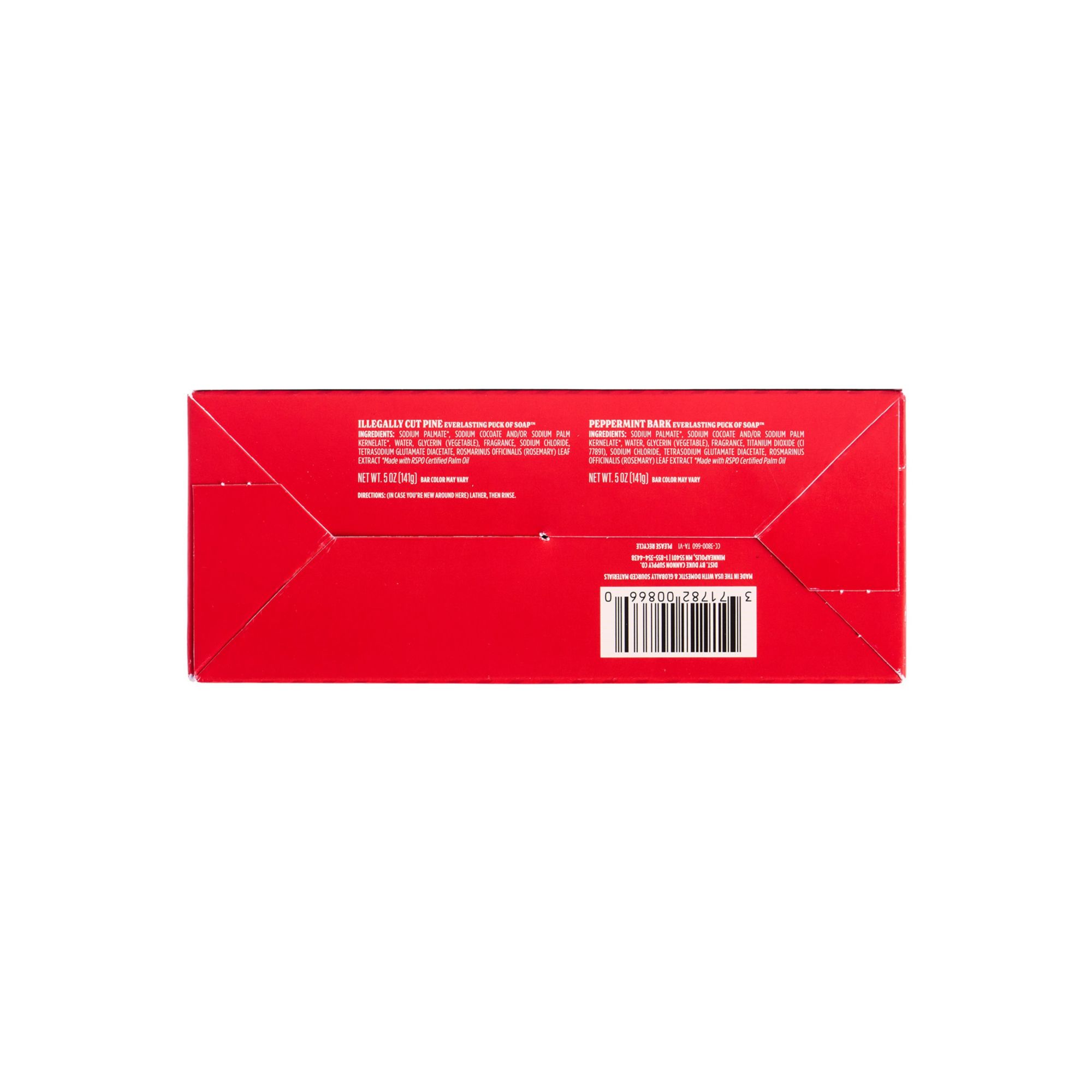 Contains: two 5 oz. Illegally Cut Pine Everlasting Puck of Soap and two 5 oz. Highly-Re-giftable Peppermint Bark Everlasting Puck of Soap