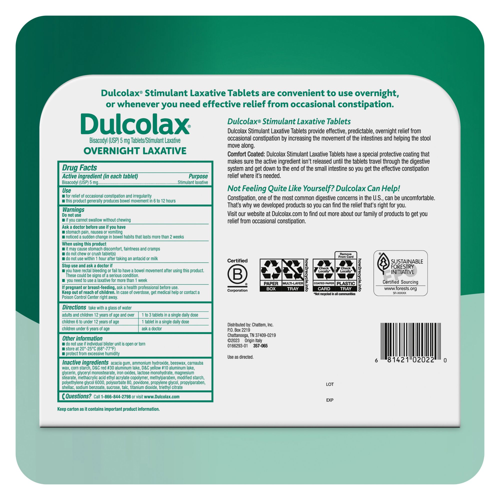 Dulcolax Overnight Relief laxative tablets have a comfort coating that protects your stomach and helps it work right where you need it. You get the gentle relief you want, and the strength you need for effective occasional constipation relief. Trusted to provide gentle, predictable, overnight relief, Dulcolax is recommended by doctors and pharmacists, and millions of people in America and around the world have trusted it to help relieve their constipation for over 50 years.