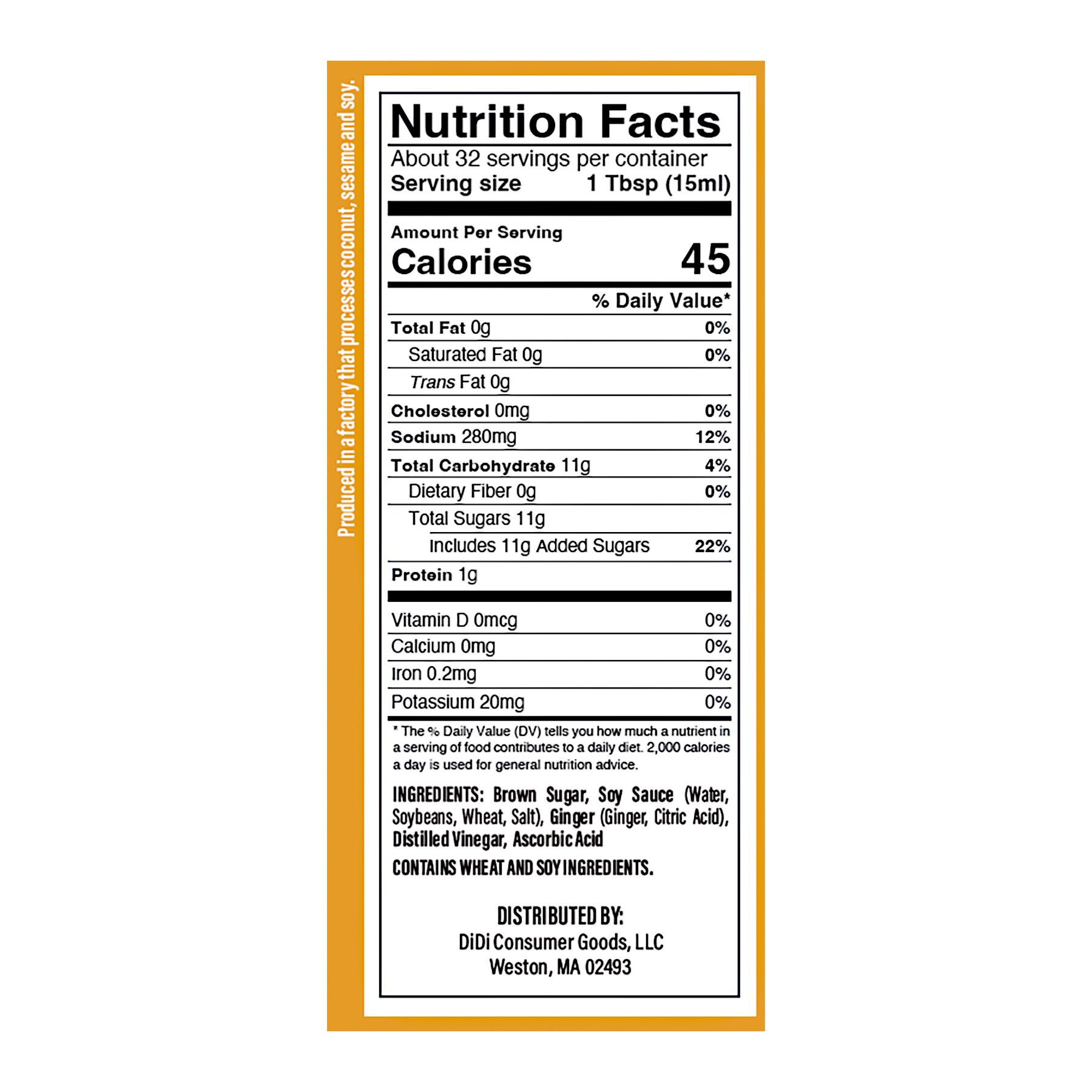 Ingredients: Brown Sugar, Soy Sauce (Water, Soybeans, Wheat, Salt), Ginger, Distilled Vinegar, Ascorbic Acid.