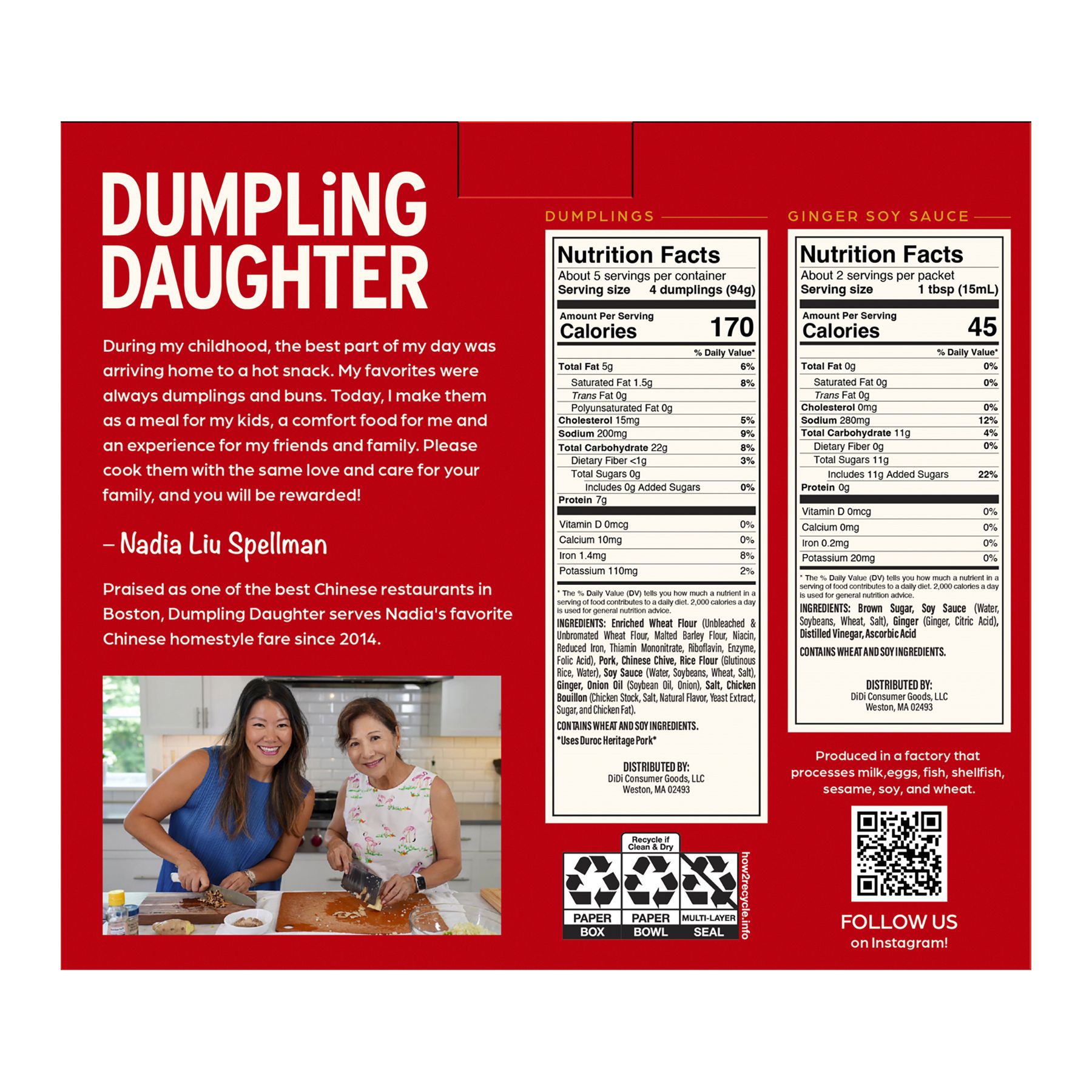 From Dumpling Daughter's founder, Nadia: "Dumpling Daughter was born two generations before me. My parents owned Boston’s most renowned 5-star Chinese restaurant, Sally Ling's! Despite all the fancy food I enjoyed, my favorite food was mom’s home cooking and I often looked forward to an after school snack of steamed buns or a giant plate of dumplings. Dumplings became the essential comfort food of my childhood. I have since founded Dumpling Daughter, which serves many of my family’s most authentic time-tested dishes. Today, we are making people happy - one dumpling at a time. Our Pork and Chive dumplings hold a special place in my heart. These bring me right back to Grandma's house. Grandma was from Harbin, China and made dumplings in the true northern Chinese style. The aromatic chives would fill the house with an enticing scent that got us all excited for dinner. I love them boiled so you can fully enjoy the flavor of the chive but pan-searing until crispy is very tasty too!"