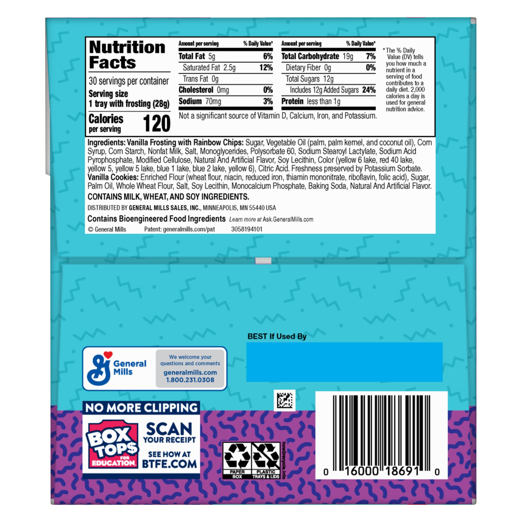 Ingredients:Vanilla Frosting with Rainbow Chips: Sugar, Vegetable Oil (palm, palm kernel, and coconut oil), Corn Syrup, Corn Starch, Nonfat Milk, Salt, Monoglycerides, Polysorbate 60, Sodium Stearoyl Lactylate, Sodium Acid Pyrophosphate, Modified Cellulose, Natural And Artificial Flavor, Soy Lecithin, Color (yellow 6 lake, red 40 lake, yellow 5, yellow 5 lake, blue 1 lake, blue 2 lake, yellow 6), Citric Acid. Freshness preserved by Potassium Sorbate. Vanilla Cookies: Enriched Flour (wheat flour, niacin, reduced iron, thiamin mononitrate, riboflavin, folic acid), Sugar, Palm Oil, Whole Wheat Flour, Salt, Soy Lecithin, Monocalcium Phosphate, Baking Soda, Natural And Artificial Flavor