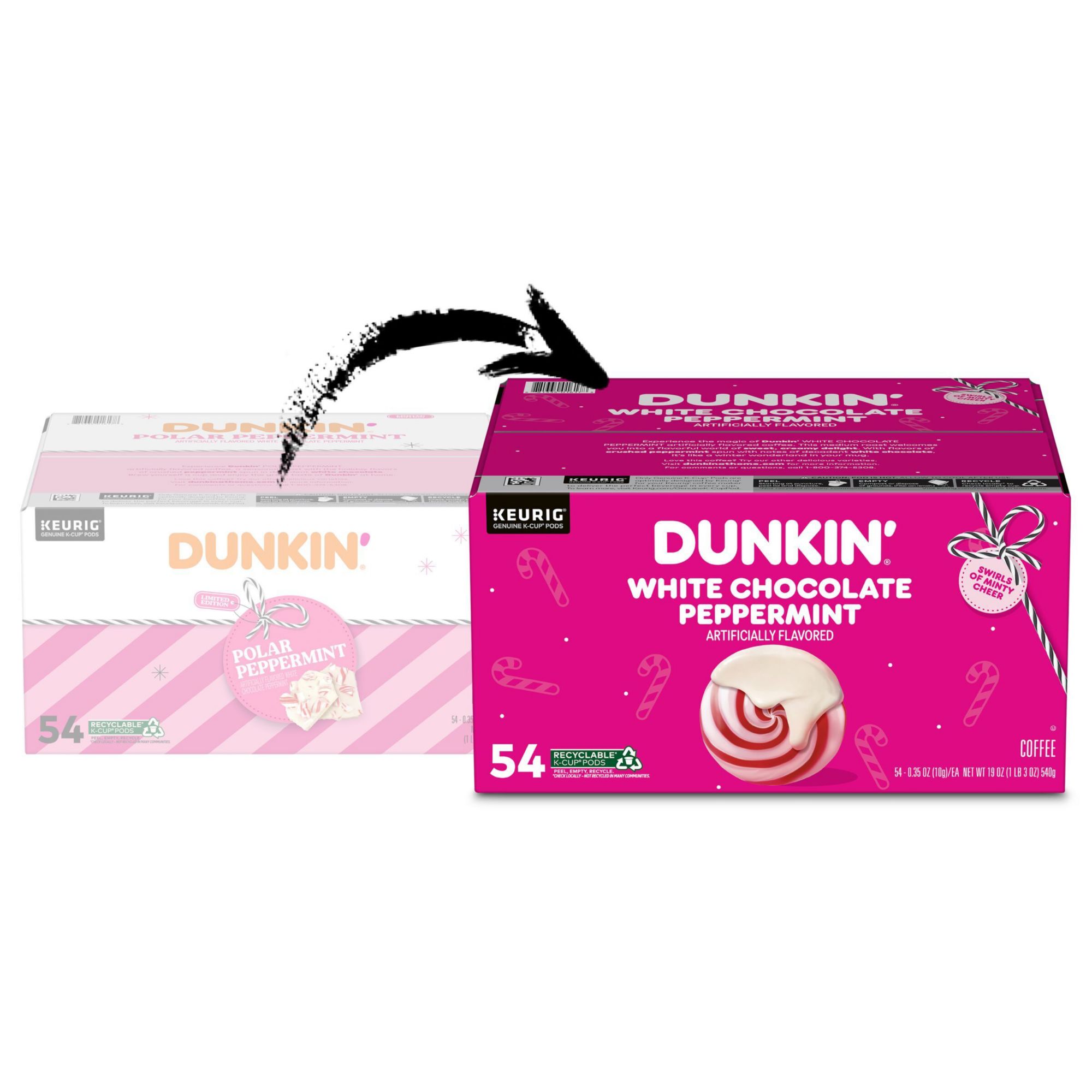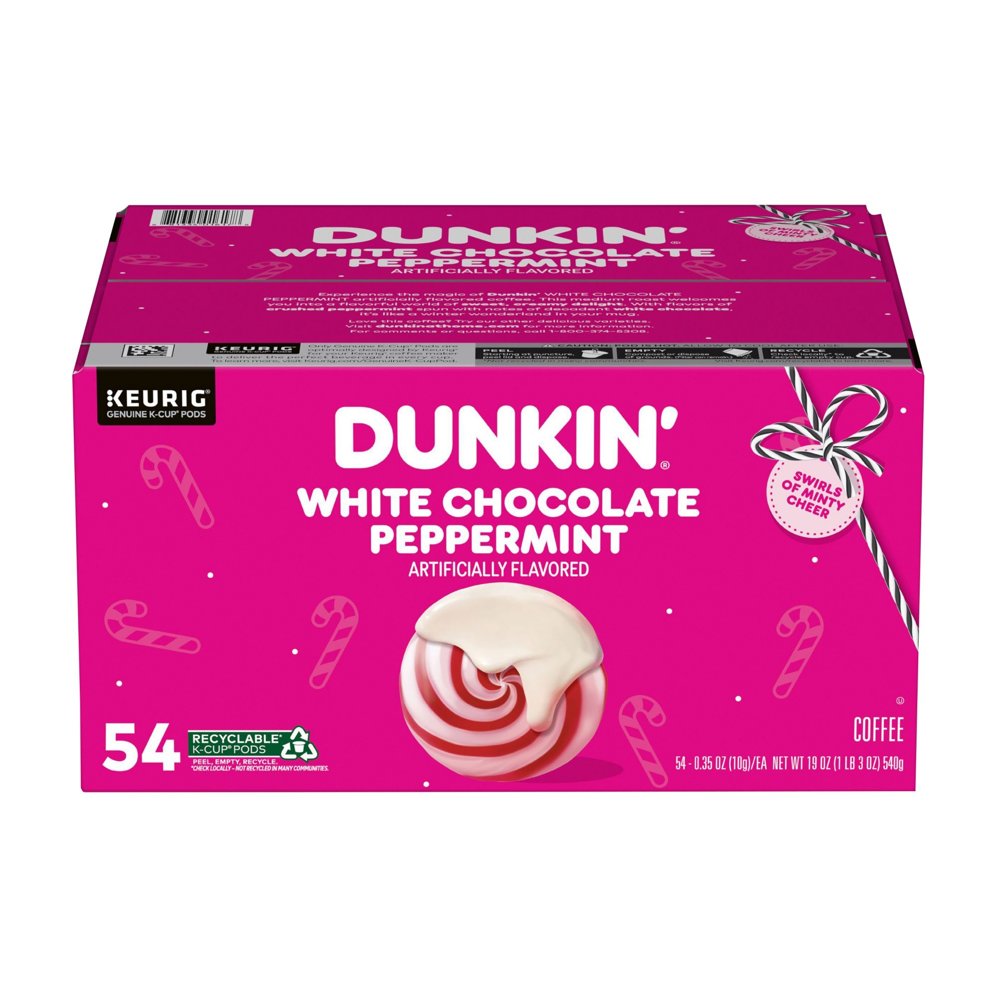 Contains: One 54-count box of Dunkin’ White Chocolate Peppermint artificially flavored coffee pods