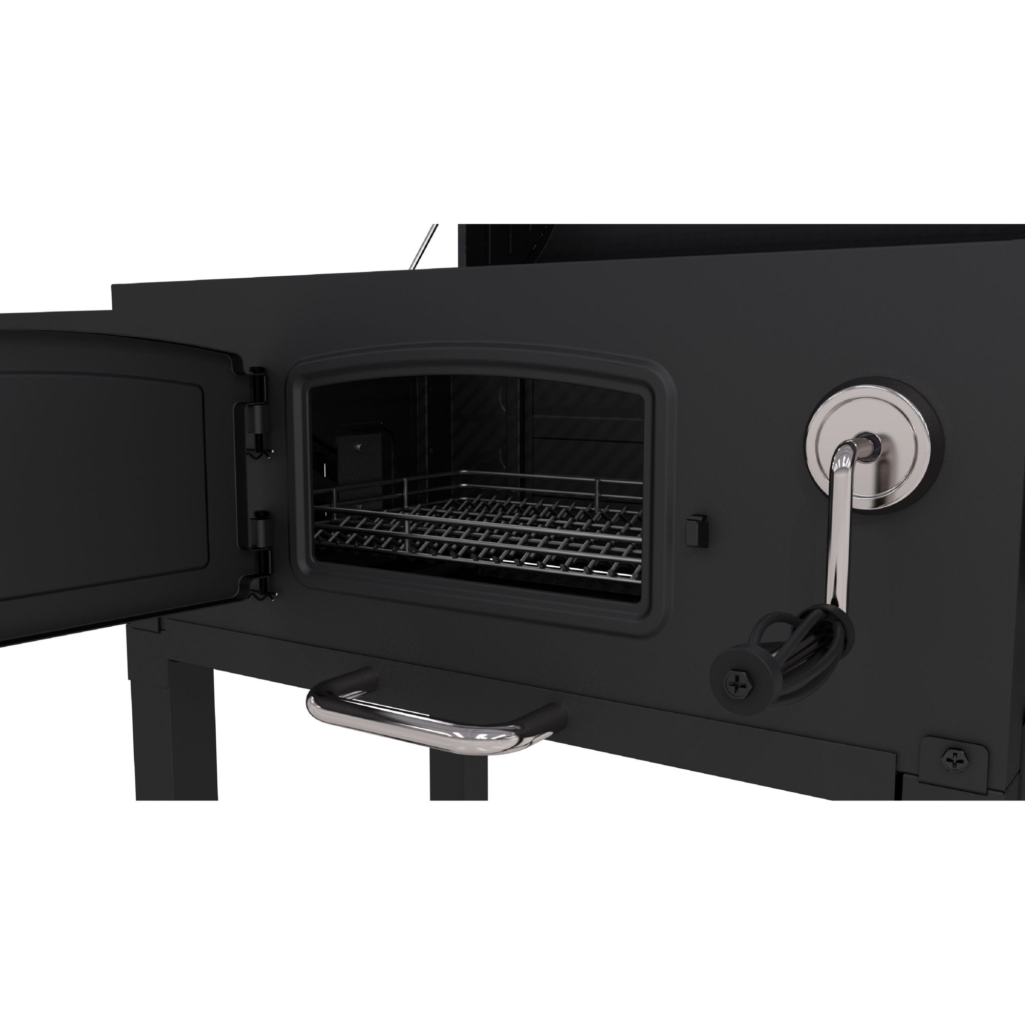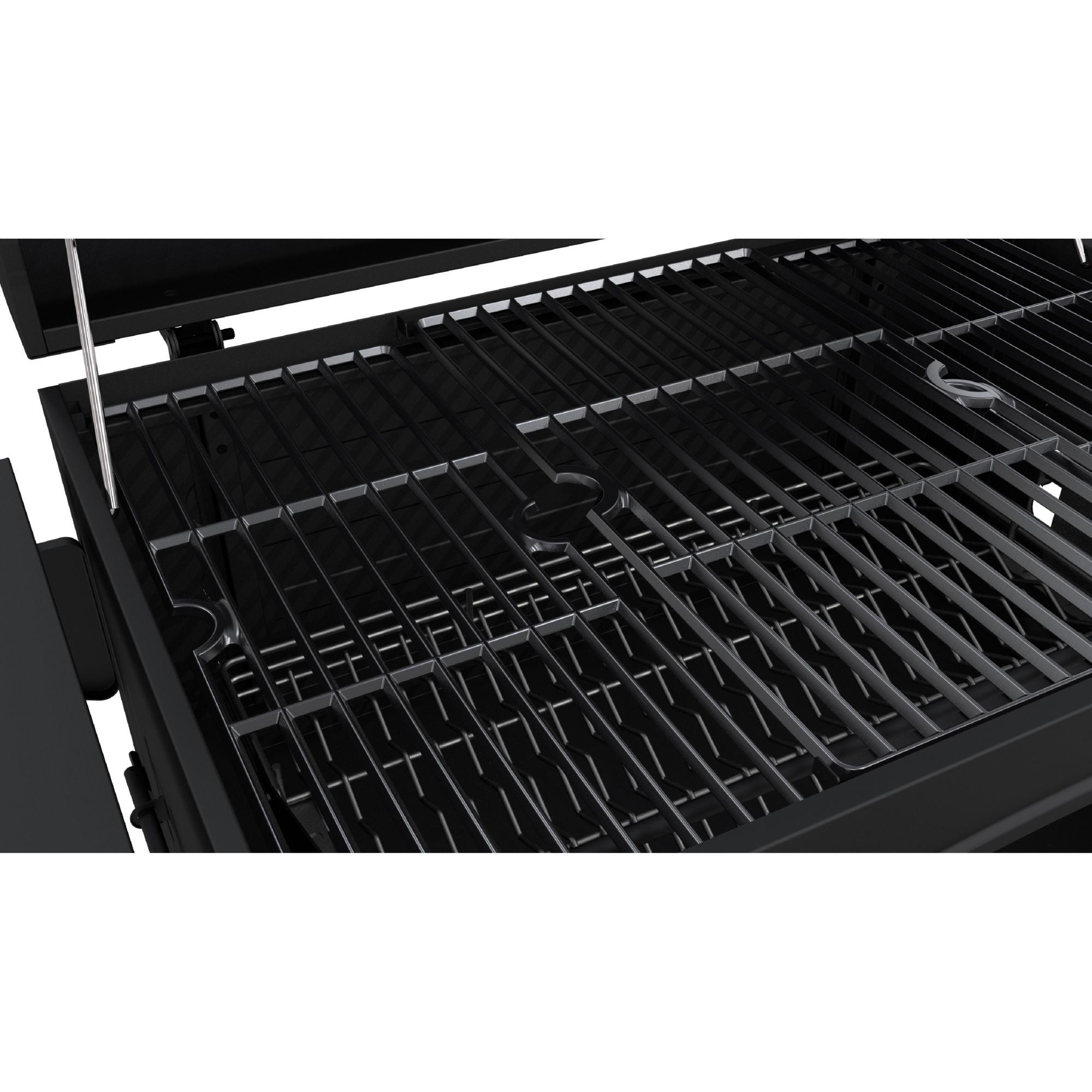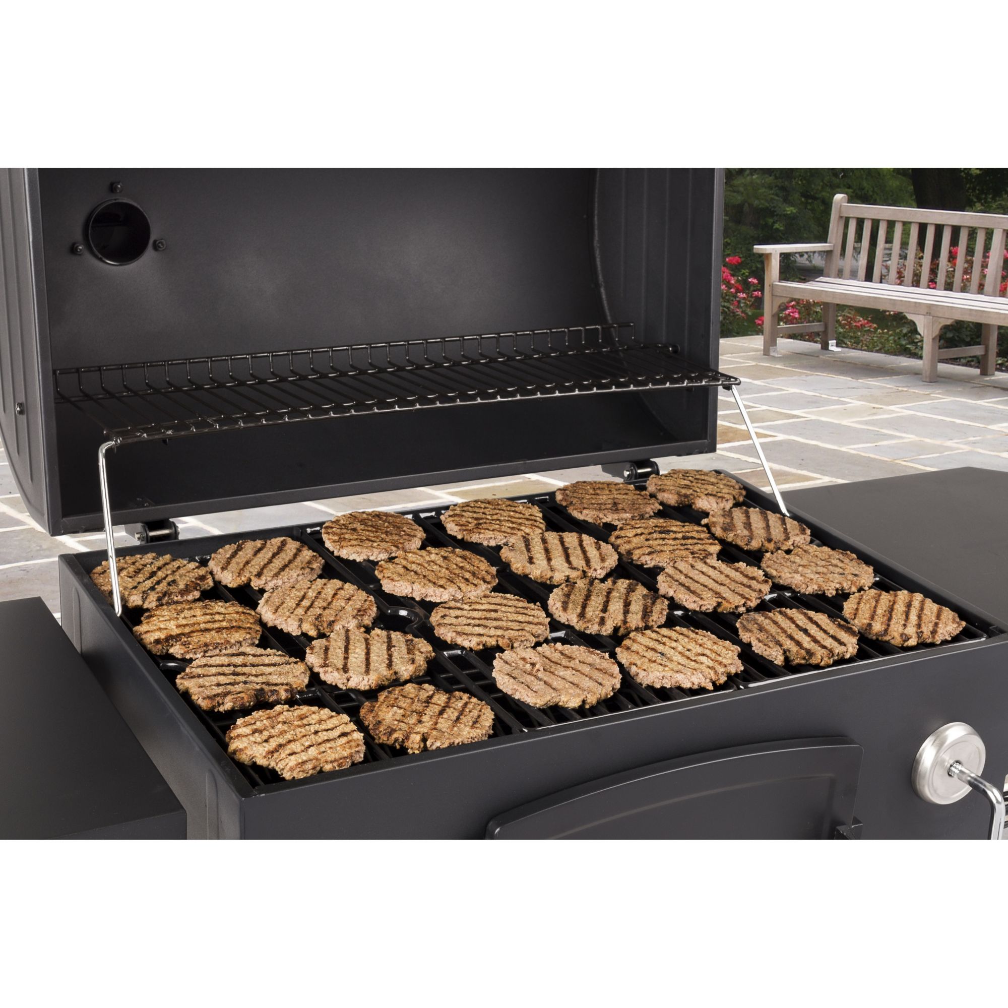 Anytime is the right time to cook on this heavy-duty charcoal grill from Dyna-Glo. Each cooking grate is made with porcelain enameled cast iron for maximum heat transfer and searing. Customize the cooking temperature by using the adjustment crank to raise and lower the charcoal tray. Reloading or stoking charcoal is made simple by opening the steel access door on the front of the grill or sliding the cooking grates to one side. The smoke stack features an adjustable flue for additional temperature control. The high capacity ash pan is removable for quick and easy clean-up.