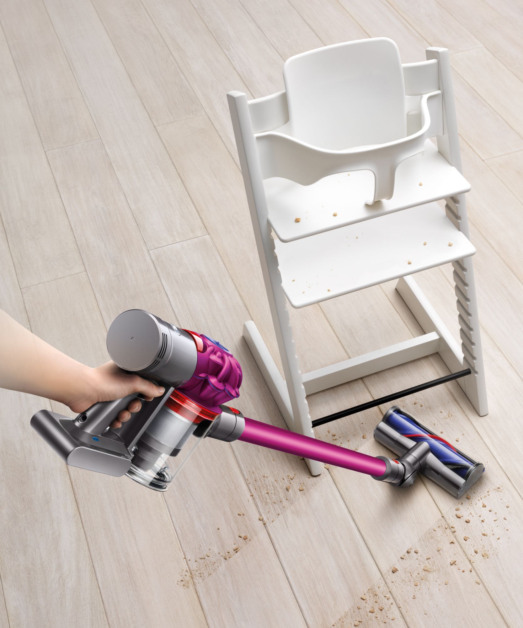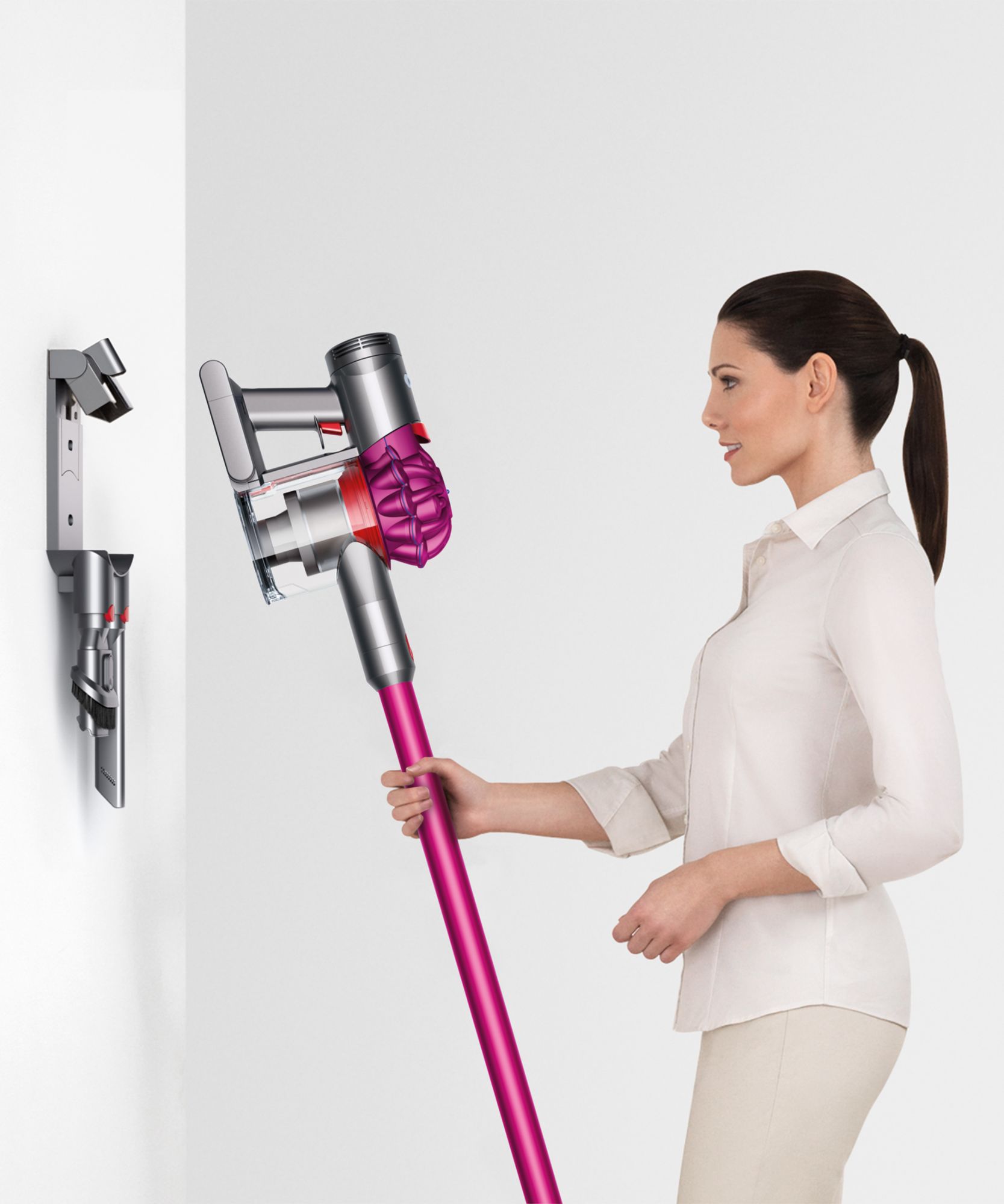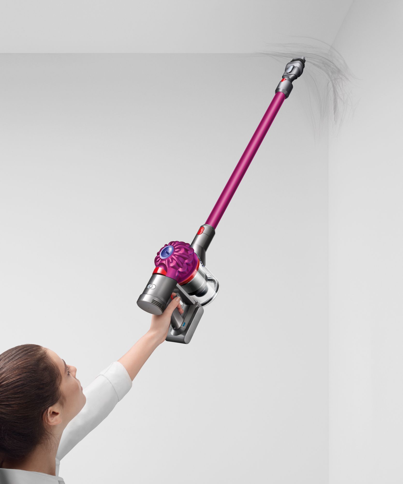 With 75% more brush bar power than the Dyson V6 cord-free vacuum, the Dyson V7 is powered by the Dyson digital motor and is engineered for powerful suction on carpets and hard floors. Reach up to 30 minutes of fade-free power in Powerful mode and up to 20 minutes with the motorized cleaner-head. Powerful suction for whole-home cleaning, No need to touch the dirt – just pull the lever to release it into the bin. This vacuum easily reaches up high to clean high-up places with one smooth motion. It quickly transforms to a handheld and back again, in just one click.