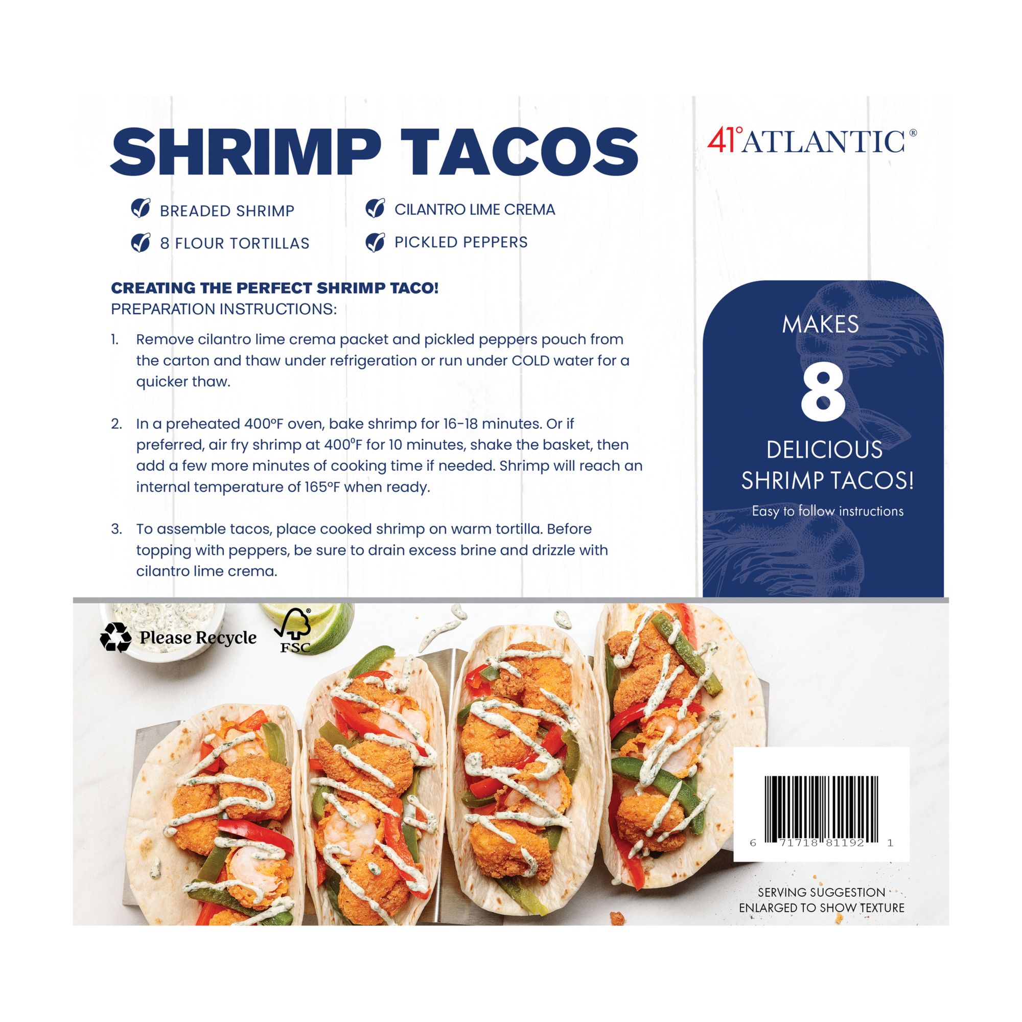 A new twist on your typical Taco Tuesday! Panko Breaded Shrimp with pickled veggies topped with a tangy cilantro creme sauce and wrapped in a soft flour taco shell. Everything you need for delicious street tacos from the comfort of your home! Includes eight flour tortillas, breaded shrimp, cilantro lime creme sauce, and pickled peppers. Can be prepared in the air fryer or oven in less than 20 mins.