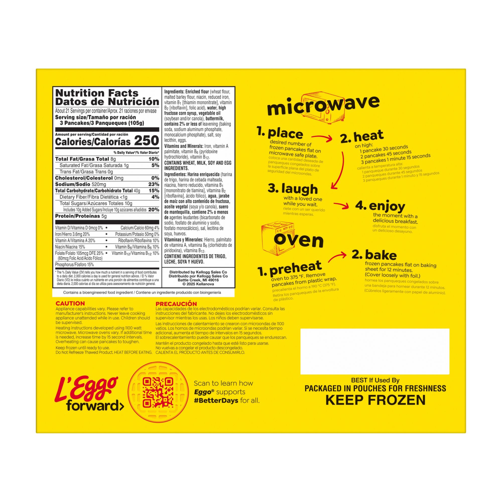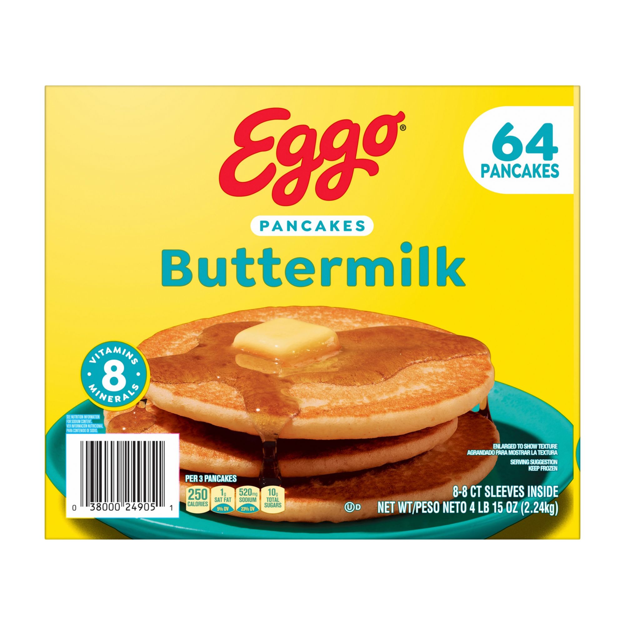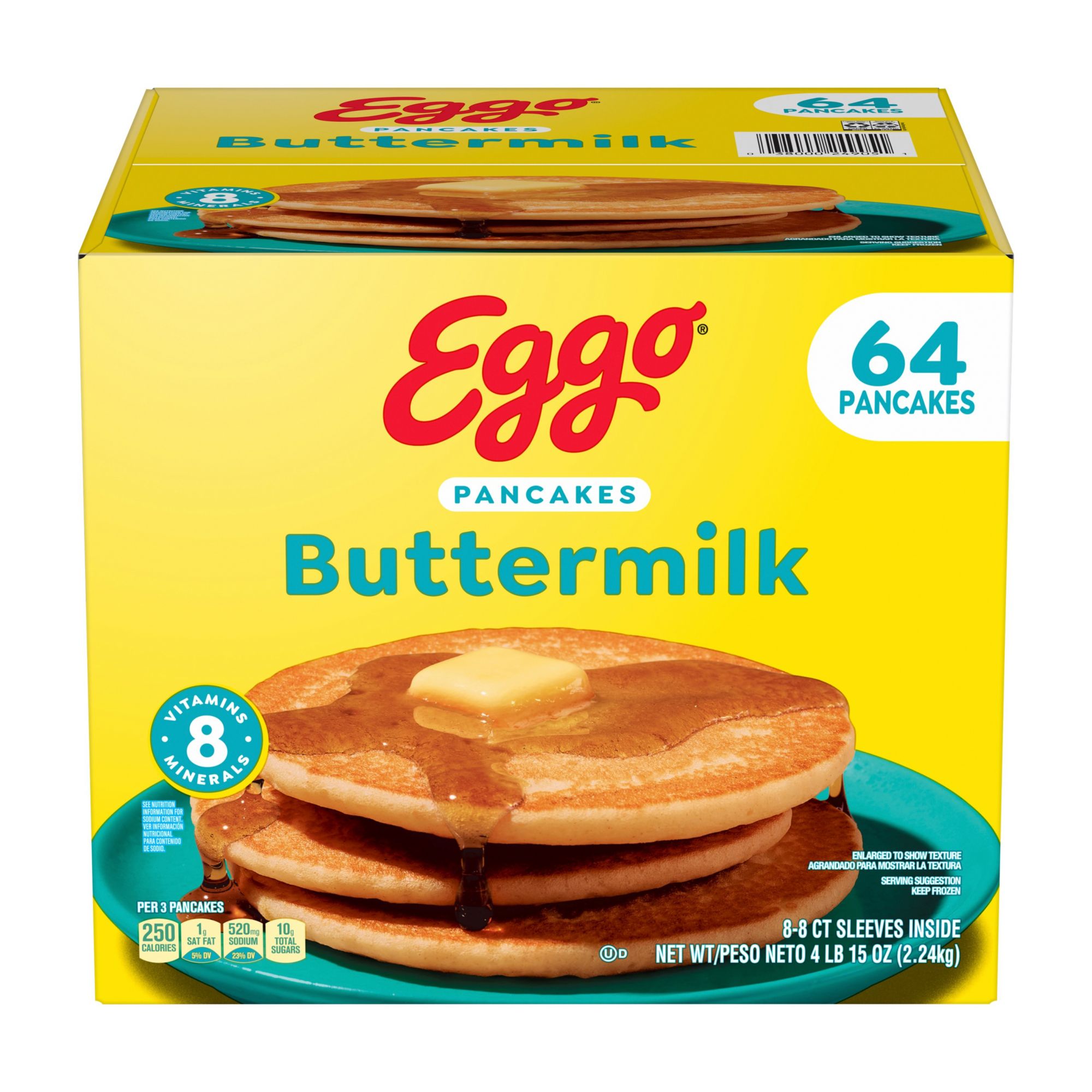 Wake up and greet the day with the feel-good taste of Kellogg's Eggo Buttermilk Pancakes scrumptious frozen pancakes that pair beautifully with your favorite breakfast sides year-round. Kellogg's Eggo Buttermilk Pancakes have been crafted with pantry-perfect ingredients for a delicious, irresistible taste. Pop these frozen pancakes in the toaster or oven for a soft, fluffy texture and the familiar, inviting flavor of homemade pancakes. These frozen pancakes are made with no artificial colors and flavors and provide a good source of 8 essential vitamins and minerals. Conveniently packaged and easy to prepare, Kellogg's Eggo Pancakes help bring warmth and smiles to fast-paced, busy mornings where getting a bite to eat may otherwise be a challenge. Great for families and individuals alike, these delicious pancakes are made to enjoy as a stand-alone breakfast treat or with your favorite morning toppings such as butter and syrup, jellies and preserves, and whipped cream. So delicious you can't just L'Eggo