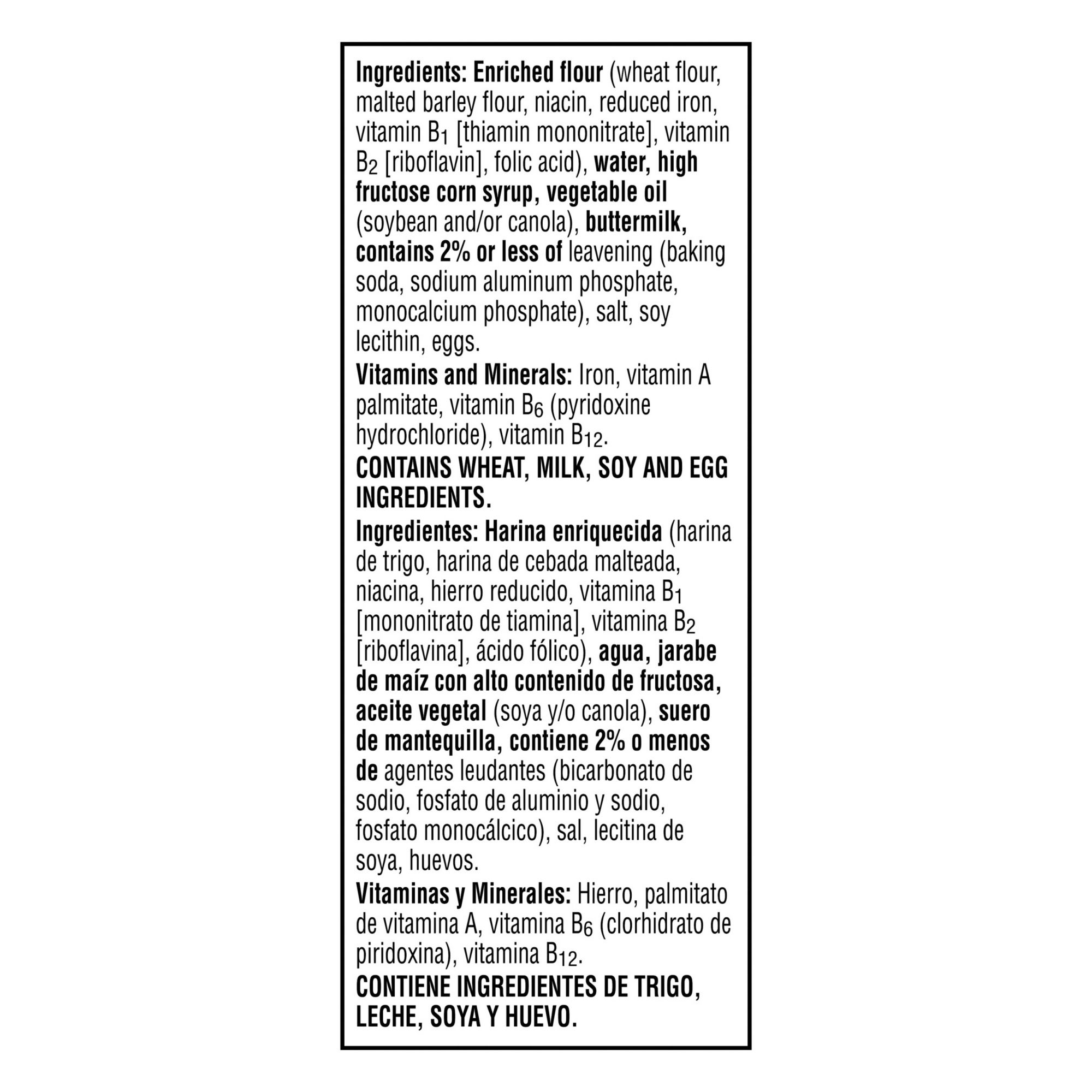 Enriched flour (wheat flour, malted barley flour, niacin, reduced iron, vitamin B1 [thiamin mononitrate], vitamin B2 [riboflavin], folic acid), water, high fructose corn syrup, vegetable oil (soybean, palm, and/or canola), buttermilk, eggs, contains 2% or less of leavening (baking soda, sodium aluminum phosphate, monocalcium phosphate), salt, soy lecithin.Vitamins and Minerals: Vitamin A palmitate, reduced iron, vitamin B6 (pyridoxine hydrochloride), vitamin B12.