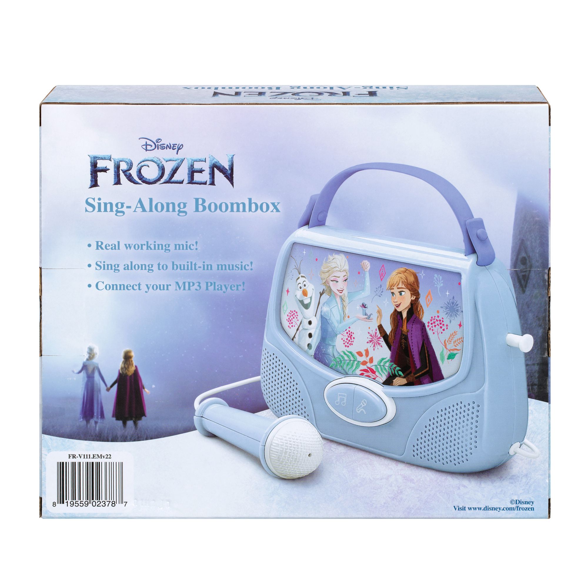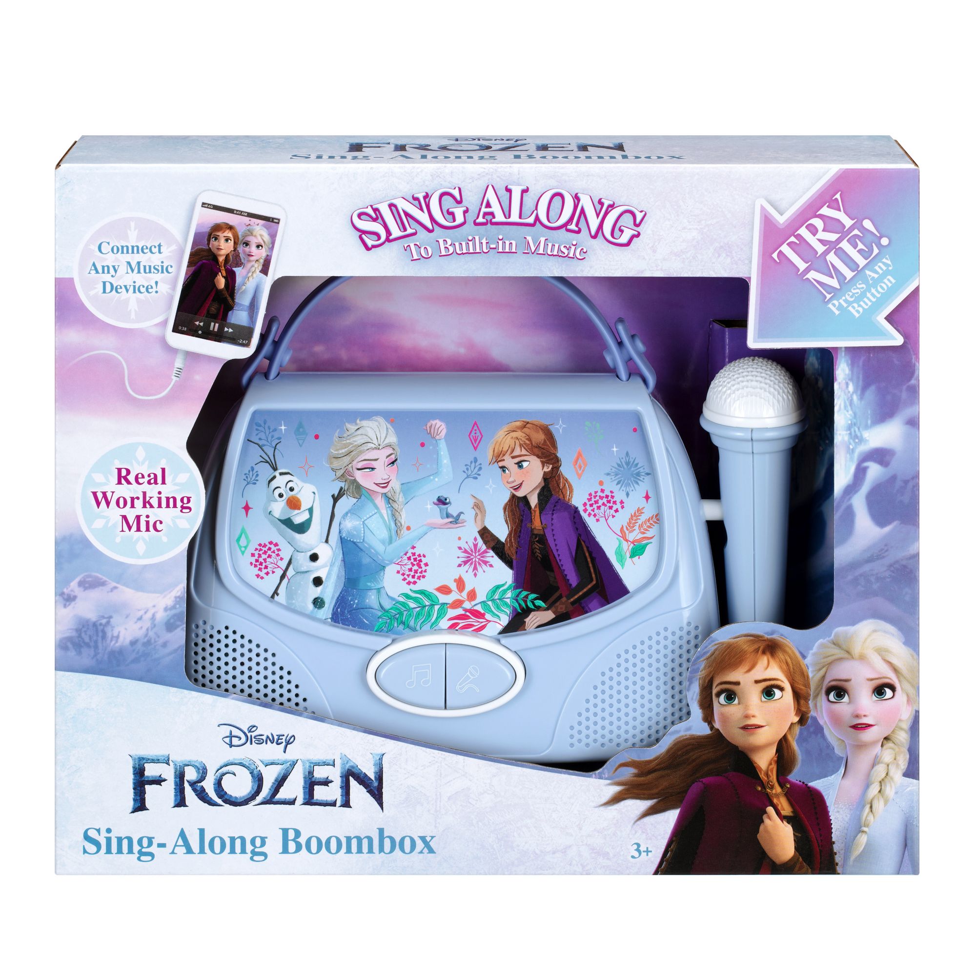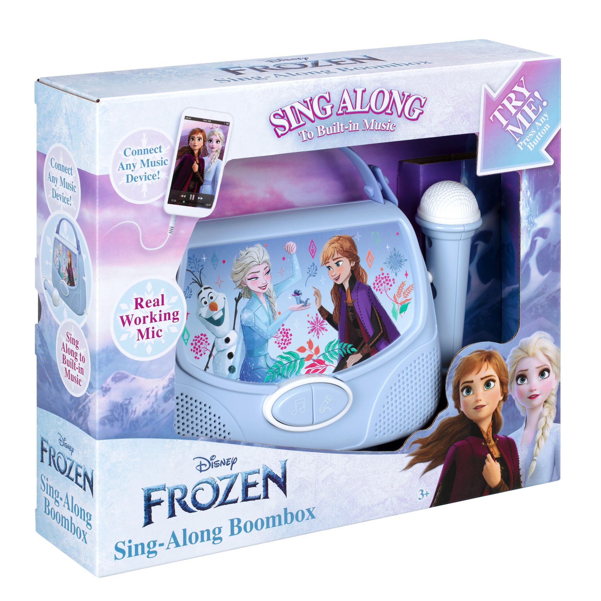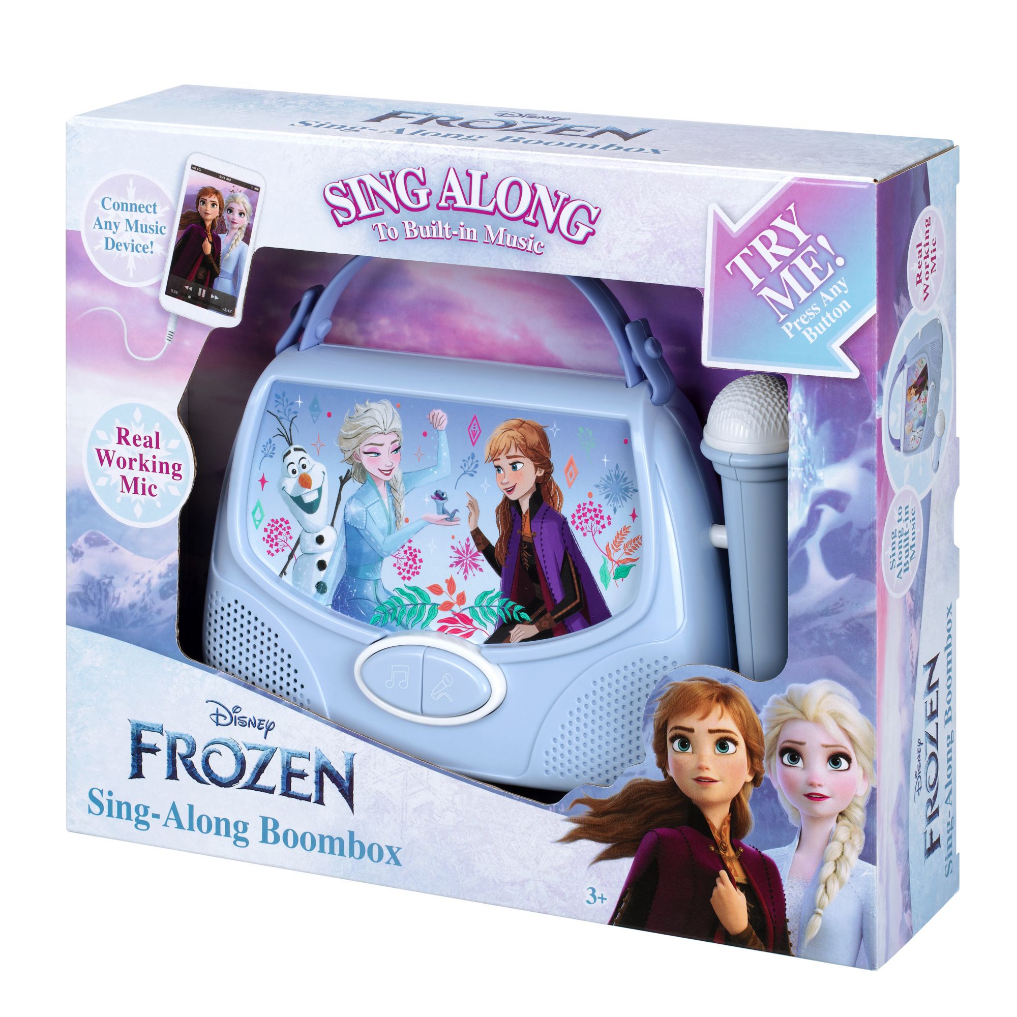 The Frozen Sing-Along Boombox lets you sing your heart out. Press the music button to play and extended clip of the hit song, "Let it Go", then press the microphone button to amplify your voice while you put on an amazing performance. Connect any music device via a 3.5mm jack to perform your favorite playlist too... Makes a great gift for any little Disney fan.