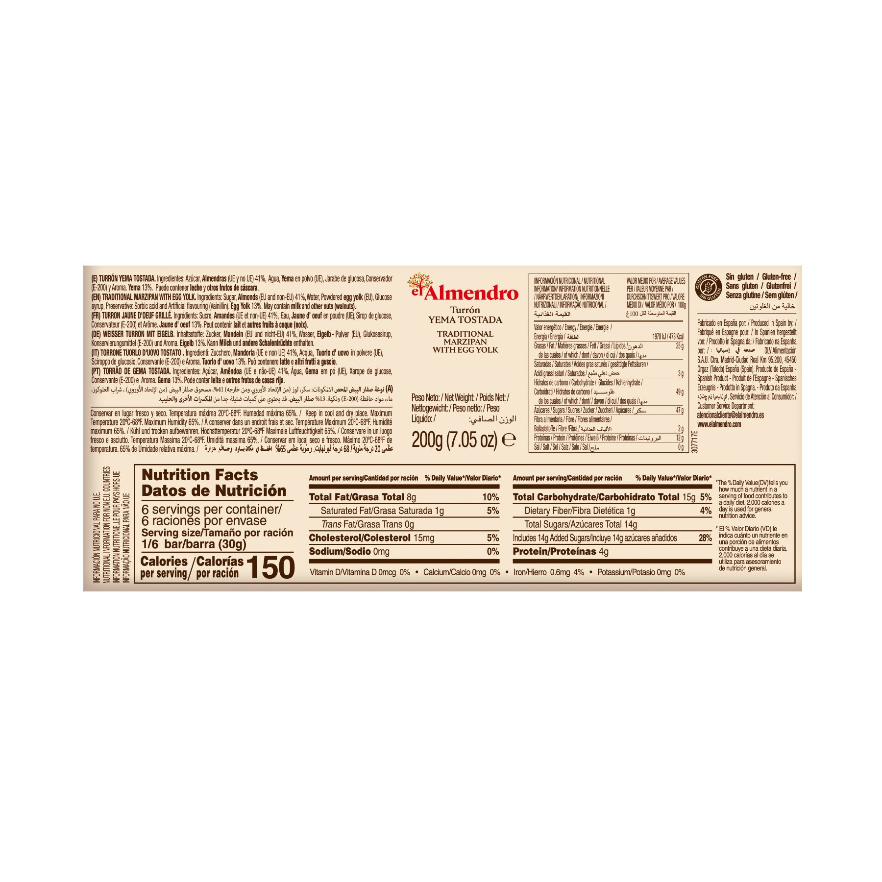 El Almendro Marzipan Turron is a delicious recipe of the Almond Confectionery. El Almendro has been an expert turron-maker since 1883. The products are made from carefully-selected premium ingredients to offer outstanding quality. Master turron-makers still produce these in the traditional way. The traditional recipe consists of mixing equal amounts of almonds and sugar. First, the raw almonds are submerged is water to obtain softness and consistency, then the almonds are mixed with sugar and ground into a coarse meal. Afterwards, the paste is refined using granite millstones and the egg yolk is added. Finally the product is placed into molds and slightly toasted finishing with the touch of burning the sugar on both sides giving the characteristic color and flavor .These delicious products are perfect for sharing with the whole family and will delight true turron lovers.