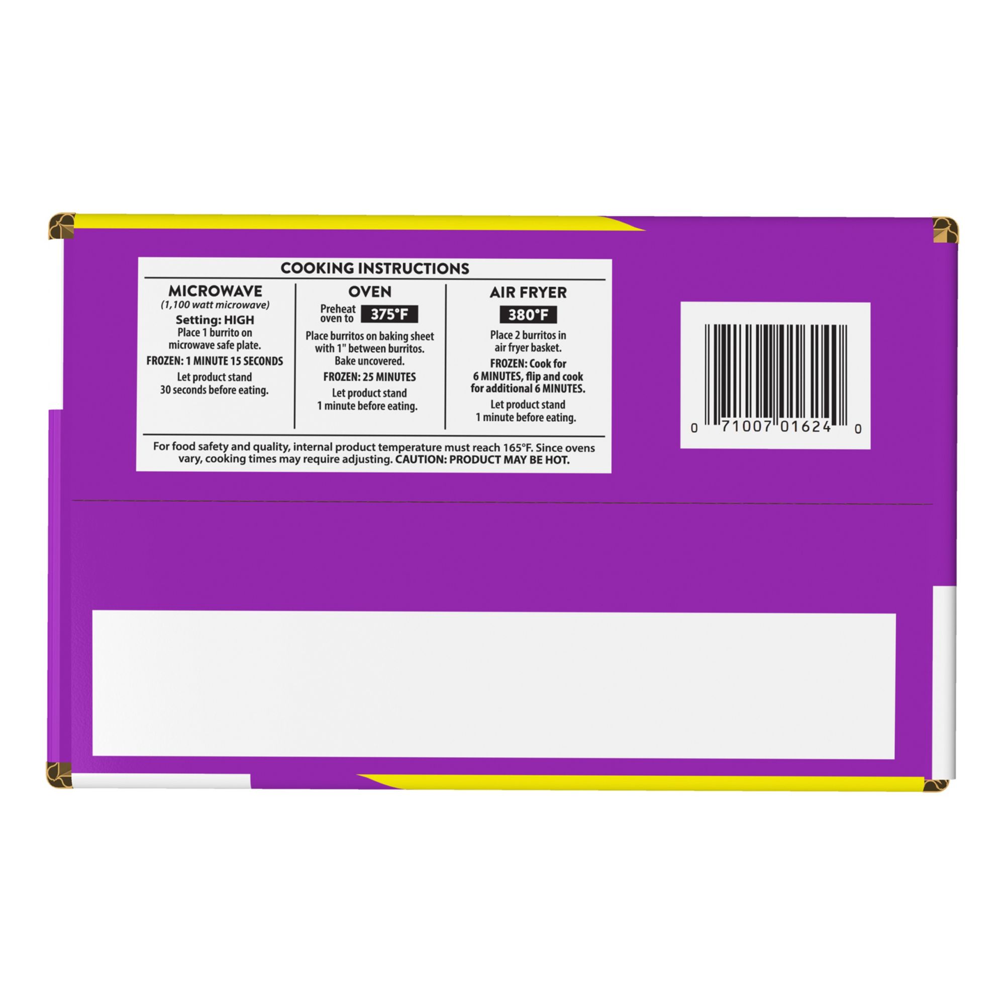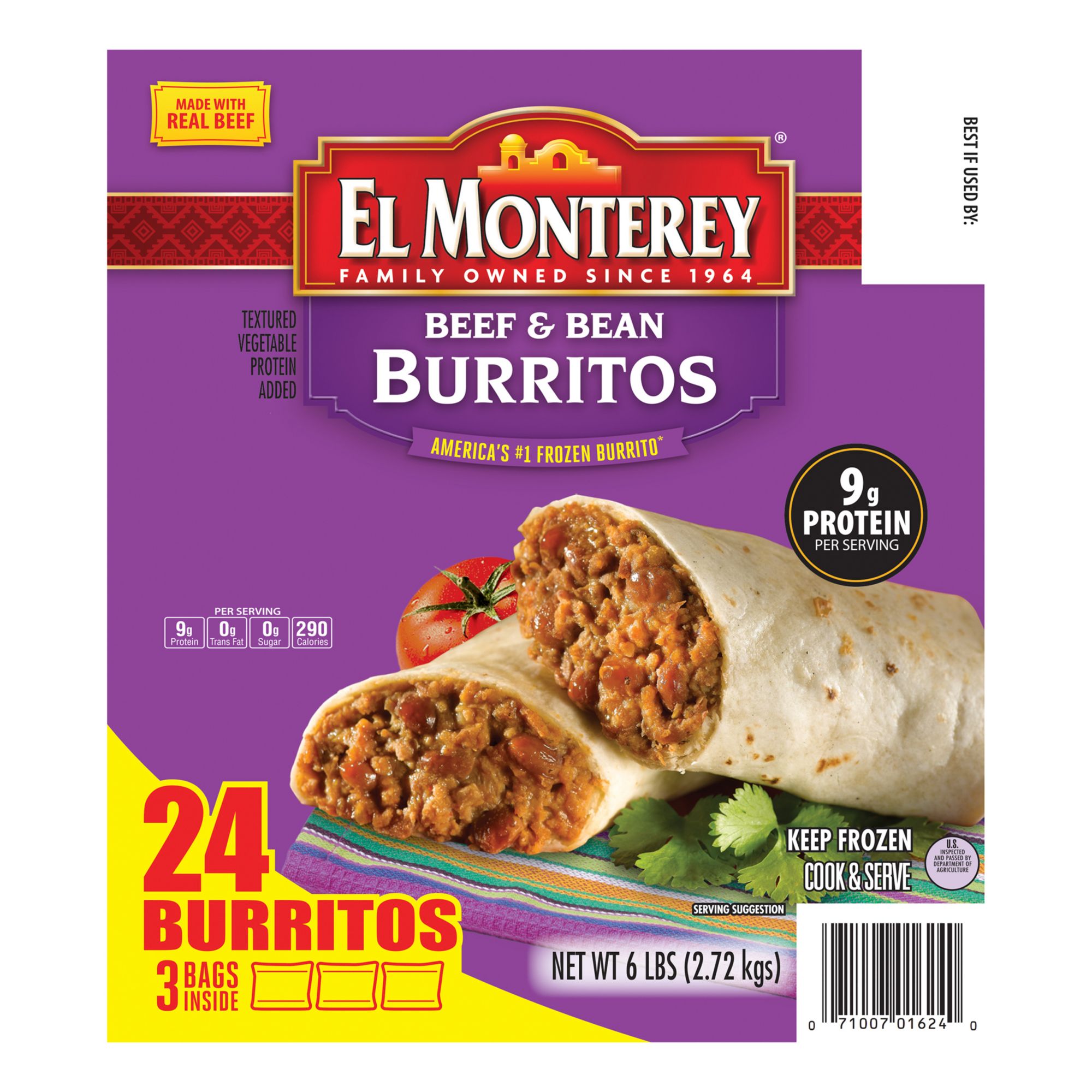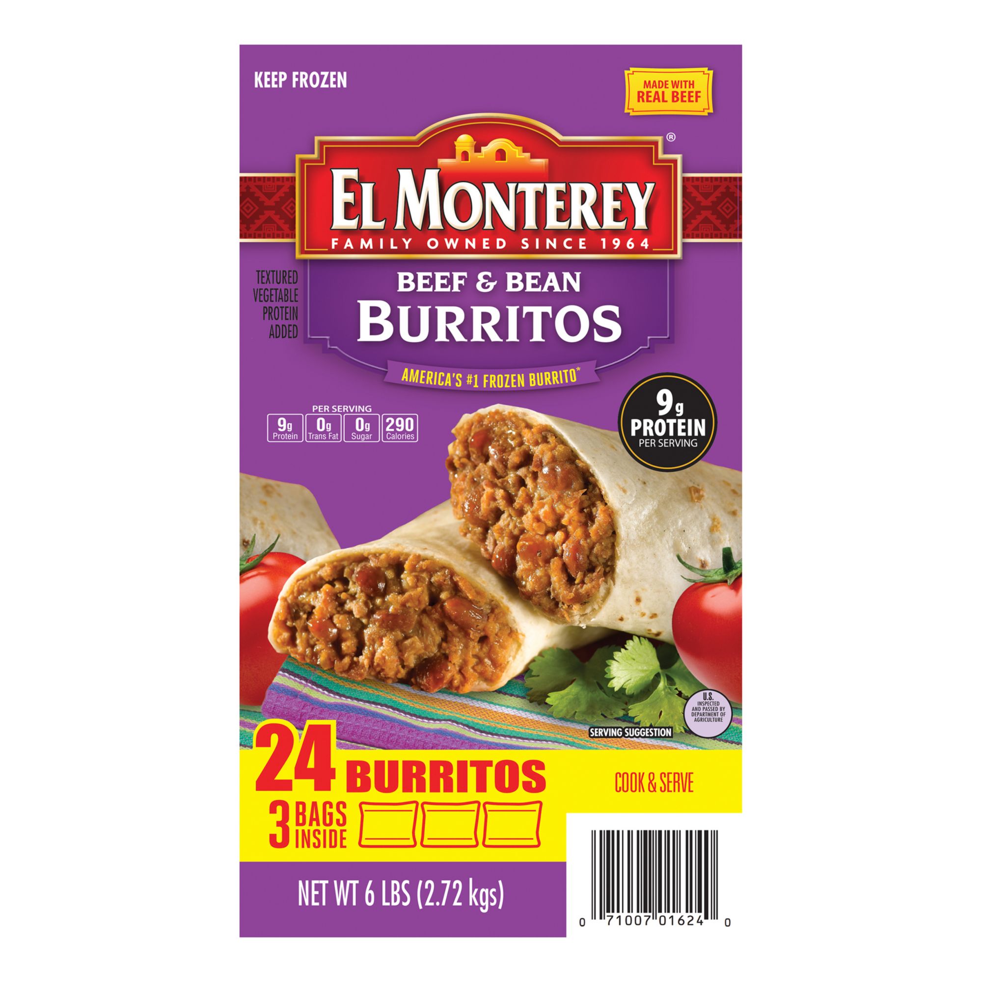 El Monterey 24 count microwavable beef and bean burritos are America's #1 frozen burrito. They make a quick and easy meal option for busy families. The beef and bean burritos can be microwaved, air fried or baked. Each burrito contains 9 grams of protein. There are 3 bags containing 8 burritos in the carton. Burritos are made with real Beef, 0 grams of trans fat, 0 grams of sugar and 290 calories.