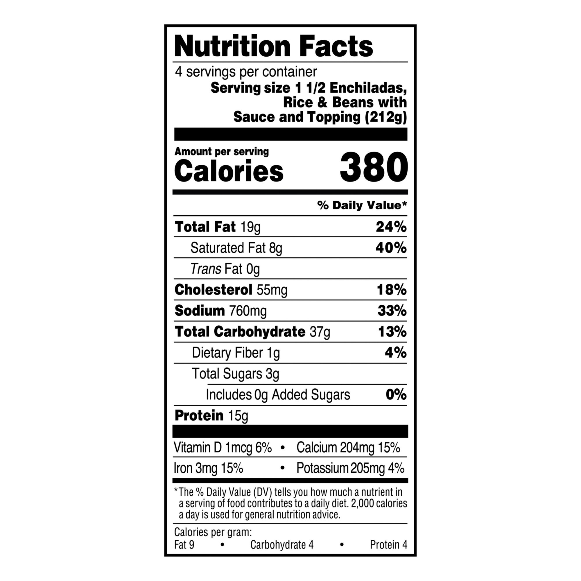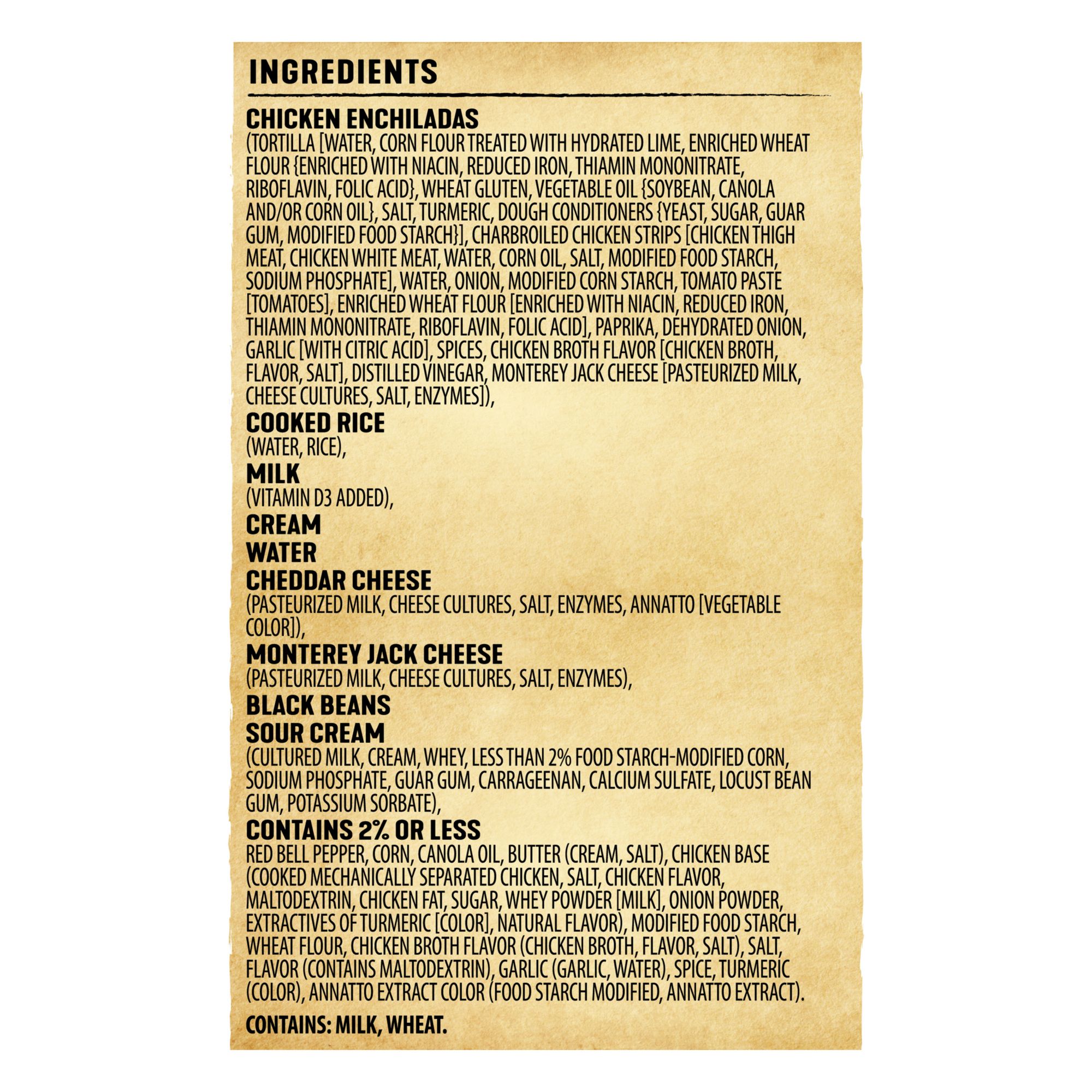 Ingredients: Chicken Enchiladas (Tortilla [Water, Corn Flour Treated With Hydrated Lime, Enriched Wheat Flour {Enriched With Niacin, Reduced Iron, Thiamin Mononitrate, Riboflavin, Folic Acid}, Wheat Gluten, Vegetable Oil {Soybean, Canola And/or Corn Oil}, Salt, Turmeric, Dough Conditioners {Yeast, Sugar, Guar Gum, Modified Food Starch}], Charbroiled Chicken Strips [Chicken Thigh Meat, Chicken White Meat, Water, Corn Oil, Salt, Modified Food Starch, Sodium Phosphate], Water, Onion, Modified Corn Starch, Tomato Paste [Tomatoes], Enriched Wheat Flour [Enriched With Niacin, Reduced Iron, Thiamin Mononitrate, Riboflavin, Folic Acid], Paprika, Dehydrated Onion, Garlic [With Citric Acid], Spices, Chicken Broth Flavor [Chicken Broth, Flavor, Salt], Distilled Vinegar, Monterey Jack Cheese [Pasteurized Milk, Cheese Cultures, Salt, Enzymes]), Cooked Rice (Water, Rice), Milk (Vitamin D3 Added), Cream, Water, Cheddar Cheese (Pasteurized Milk, Cheese Cultures, Salt, Enzymes, Annatto [Vegetable Color]), Monterey Jack Cheese (Pasteurized Milk, Cheese Cultures, Salt, Enzymes), Black Beans, Sour Cream (Cultured Milk, Cream, Whey, Less Than 2% Food Starch-modified Corn, Sodium Phosphate, Guar Gum, Carrageenan, Calcium Sulfate, Locust Bean Gum, Potassium Sorbate), Contains 2% Or Less: Red Bell Pepper, Corn, Canola Oil, Butter (Cream, Salt), Chicken Base (Cooked Mechanically Separated Chicken, Salt, Chicken Flavor, Maltodextrin, Chicken Fat, Sugar, Whey Powder [Milk], Onion Powder, Extractives Of Turmeric [Color], Natural Flavor), Modified Food Starch, Wheat Flour, Chicken Broth Flavor (Chicken Broth, Flavor, Salt), Salt, Flavor (Contains Maltodextrin), Garlic (Garlic, Water), Spice, Turmeric (Color), Annatto Extract Color (Food Starch Modified, Annatto Extract). Contains: Milk, Wheat.