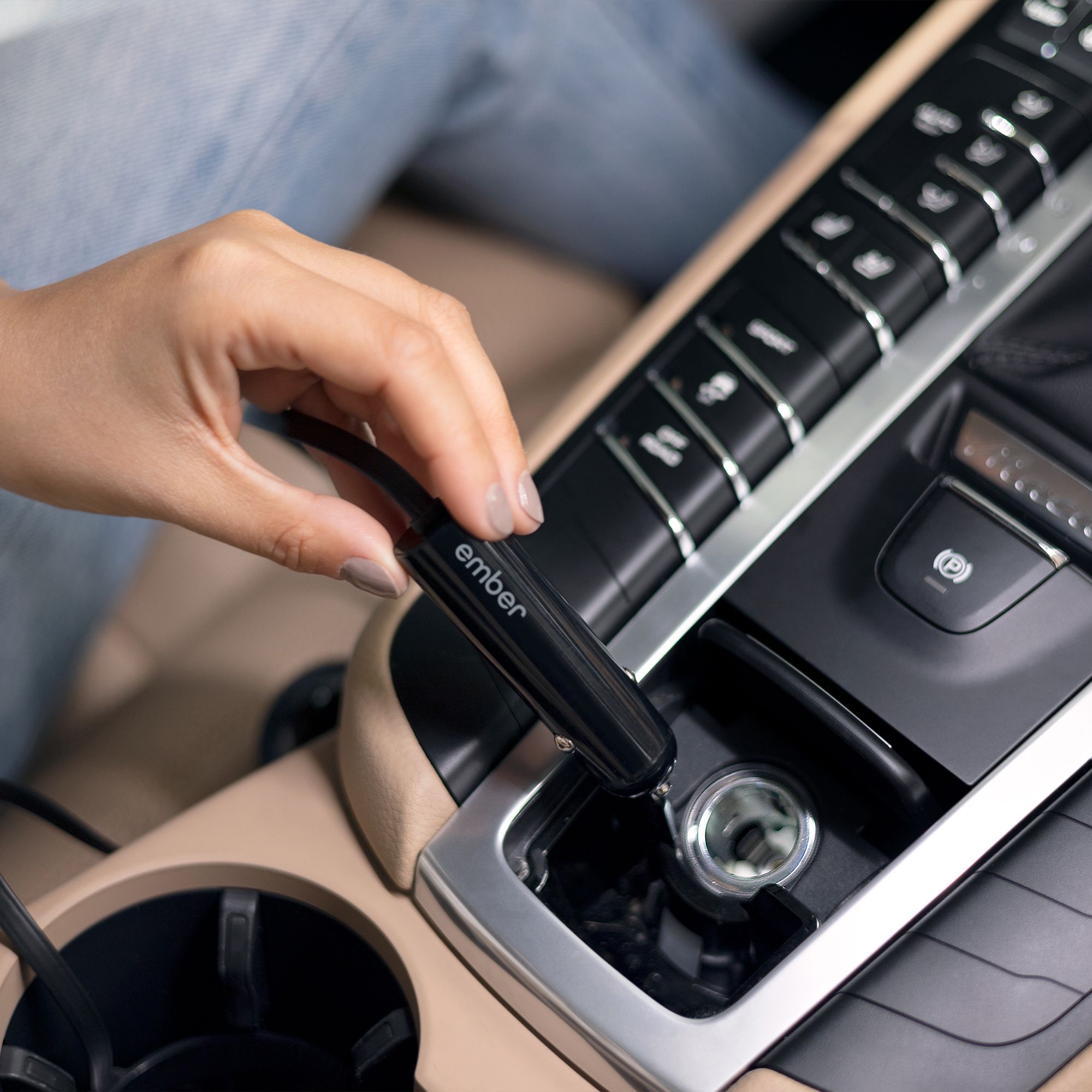 Ember Car Charger plugs into car via 12V power outlet (Cigarette Lighter)