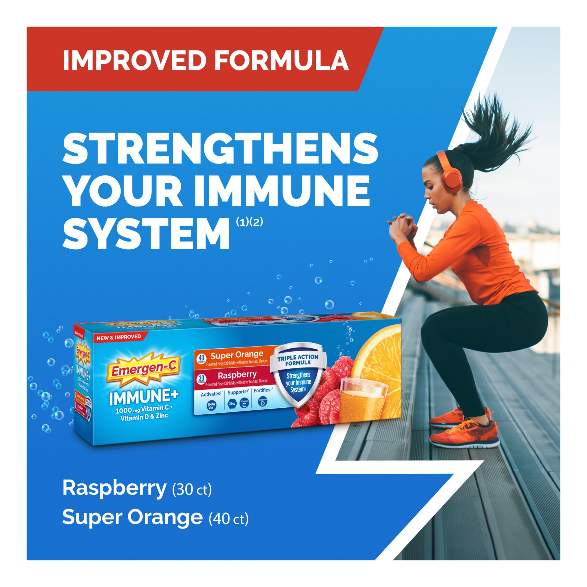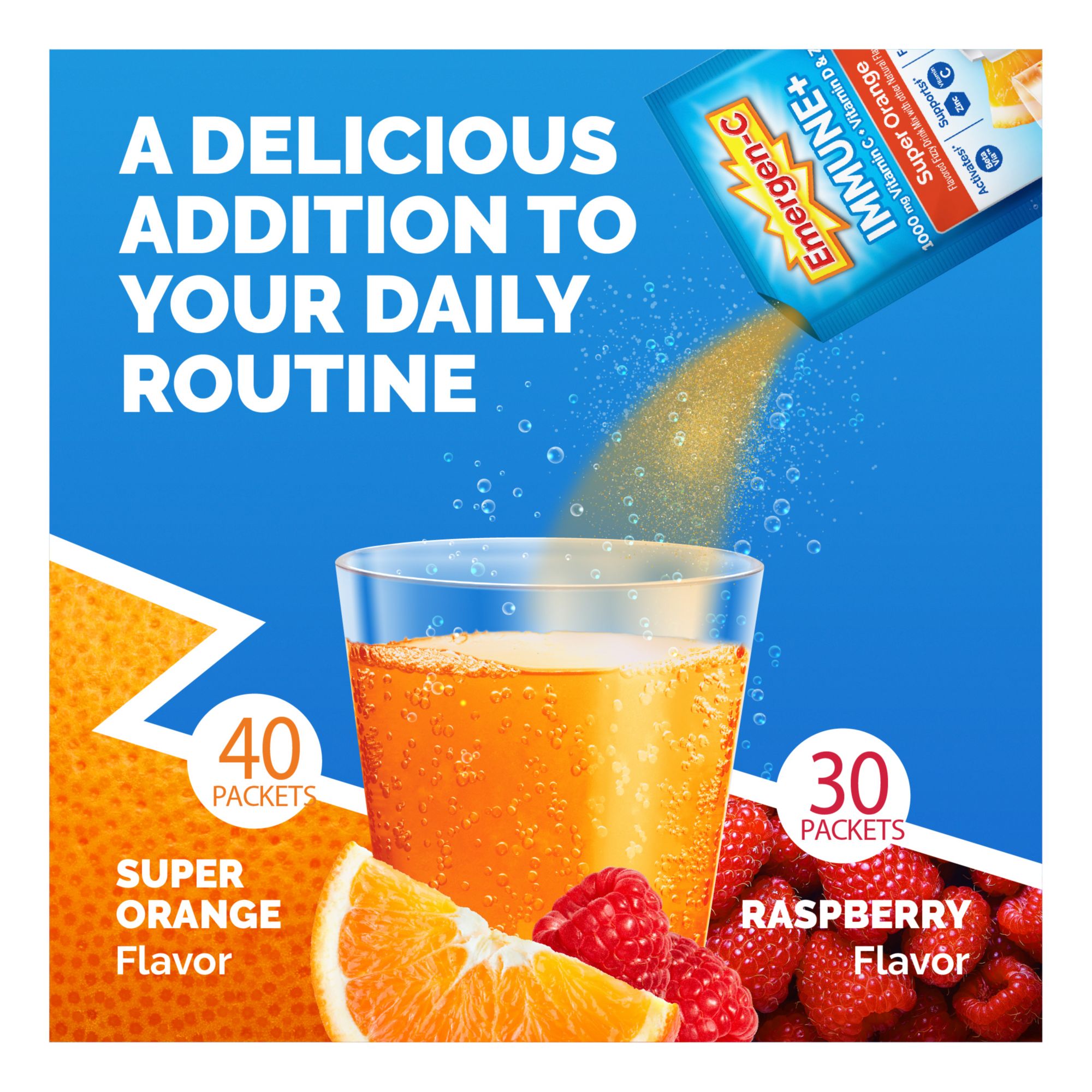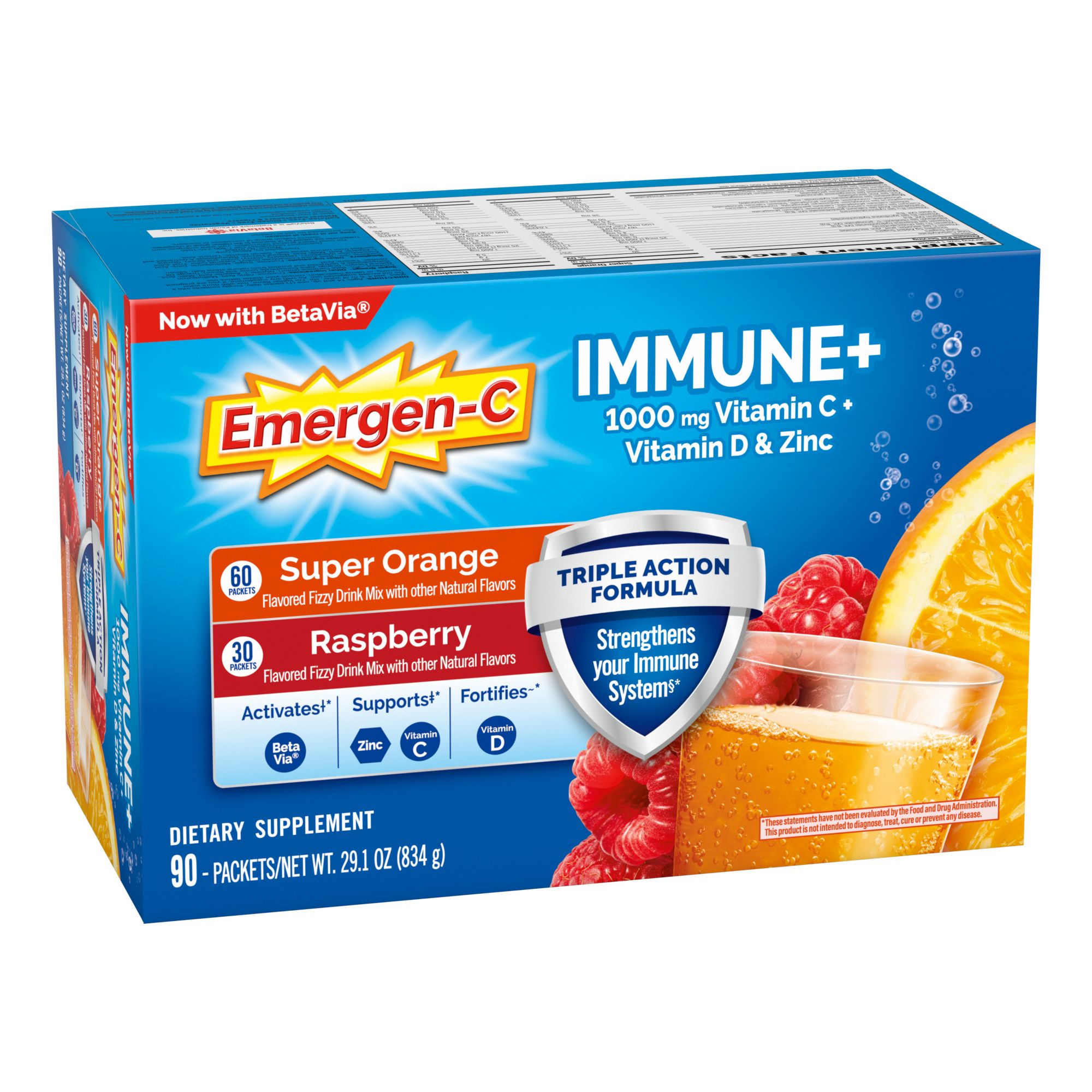 Emergen-C Immune+ Triple Action Vitamin C Powder, BetaVia (R) Raspberry and Super Orange, 90 ct.
