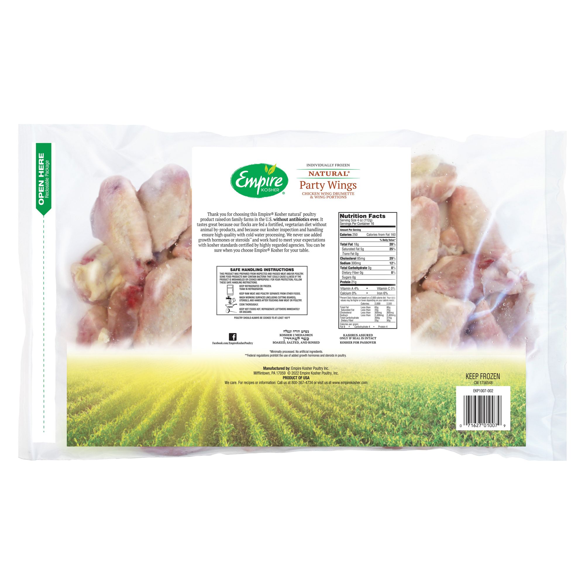 Empire Kosher Chicken Party Wings are individually quick frozen, packaged in a resealable bag for multiple day/meal use. Chicken Wings are cut into party wing pieces, with drumette and wing portions, creating an easy hand-held appetizer or snack. Product is raw and needs to be cooked to at least 165 degrees F. Chicken is raised on family farms in the USA without antibiotics ever - No hormones or steroids. Product is Kosher for Passover.