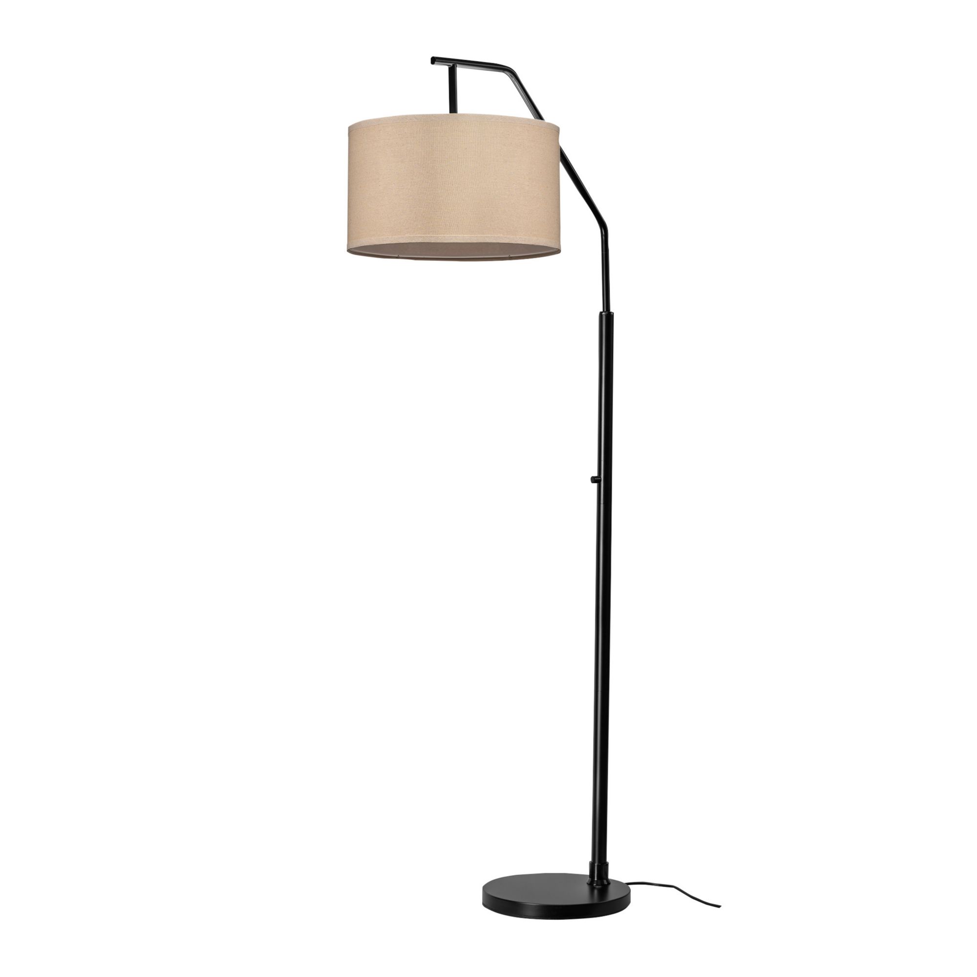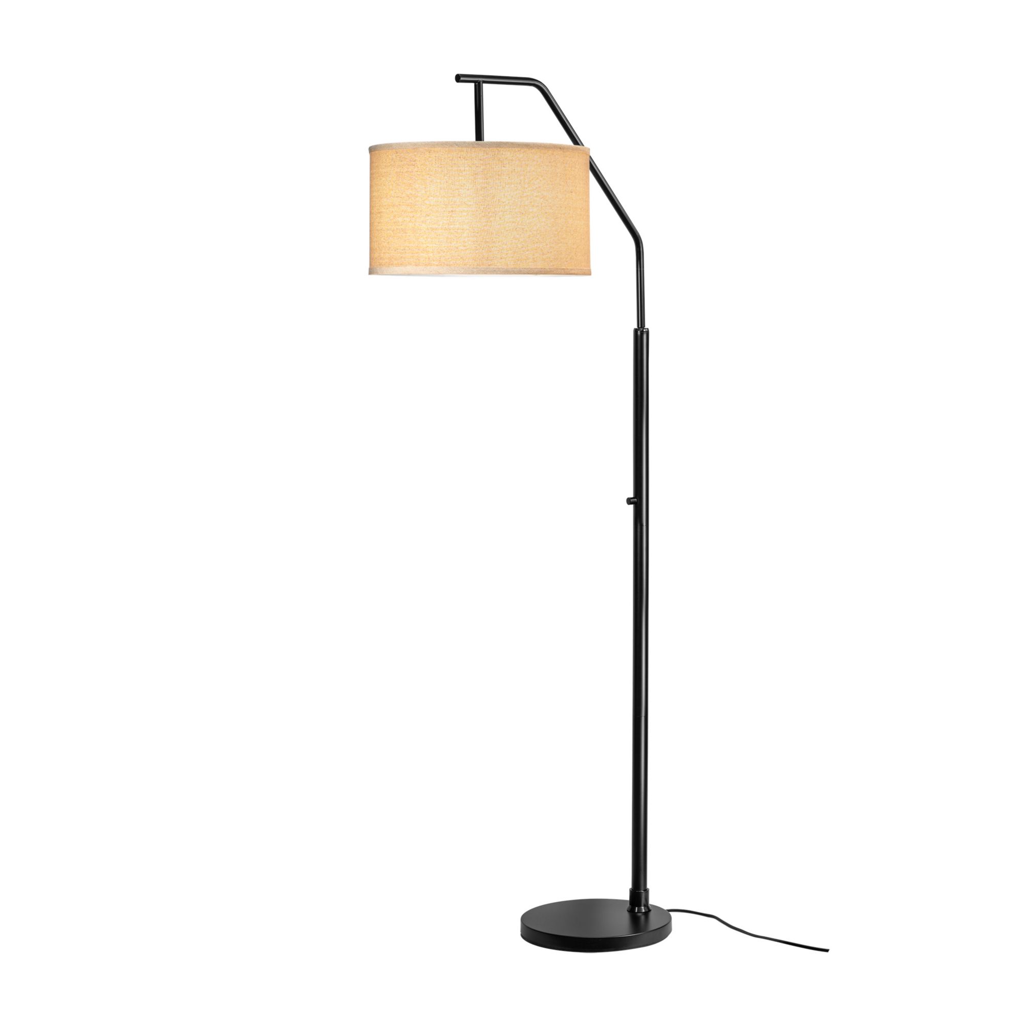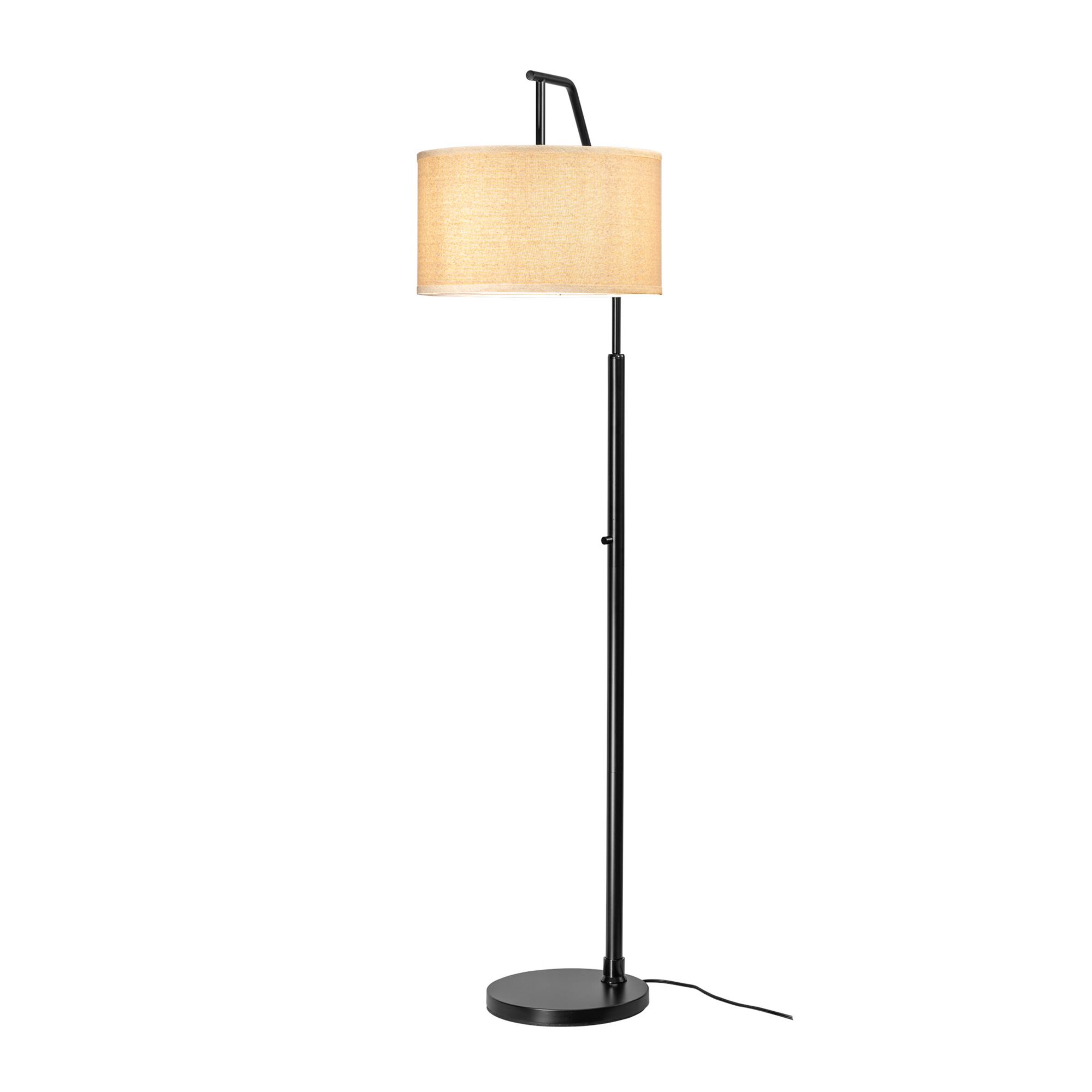 Solid iron construction Off-white fabric shade Rotary switch Adjustable height with locking hinge Requires one E26 40W max. bulb or LED equivalent (bulb not included) Matte black finish Includes floor lamp, lamp shade, instruction manual