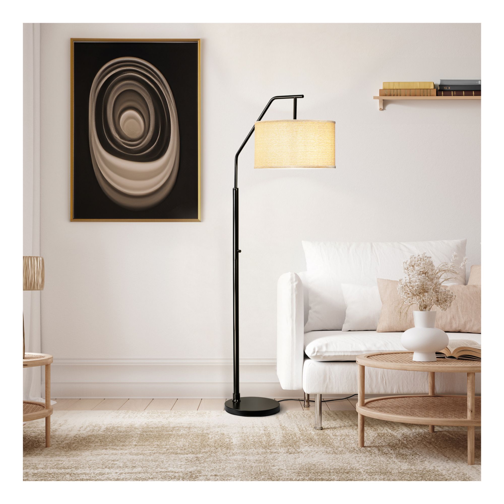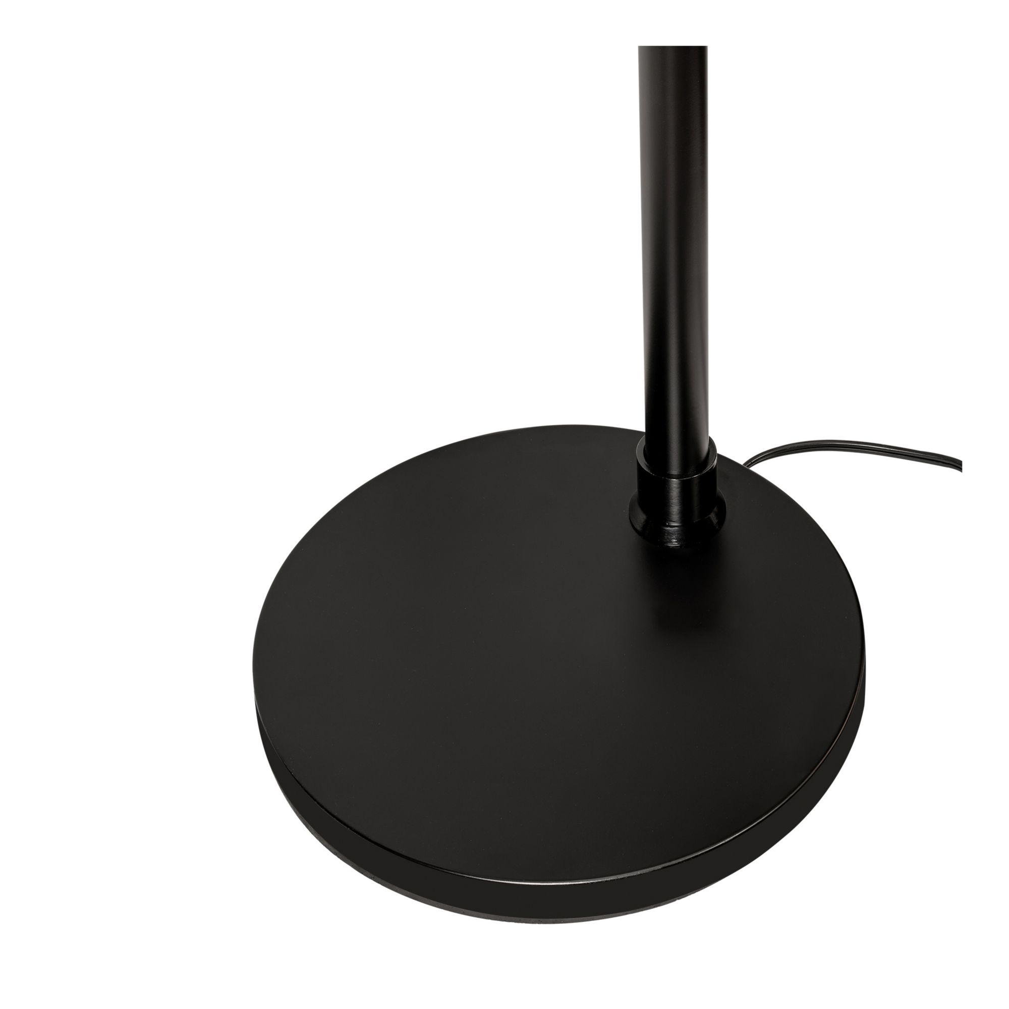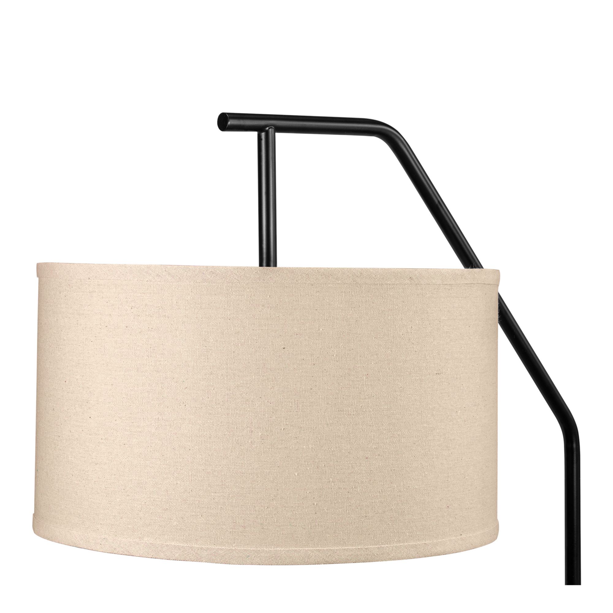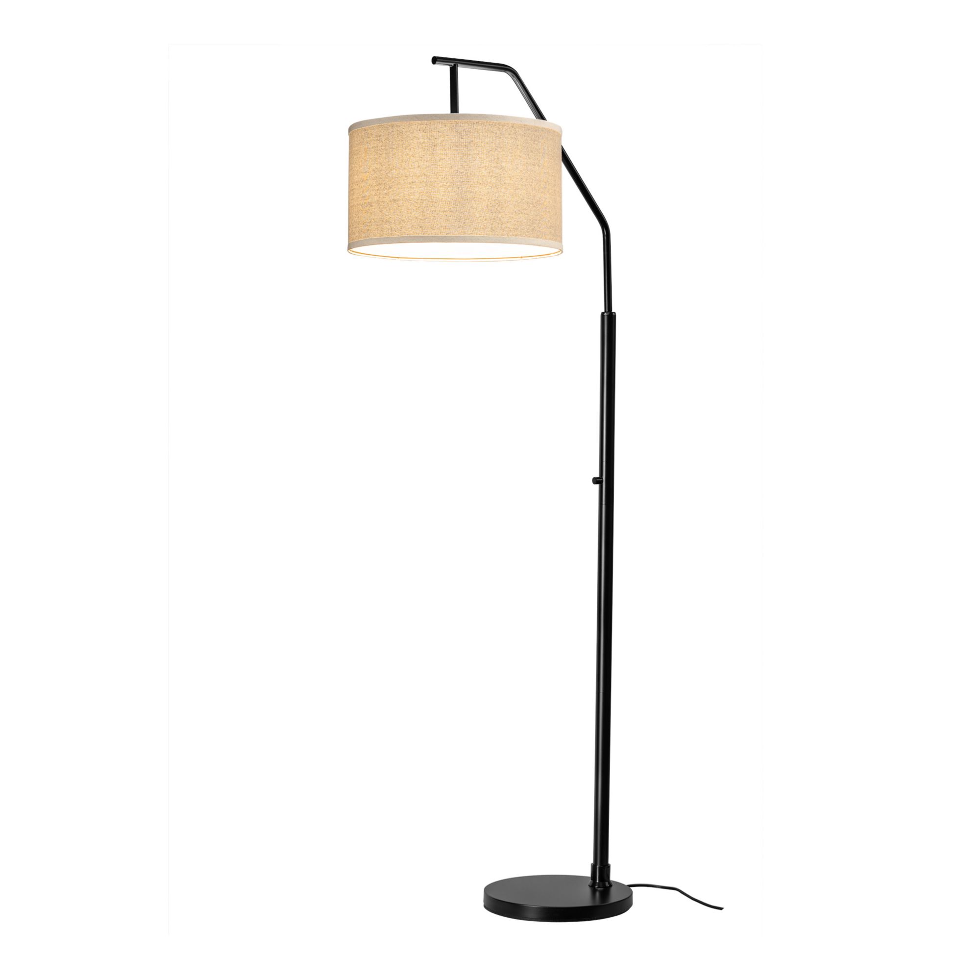 Solid iron construction Off-white fabric shade Rotary switch Adjustable height with locking hinge Requires one E26 40W max. bulb or LED equivalent (bulb not included) Matte black finish Includes floor lamp, lamp shade, instruction manual