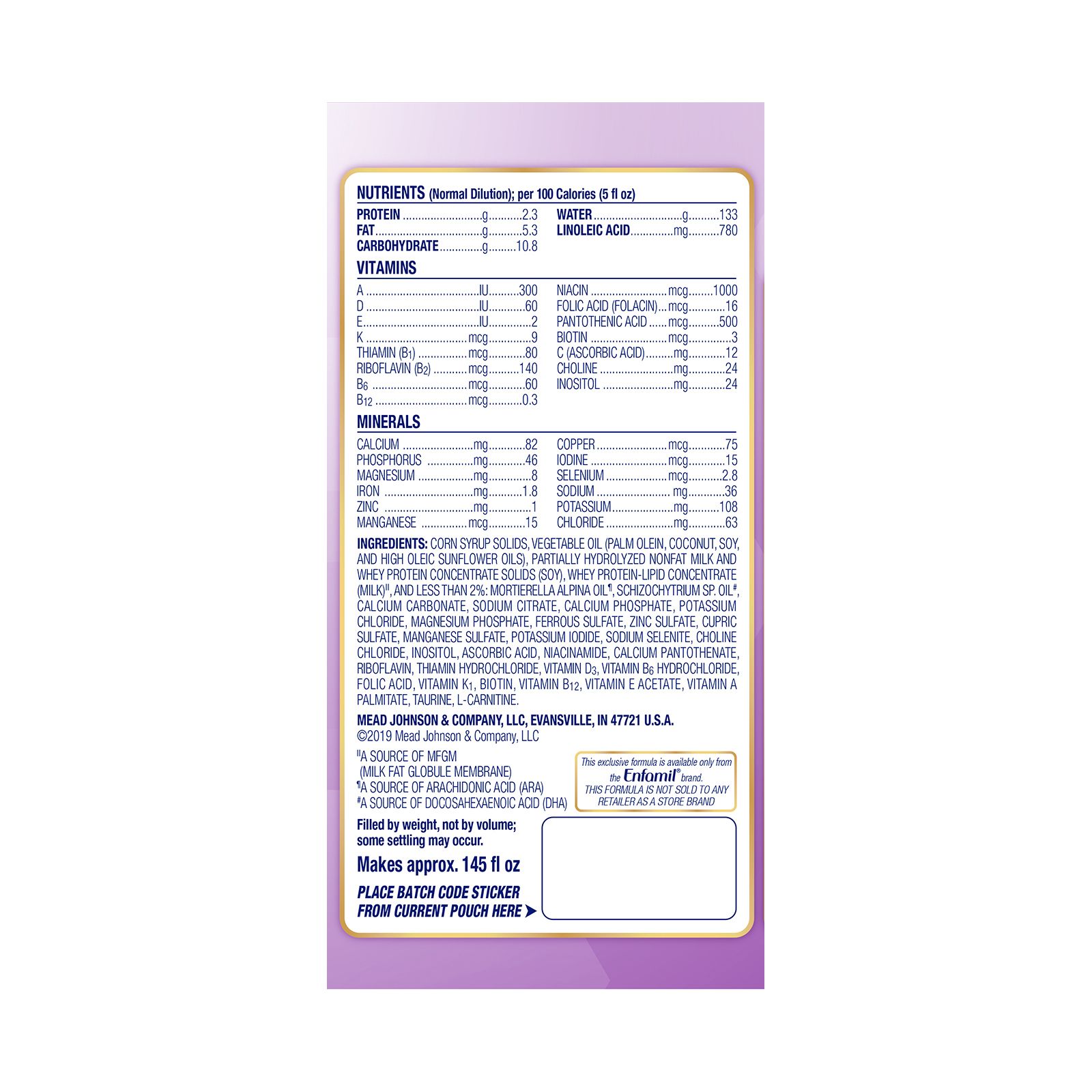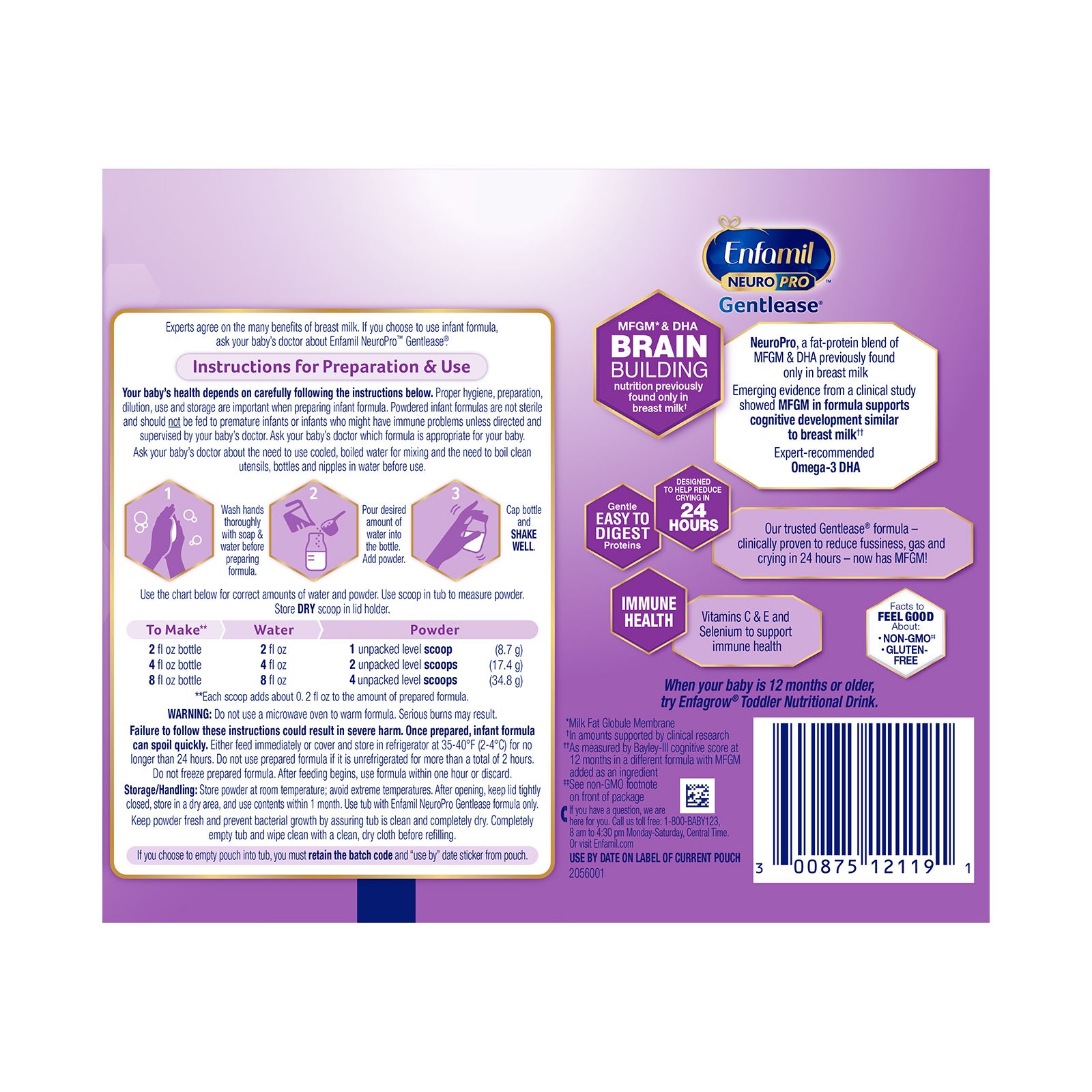 Introducing Enfamil NeuroPro Gentlease. Enfamil's trusted Gentlease baby formula, clinically proven to reduce fussiness, colic, baby gas, and crying within 24 hours, now has MFGM that provides brain support first. Emerging evidence from a recent clinical study showed MFGM in baby formula supports cognitive development similar to breast milk.* NeuroPro is the only infant formula that has a fat-protein blend of MFGM & Omega 3 DHA, previously only found in breast milk. So you can get nutrition for brain support inspired by breast milk from the baby formula brand that's #1 recommended by Pediatricians**. It offers complete nutrition for babies through 12 months with Omega 3 DHA and Choline, important nutrients for brain support, easy-to-digest proteins, and baby probiotics for immune support.
