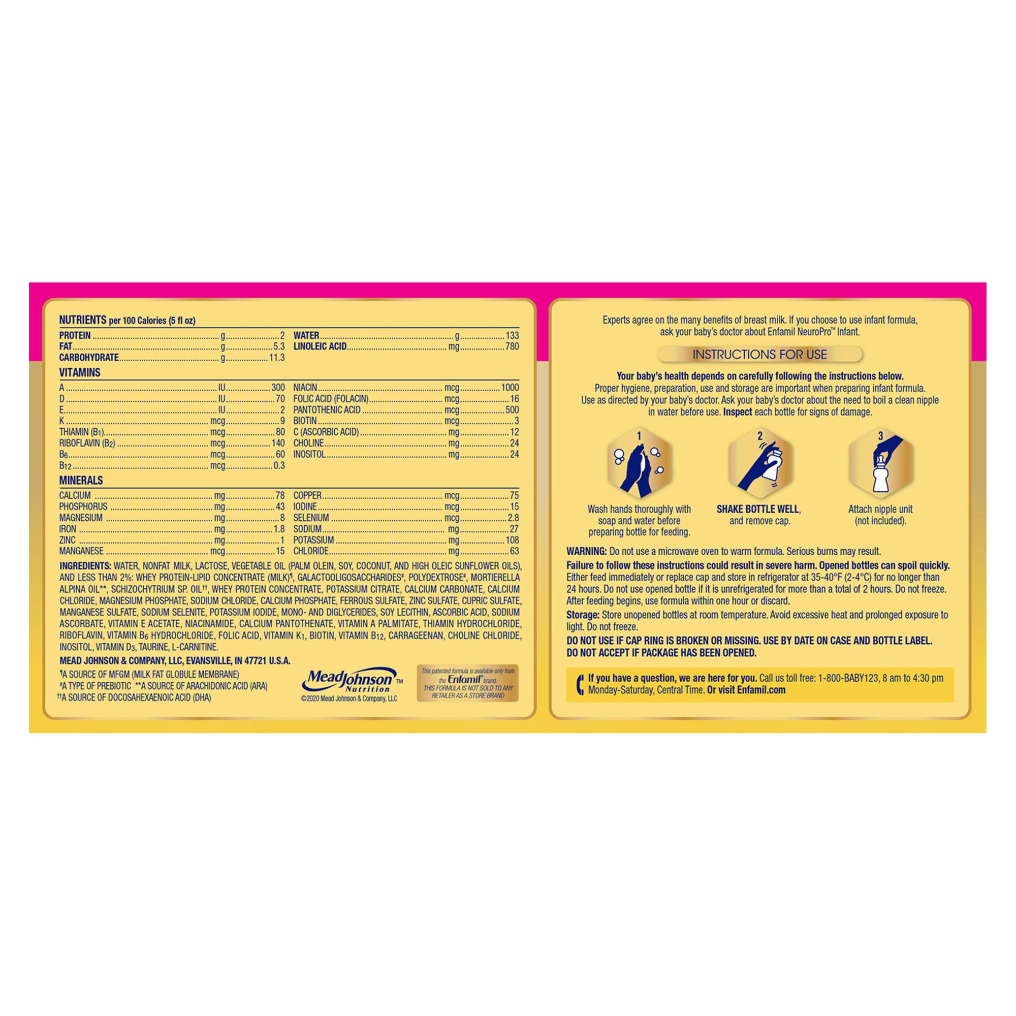 Introducing Enfamil NeuroPro baby formula. Enfamil is backed by decades of research on breast milk and multiple clinical studies on its brain support nutrition. Emerging evidence from a recent clinical study showed MFGM in infant formula supports cognitive development similar to breast milk. NeuroPro is the only baby formula that has a fat protein blend of MFGM and Omega 3 DHA and previously only found in breast milk. So you can get nutrion for brain support inspired by breast milk from the infant formula brand that's #1 recommended by Pediatricians. It offers complete nutrition for babies through 12 months, omega 3 DHA, Choline, easy to digest proteins and probiotics for immune support. *As measured by Bayley III cognitive score at 12 months in a different formula with MFGM added as an ingredient. The ready-to-use bottles are perfect for both late-night and on-the-go feedings.