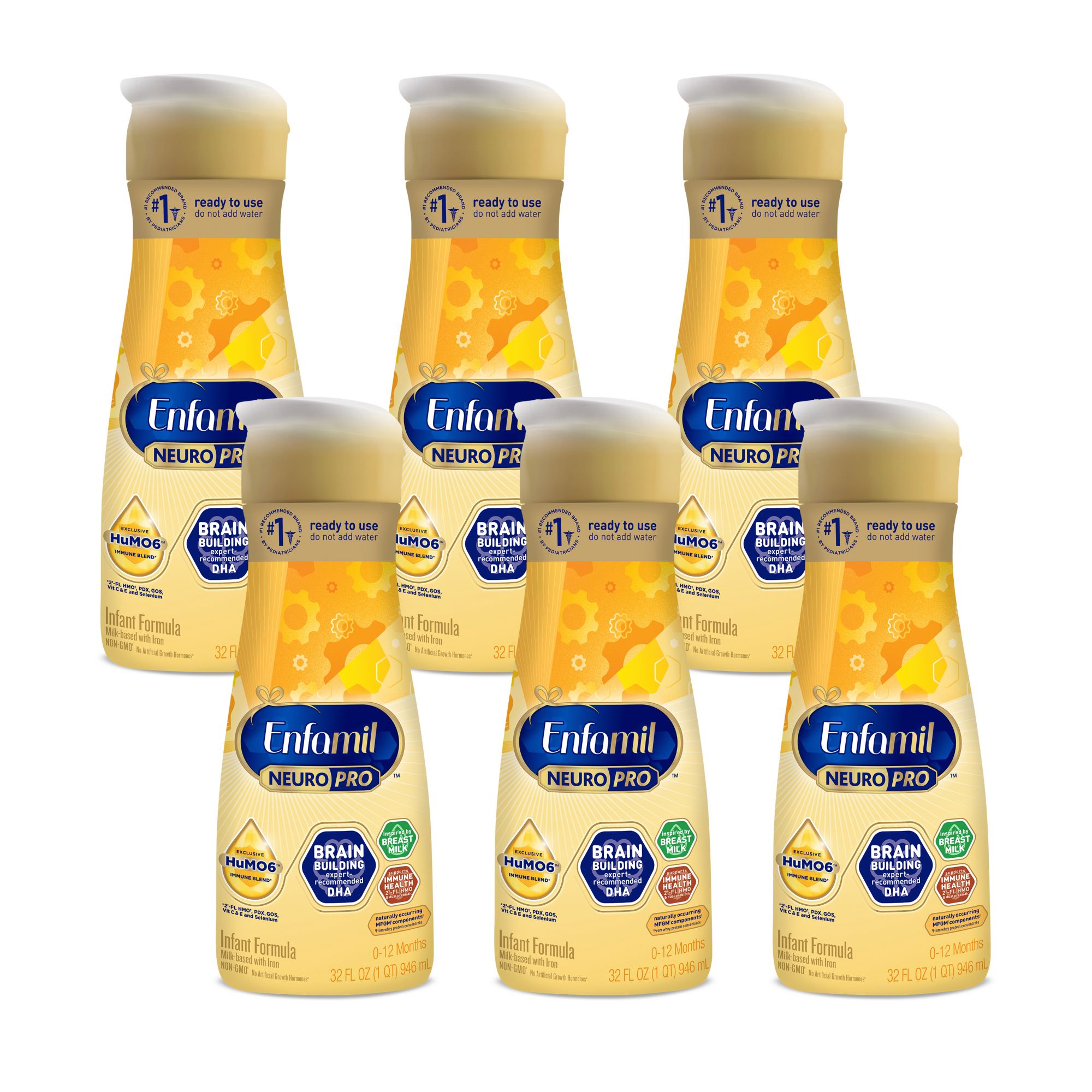 Enfamil NeuroPro Baby Formula, Milk-Based Infant Nutrition, MFGM* 5-Year Benefit, Expert-Recommended Brain-Building Omega-3 DHA, Exclusive HuMO6 Immune Blend, Non-GMO 5-Year Benefit: MFGM components clinically shown to support cognitive, motor & communication development now through age 5 HuMO6 Immune Blend§: Enfamil NeuroPro features our exclusive HuMO6 immune blend, to support your baby's immune system, because your baby's well-being is our top priority Ready to Use: Convenient and ready to use bottles, perfect for on-the-go moms Nutrition Designed for your Infant: Designed with care for babies up to 12 months, Enfamil formula includes easy-to-digest proteins, vitamins & minerals Trusted by Parents & Pediatricians*: Enfamil is the #1 Trusted Infant Formula Brand By Pediatricians* & Parents and the #1 Trusted Brand for Brain-Building & Immune Support Includes Enfamil NeuroPro baby formula, 6 ct./32 oz.