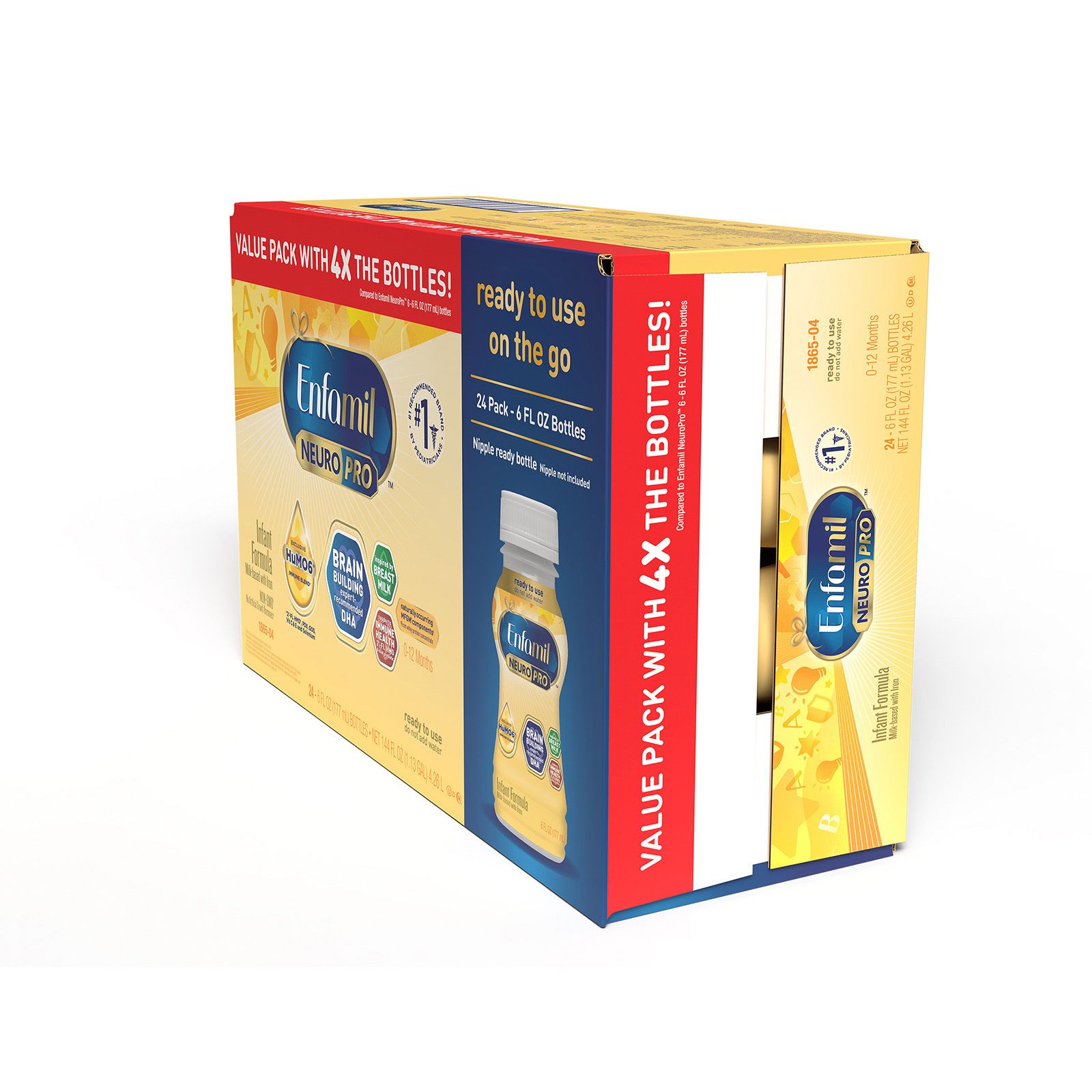 Enfamil NeuroPro Baby Formula, Milk-Based Infant Nutrition, MFGM* 5-Year Benefit, Expert-Recommended Brain-Building Omega-3 DHA, Exclusive HuMO6 Immune Blend, Non-GMO 5-Year Benefit: MFGM components clinically shown to support cognitive, motor & communication development now through age 5 HuMO6 Immune Blend§: Enfamil NeuroPro features our exclusive HuMO6 immune blend, to support your baby's immune system, because your baby's well-being is our top priority Ready to Use: Convenient and ready to use bottles, perfect for on-the-go moms Nutrition Designed for your Infant: Designed with care for babies up to 12 months, Enfamil formula includes easy-to-digest proteins, vitamins & minerals Trusted by Parents & Pediatricians*: Enfamil is the #1 Trusted Infant Formula Brand By Pediatricians* & Parents and the #1 Trusted Brand for Brain-Building & Immune Support *As measured by Bayley-III cognitive score at 12 months in a different formula with MFGM added as an ingredient. Includes Enfamil NeuroPro baby formula 24 ct. 6 oz bottles