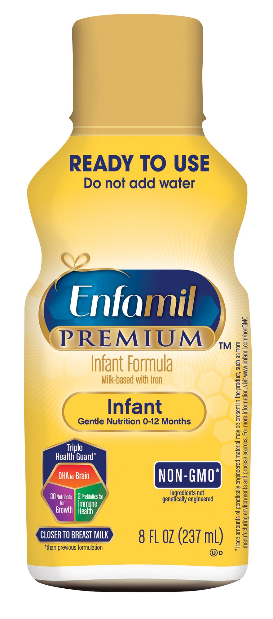 As babies grow and develop, they reach new and more complex milestones. These milestones are driven by cognitive, motor, social and communication areas of the brain.Enfamil Premium Ready-to-Use Liquid Infant Formula is milk-based with an iron formula that has choline and DHA, which is recommended by experts and important for infant brain nourishment and development. It also contains the Natural Defense Dual Prebiotics blend designed to help support baby's own natural defenses. This formula provides a blend that's closer to natural breast milk than ever before so you know baby is getting the very best.