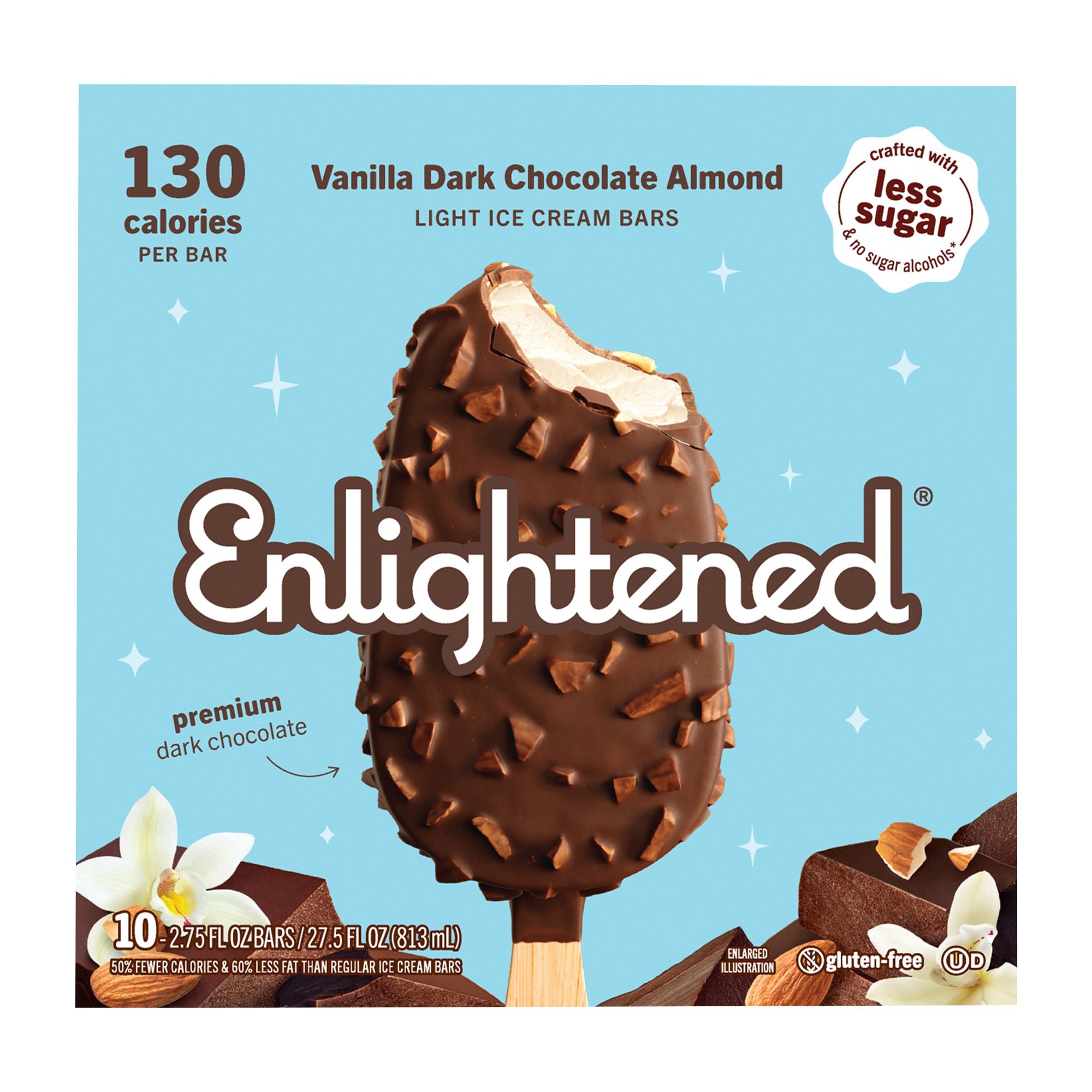 Tall, dark and delicious. Decadent vanilla ice cream enrobed in a shell of dark chocolate rolled in almonds. Your taste buds are about to find out just how creamy and flavorful a light ice cream bar made with less sugar can be. With luck like that, they ought to buy a lottery ticket.
