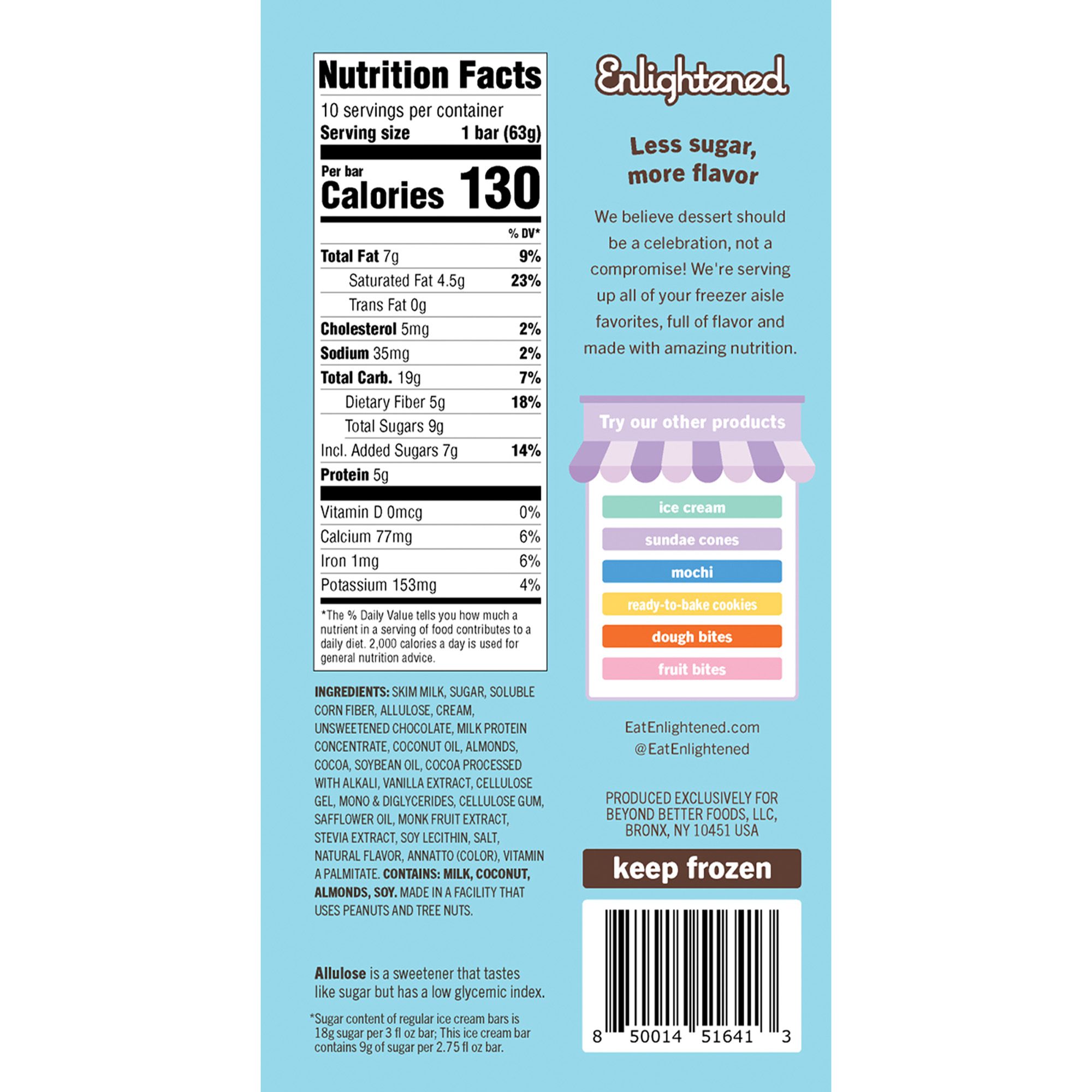 Ingredients: Skim Milk, Sugar, Soluble Corn Fiber, Allulose, Cream, Unsweetened Chocolate, Milk Protein Concentrate, Coconut Oil, Almonds, Cocoa, Soybean Oil, Cocoa Processed With Alkali, Vanilla Extract, Cellulose Gel, Mono & Diglycerides, Cellulose Gum, Safflower Oil, Monk Fruit Extract, Stevia Extract, Soy Lecithin, Salt, Natural Flavor, Annatto (Color), Vitamin A Palmitate.