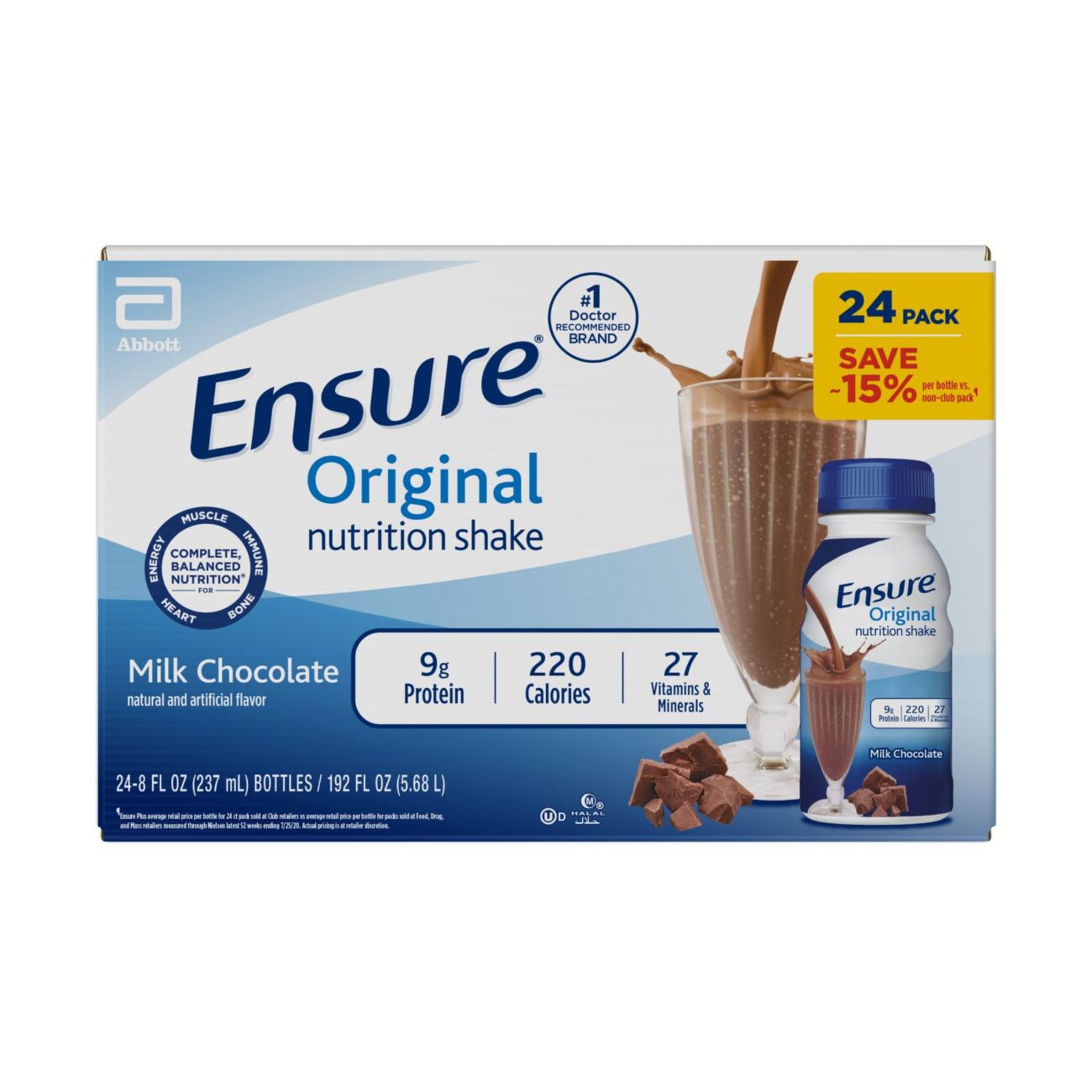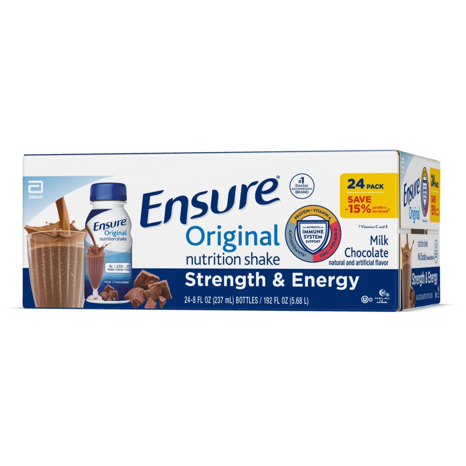 Ensure Original nutrition shakes with 9g of high-quality protein provide easy and delicious complete, balanced nutrition. Our shakes contain protein, vitamins A and D, zinc, and antioxidants (vitamins C & E) to support immune health. This nutritional drink is suitable for lactose intolerance* and gluten-free. Enjoy Ensure as a small meal replacement, with a meal, or as a delicious snack to help maintain proper nutrition. From the #1 doctor-recommended‡ nutritional drink brand. * Not for people with galactosemia. † Contains 68 mg (25% more of the DV) vs 45 mg of vitamin C and 8 mcg (15% more of the DV) vs 5 mcg of vitamin D per serving in previous formulation. ‡ Among doctors who recommend liquid nutritional products to their patients.