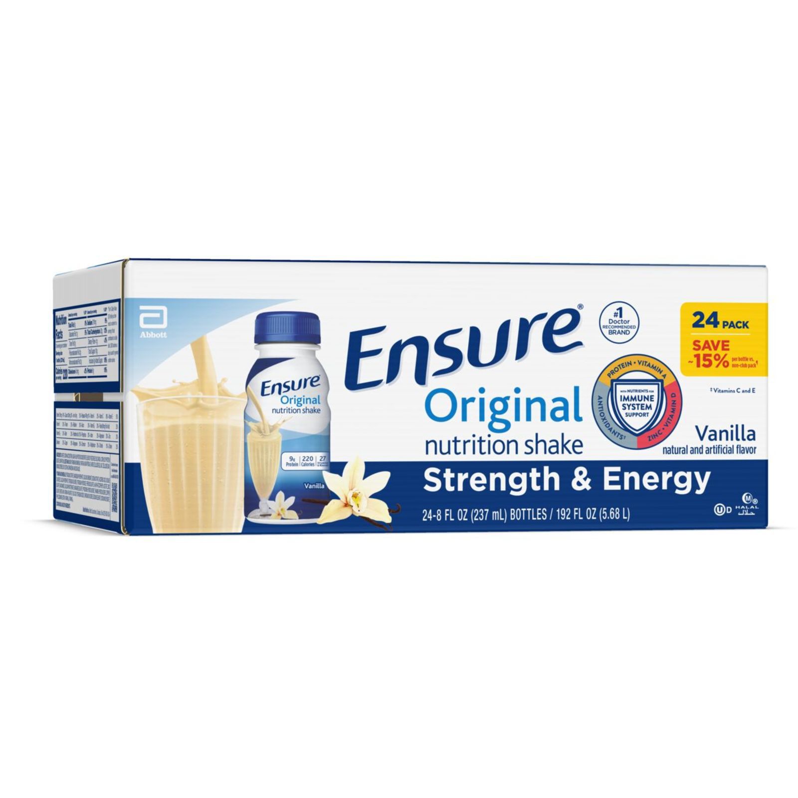 Ensure Original nutrition shakes with 9g of high-quality protein provide easy and delicious complete, balanced nutrition. Our shakes contain protein, vitamins A and D, zinc, and antioxidants (vitamins C & E) to support immune health. This nutritional drink is suitable for lactose intolerance* and gluten-free. Enjoy Ensure as a small meal replacement, with a meal, or as a delicious snack to help maintain proper nutrition. From the #1 doctor-recommended‡ nutritional drink brand. * Not for people with galactosemia. † Contains 68 mg (25% more of the DV) vs 45 mg of vitamin C and 8 mcg (15% more of the DV) vs 5 mcg of vitamin D per serving in previous formulation. ‡ Among doctors who recommend liquid nutritional products to their patients.