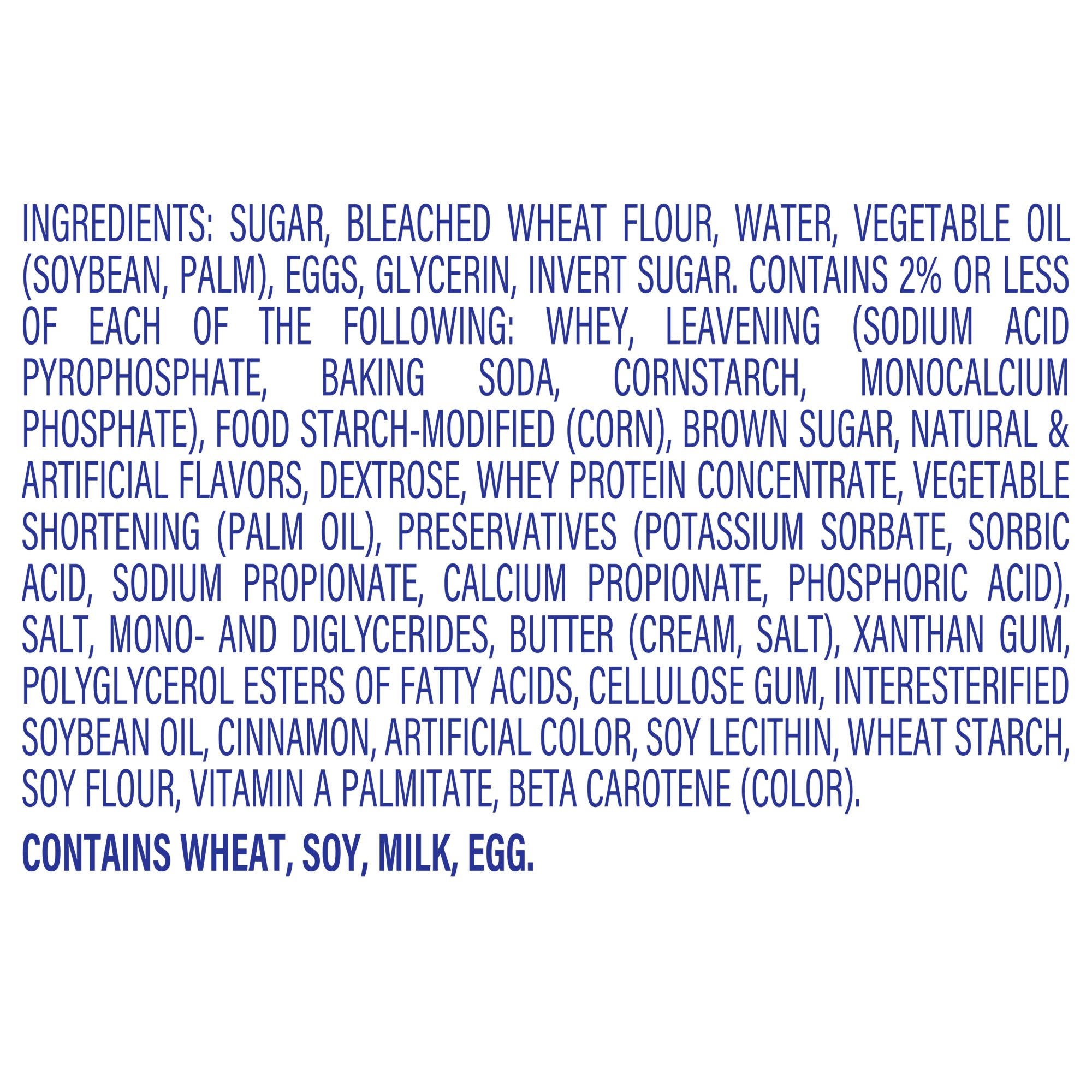 Ingredients: Sugar, Bleached Wheat Flour, Water, Vegetable Oil (Soybean, Palm), Eggs, Glycerin, Invert Sugar, Contains 2% Or Less Of Each Of The Following: [Whey, Leavening [Sodium Acid Pyrophosphate, Baking Soda, Cornstarch, Monocalcium Phosphate], Food Starch-Modified (Corn), Brown Sugar, Natural & Artificial Flavors, Dextrose, Whey Protein Concentrate, Vegetable Shortening (Palm), Preservatives [Potassium Sorbate, Sorbic Acid, Sodium Propionate, Calcium Propionate, Phosphoric Acid], Salt, Mono- And Diglycerides, Butter [Cream, Salt], Xanthan Gum, Polyglycerol Esters Of Fatty Acids, Cellulose Gum, Interesterified Soybean Oil, Cinnamon, Artificial Color, Soy Lecithin, Wheat Starch, Soy Flour, Vitamin A Palmitate, Beta Carotene (Color)].