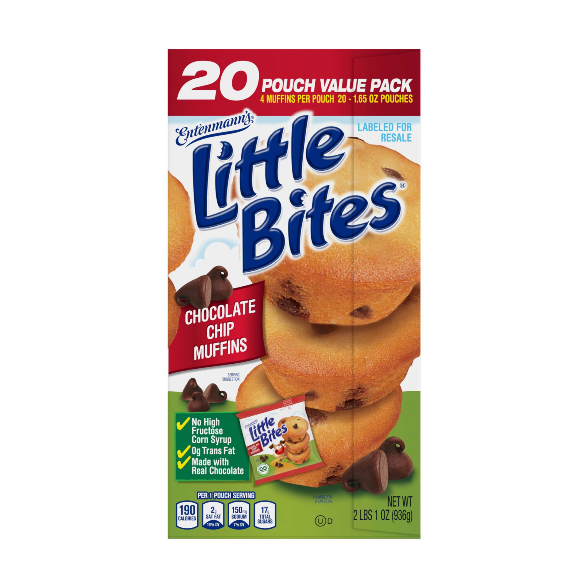 - Includes twenty packs of 1.65-oz. chocolate chip muffins