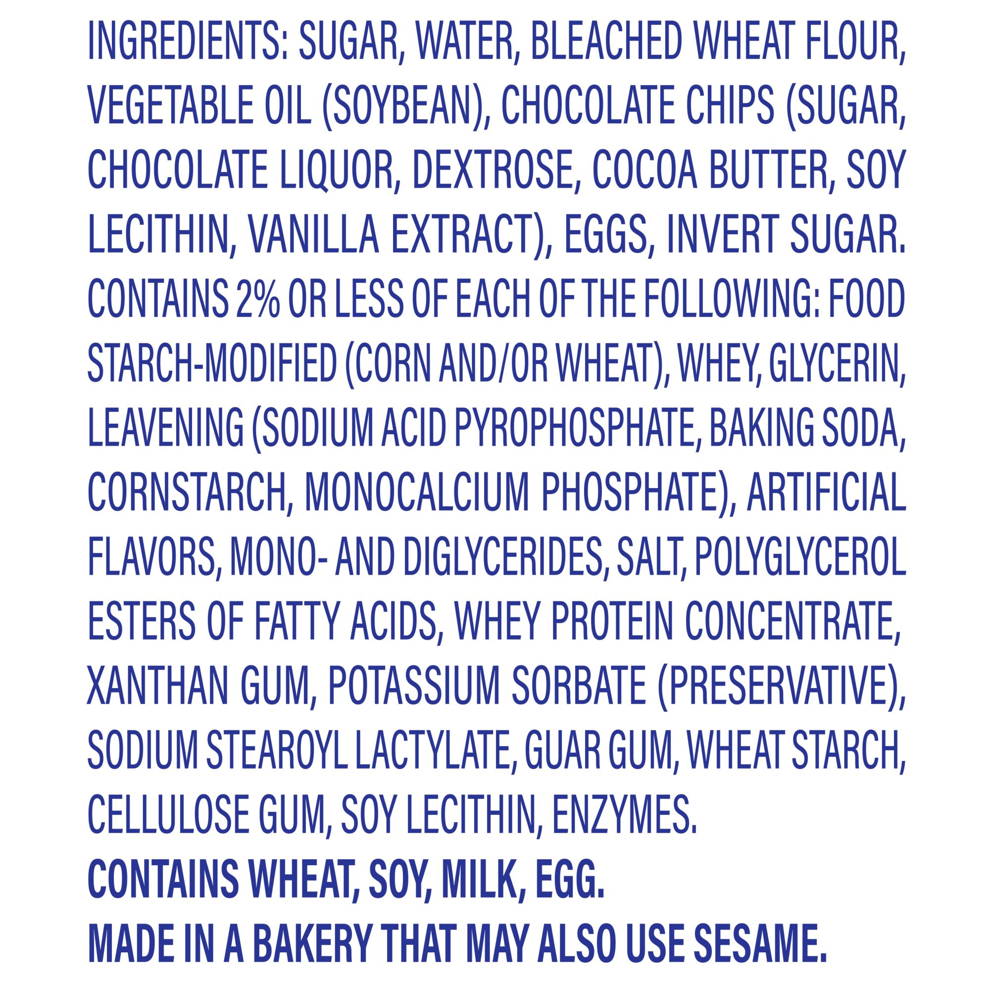 Ingredients: Sugar, Water, Bleached Wheat Flour, Vegetable Oil (Soybean), Chocolate Chips [Sugar, Chocolate Liquor, Dextrose, Cocoa Butter, Soy Lecithin, Vanilla Extract], Eggs, Invert Sugar, Contains 2% Or Less Of Each Of The Following: [Food Starch-Modified (Corn And/Or Wheat), Whey, Glycerin, Leavening [Sodium Acid Pyrophosphate, Baking Soda, Cornstarch, Monocalcium Phosphate], Artificial Flavors, Mono- And Diglycerides, Salt, Polyglycerol Esters Of Fatty Acids, Whey Protein Concentrate, Xanthan Gum, Potassium Sorbate (Preservative), Sodium Stearoyl Lactylate, Guar Gum, Wheat Starch, Cellulose Gum, Soy Lecithin, Enzymes].