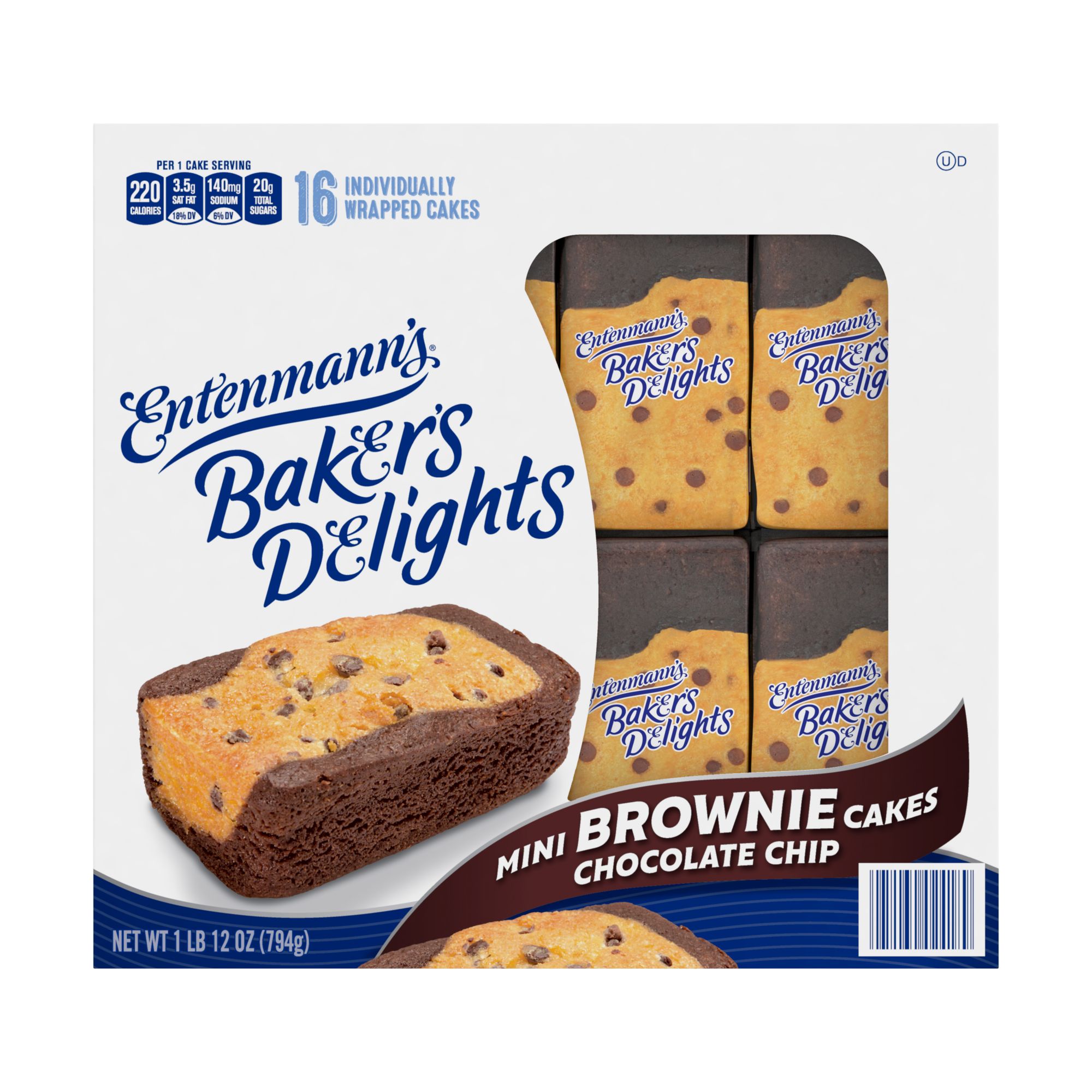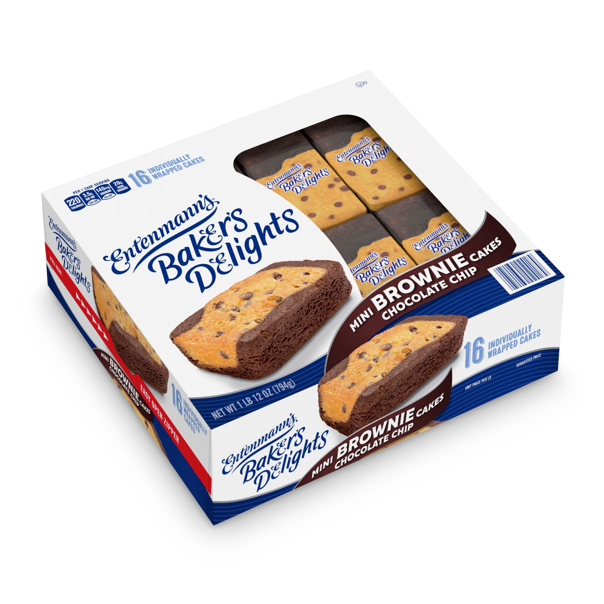 Entenmann's Mini Chocolate Chip Cakes bring together the deliciousness of a soft baked chocolate chip cookie inside a moist fudgy brownie. They are individually wrapped. These cupcakes are the perfect size for a lunchbox surprise, after school treat, a sweet midnight snack, or anytime delicious desert.