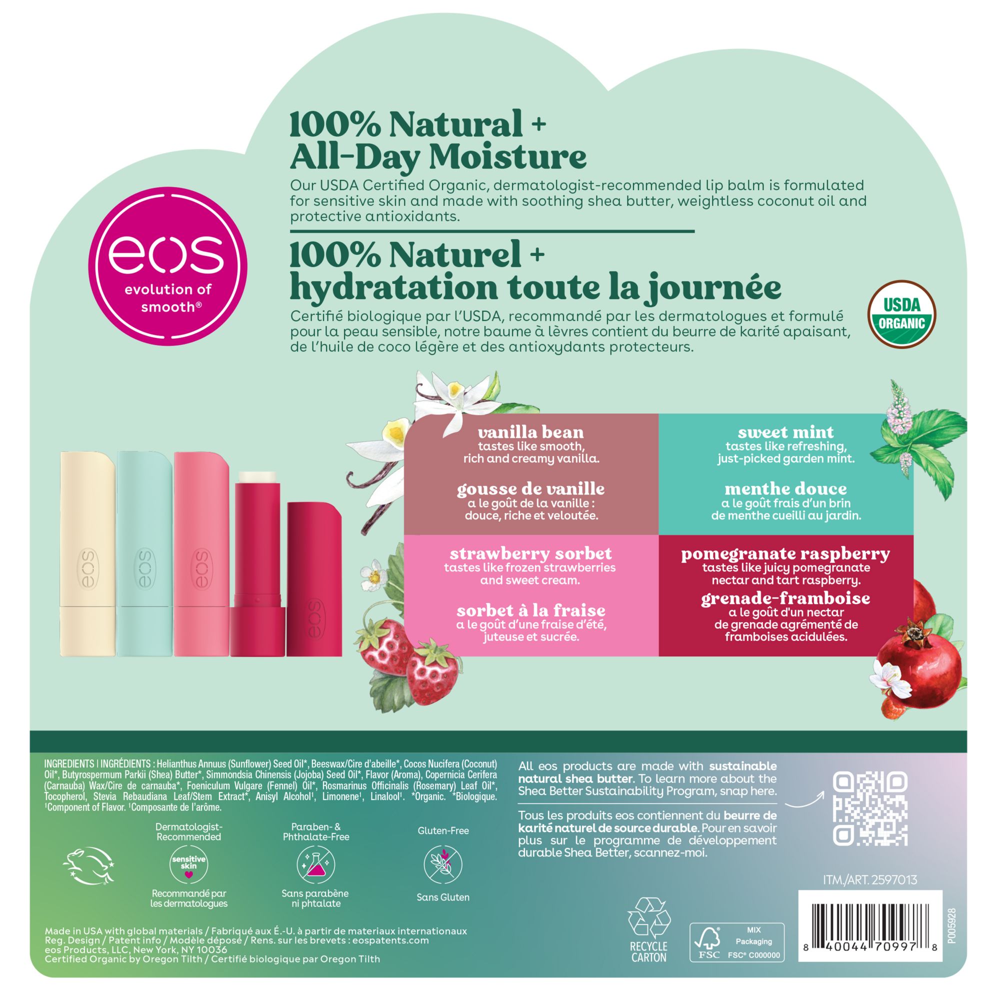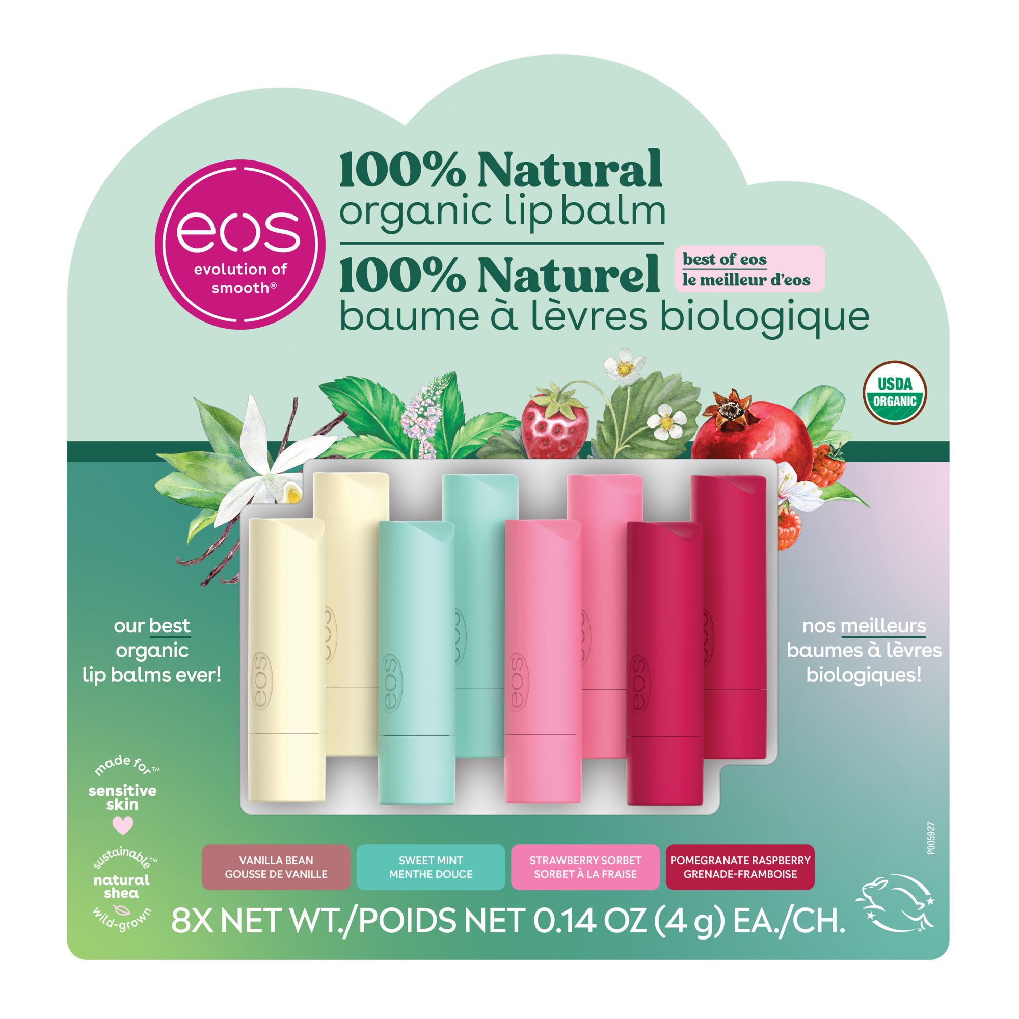 Discover a lip balm that’s 100% natural, organic, and delicious. This eight pack contains Strawberry Sorbet, Sweet Mint, Pomegranate Raspberry, and Vanilla Bean flavors. This USDA Certified Organic, dermatologist-recommended lip balm is formulated for sensitive skin and made with soothing shea butter, weightless coconut oil, and protective antioxidants. eos lip balms use sustainably sourced ingredients that provide all-day moisture and are sure to leave your lips feeling buttery smooth, hydrated, and with a delicious taste all day long.
