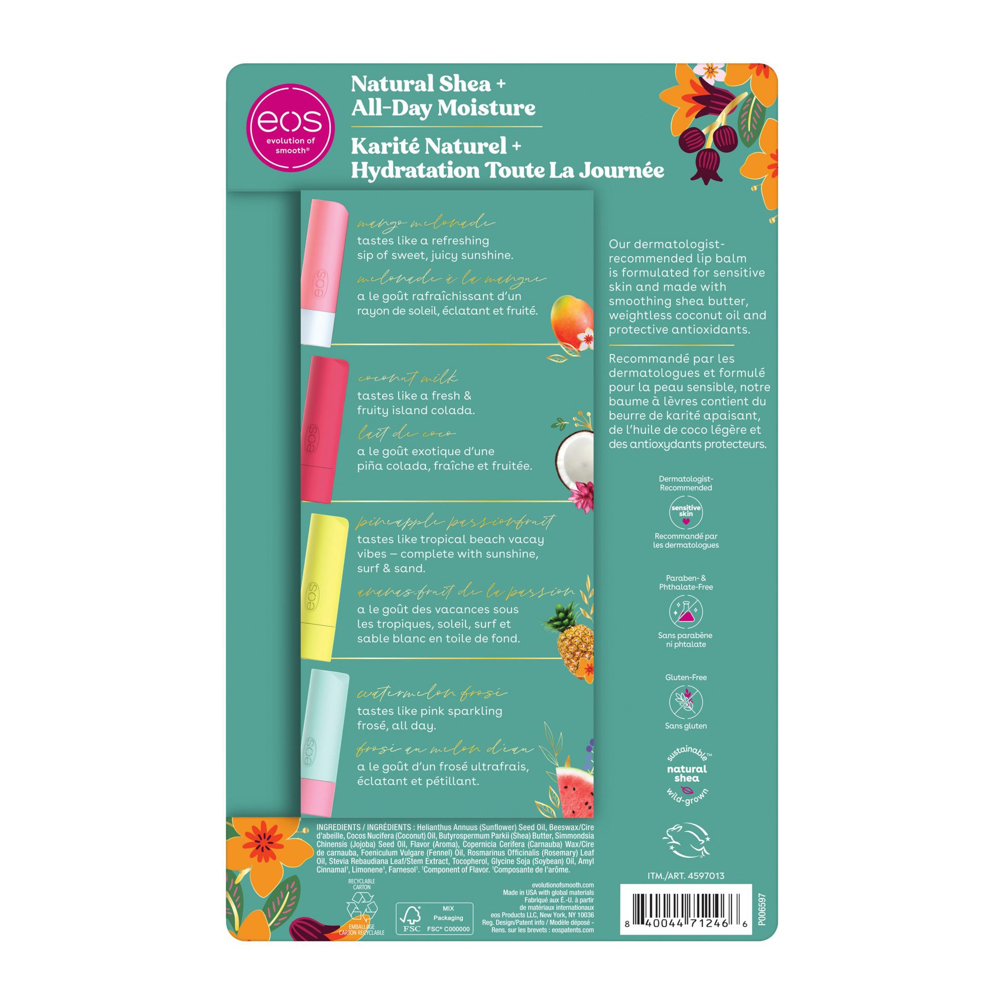 Discover a lip balm that’s natural and delicious. This natural shea, dermatologist-recommended lip balm is formulated for sensitive skin and made with soothing shea butter, weightless coconut oil, and protective antioxidants. Eos lip balms use sustainably sourced ingredients that provide all-day moisture and are sure to leave your lips feeling buttery smooth, hydrated, and with a delicious taste all day long.