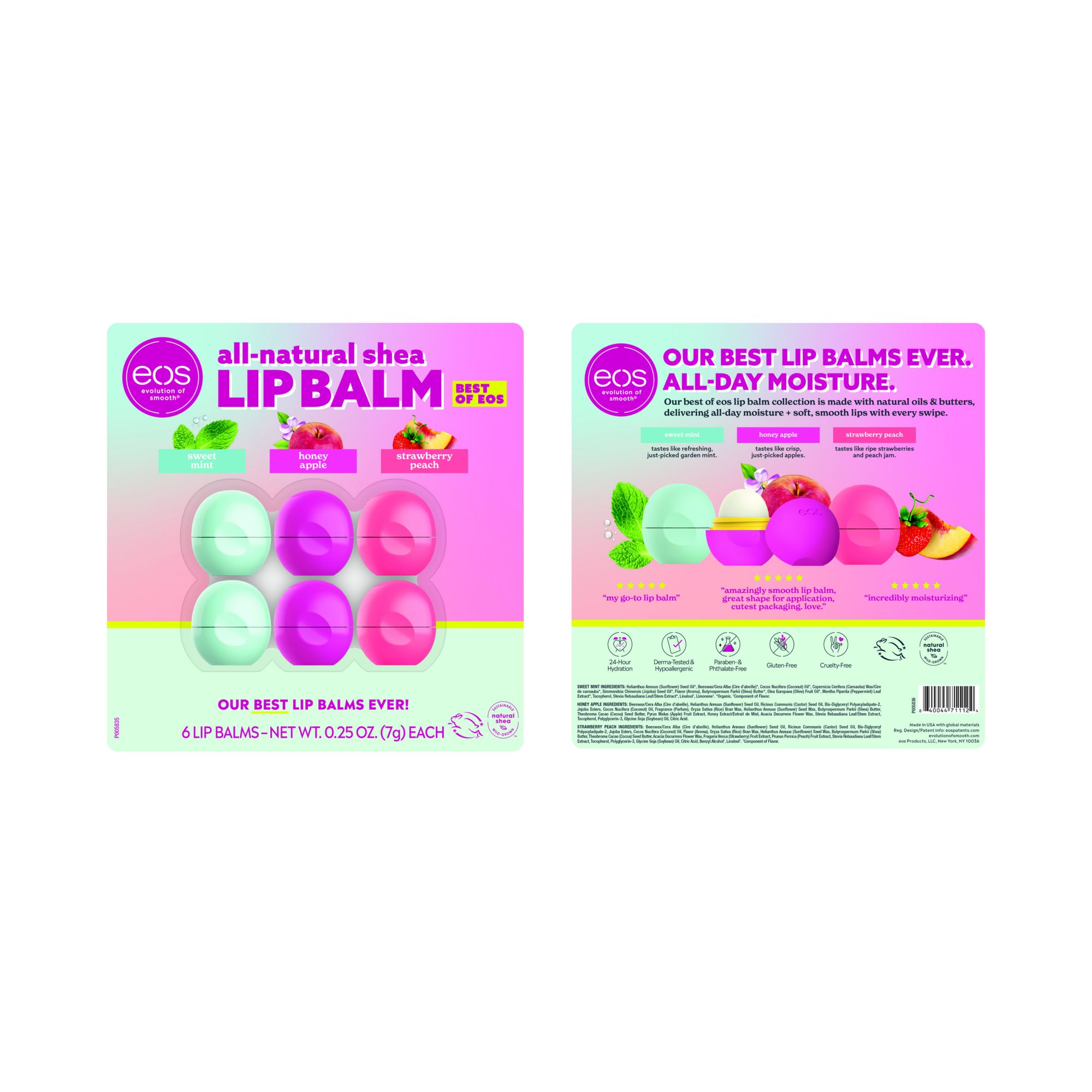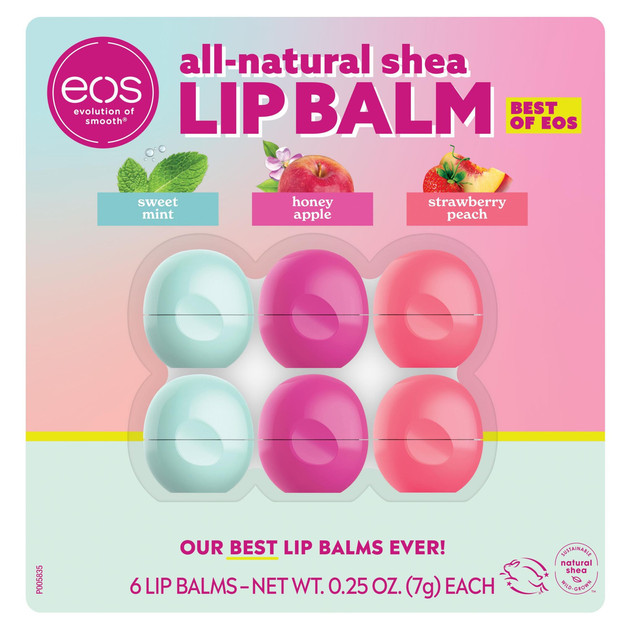 Get ready for fantastic flavor and super shea in one amazing eos lip balm. eos lip balms & moisturizers have blended flavors that are almost good enough to eat with super-moisturizing ingredients for delicious, hydrating lip care products that you’ll want to swipe on again and again. The crisp and fresh Honey Apple flavor tastes like just-picked apples, straight from the orchard. The all-natural Sweet Mint flavor tastes like just-picked mint from the garden — smooth, mellow, and refreshing. The sweet and juicy Strawberry Peach flavor tastes like farmer’s market favorites — ripe red strawberries and homemade peach jam. Plus, the lip balms are crafted with sustainably-sourced shea butter and nourishing coconut + jojoba oils for long-lasting, 24-hour hydration. The favorable lip balms are Dermatologist tested, Hypoallergenic, not tested on animals, paraben and phthalate-free, gluten-free, and the perfect lip experience for you and your loved ones. Get one today.