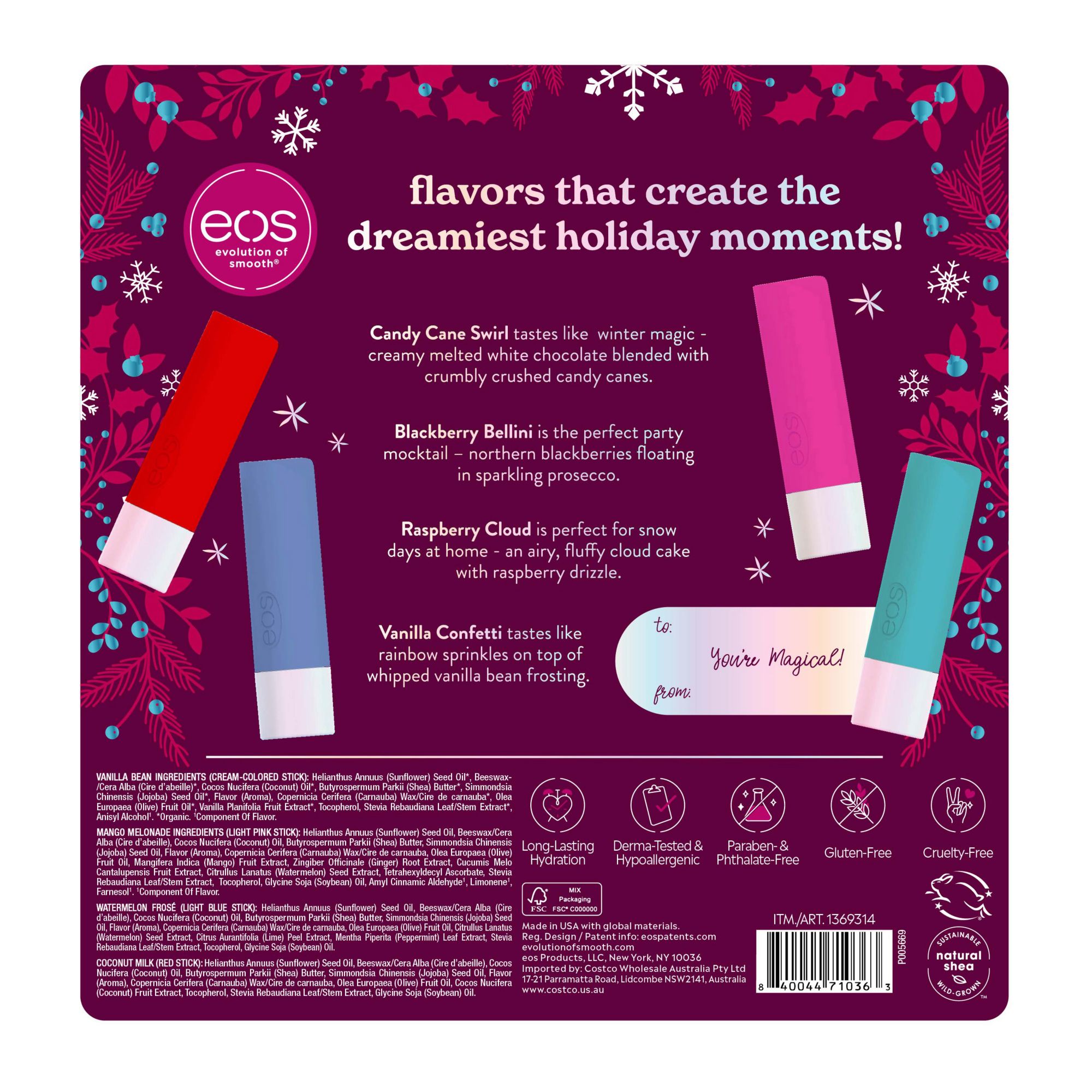 Festive limited-edition flavors meet super soft shea, for cheerful lip balms you’ll want to share. It’s the most awesome time of the year! eos Limited Edition Holiday Lip Balm Collection has long-lasting hydration, deeply hydrates and seals in moisture, and contains sustainably-sourced ingredients. Candy Cane Swirl is a true holiday treat - creamy melted white chocolate blended with crumbly crushed candy canes. Blackberry Bellini makes for a magical holiday brunch mocktail – frozen blackberries in fizzy prosecco. Raspberry Cloud gives off snow day vibes - airy, fluffy cloud cake, meringue frosting and sweet raspberry drizzle. Vanilla Confetti is fun and festive, like a spoonful of holiday party cupcake frosting straight from the bowl – bursting with rainbow sprinkles! Too-good-to-be-true flavors meet super hydration for a delicious balm you want to swipe again and again. We make our eos lip balms with sustainably-sourced shea butter, and nourishing coconut and jojoba oils for 24-hour hydration. We are paraben, phthalate and gluten free. PETA certified. No products tested on animals.