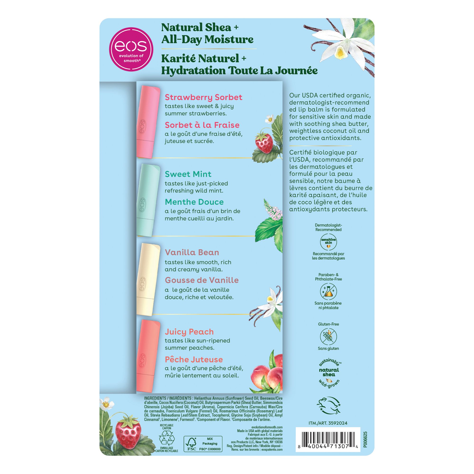 Discover a lip balm that’s 100% natural, organic, and delicious. This USDA Certified Organic, dermatologist-recommended lip balm is formulated for sensitive skin and made with soothing shea butter, weightless coconut oil, and protective antioxidants. Eos lip balms use sustainably sourced ingredients that provide all-day moisture and are sure to leave your lips feeling buttery smooth, hydrated, and with a delicious taste all day long.
